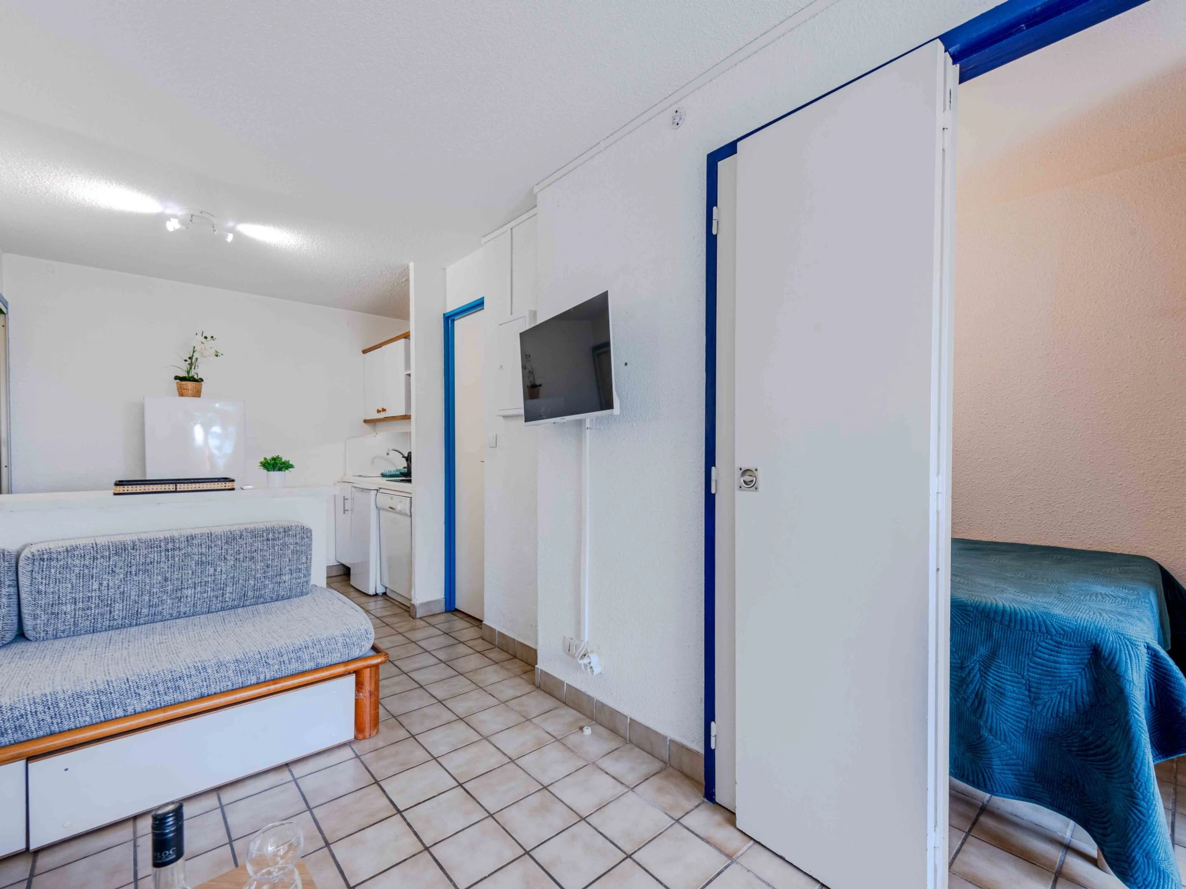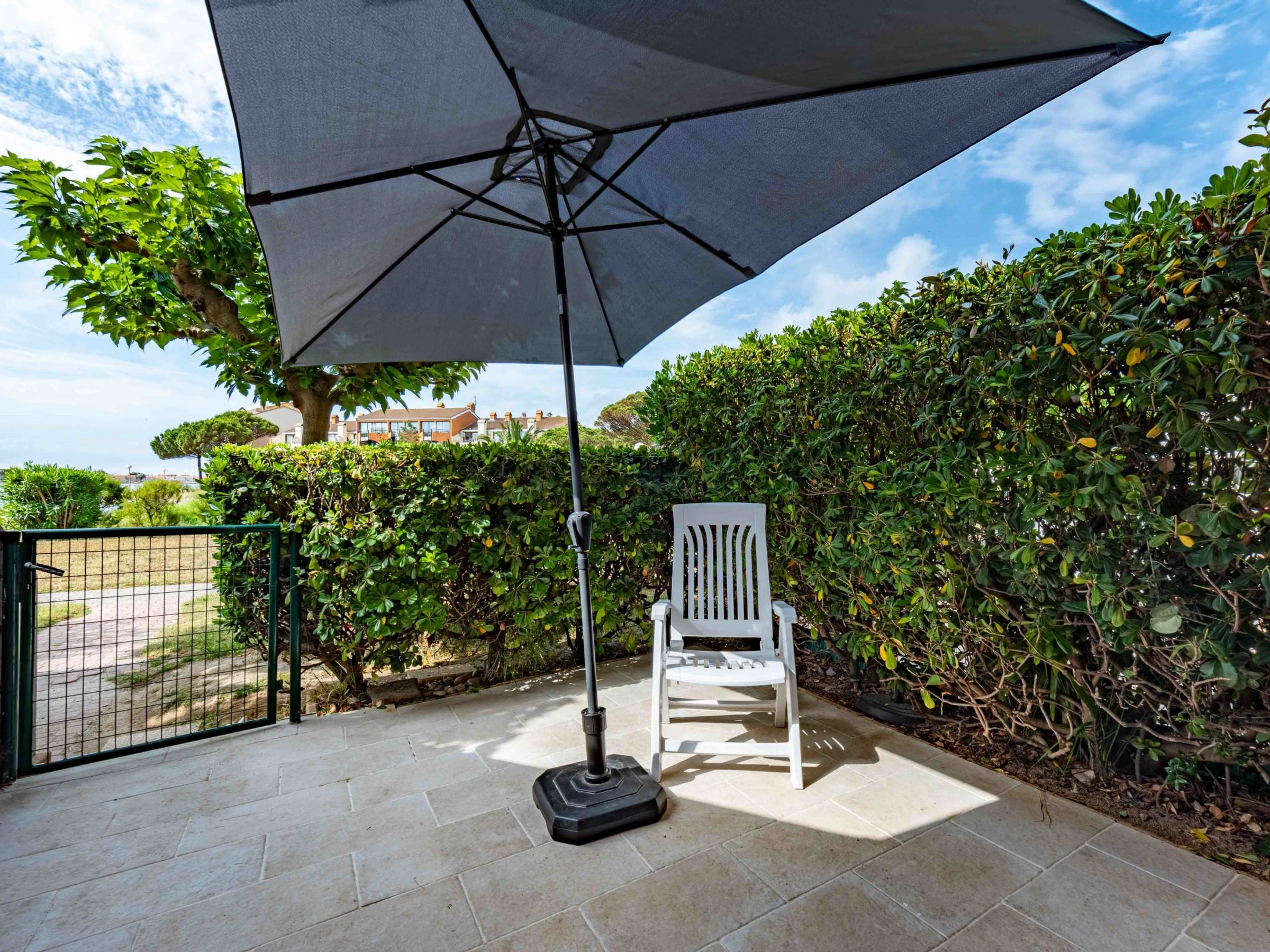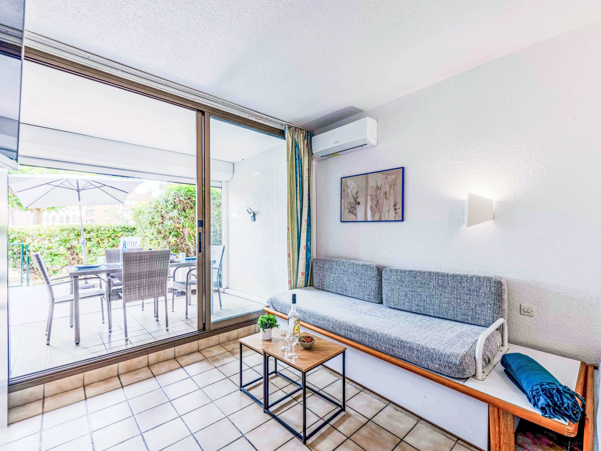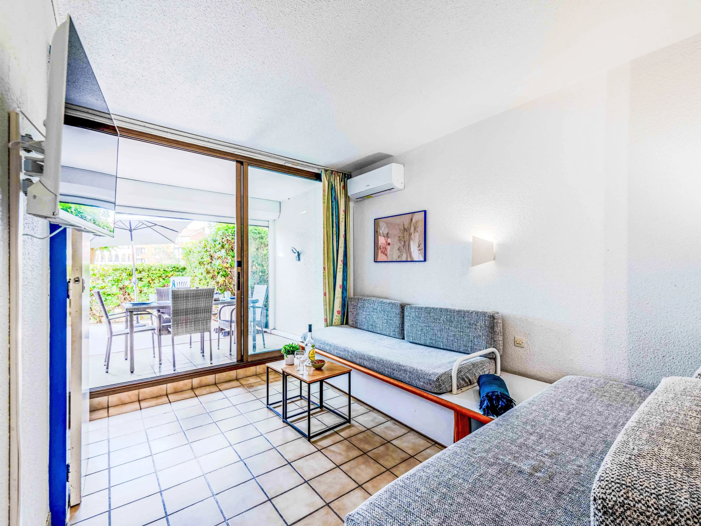 Apt 2 pièces 23 m2, au rez-de-chaussée, situation nord-est. Séjour/salle à manger avec 1 divan-lit (70 cm, longueur 190 cm), 1 lit gigogne (2 pers. 2 x 70 cm, longueur 190 cm), TV (écran plat). Sortie sur la terrasse. 1 chambre avec 1 grand-lit (1 x 140 cm, longueur 190 cm). Coin cuisine (4 plaques de cuisson, mini-four, lave-vaisselle, micro-ondes, cafetière électrique). Bain/WC. Air-conditionné. Terrasse 7 m2. Meubles de terrasse. Vue sur le jardin et le canal. A disposition: lave-linge. Internet (Connexion WIFI, en sus). Veuillez noter: détecteur de fumée. Annonce d'un particulier (art 155, IV du CGI).