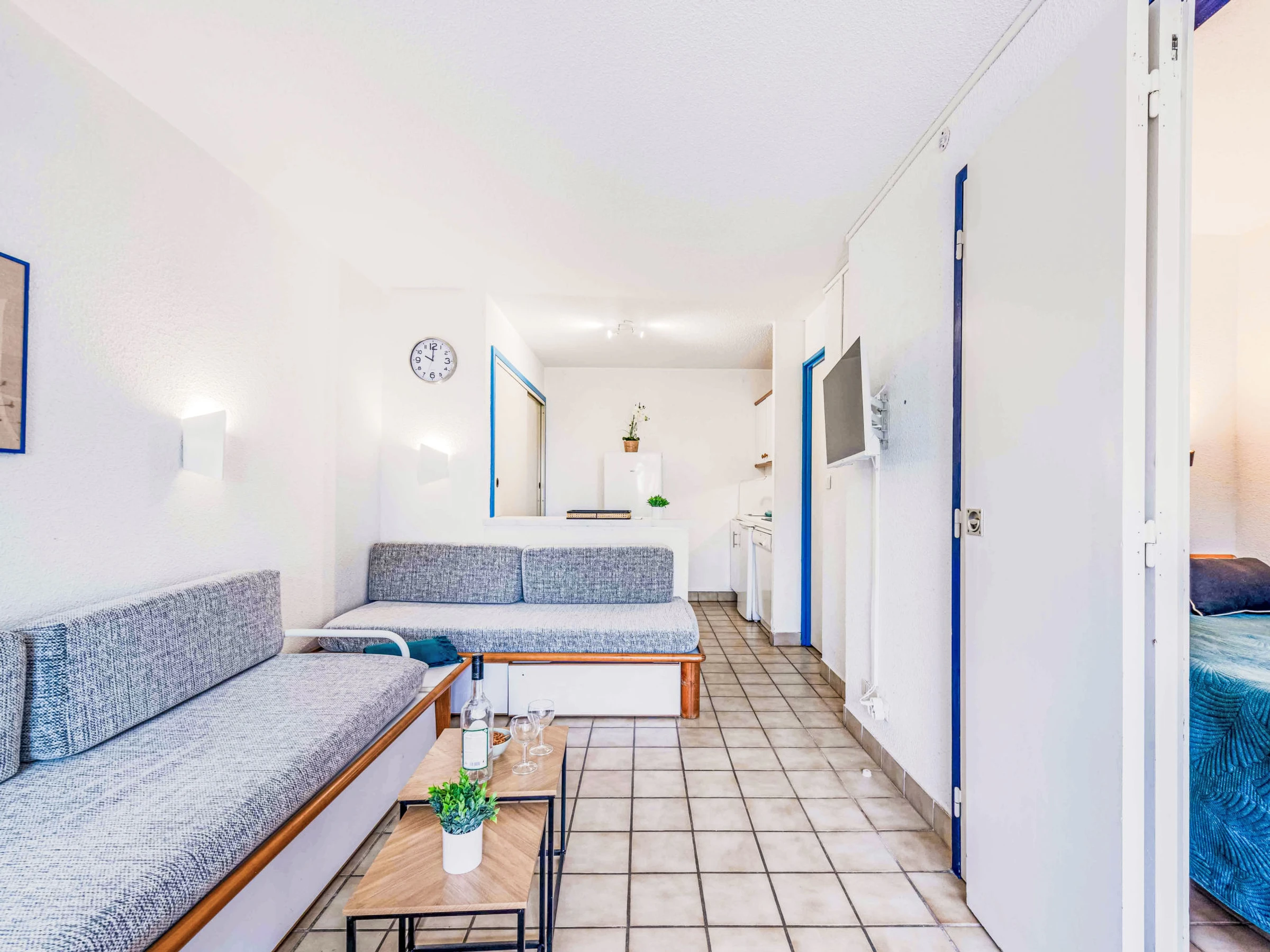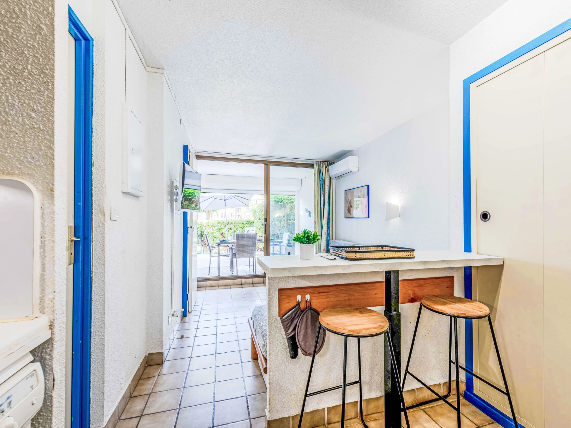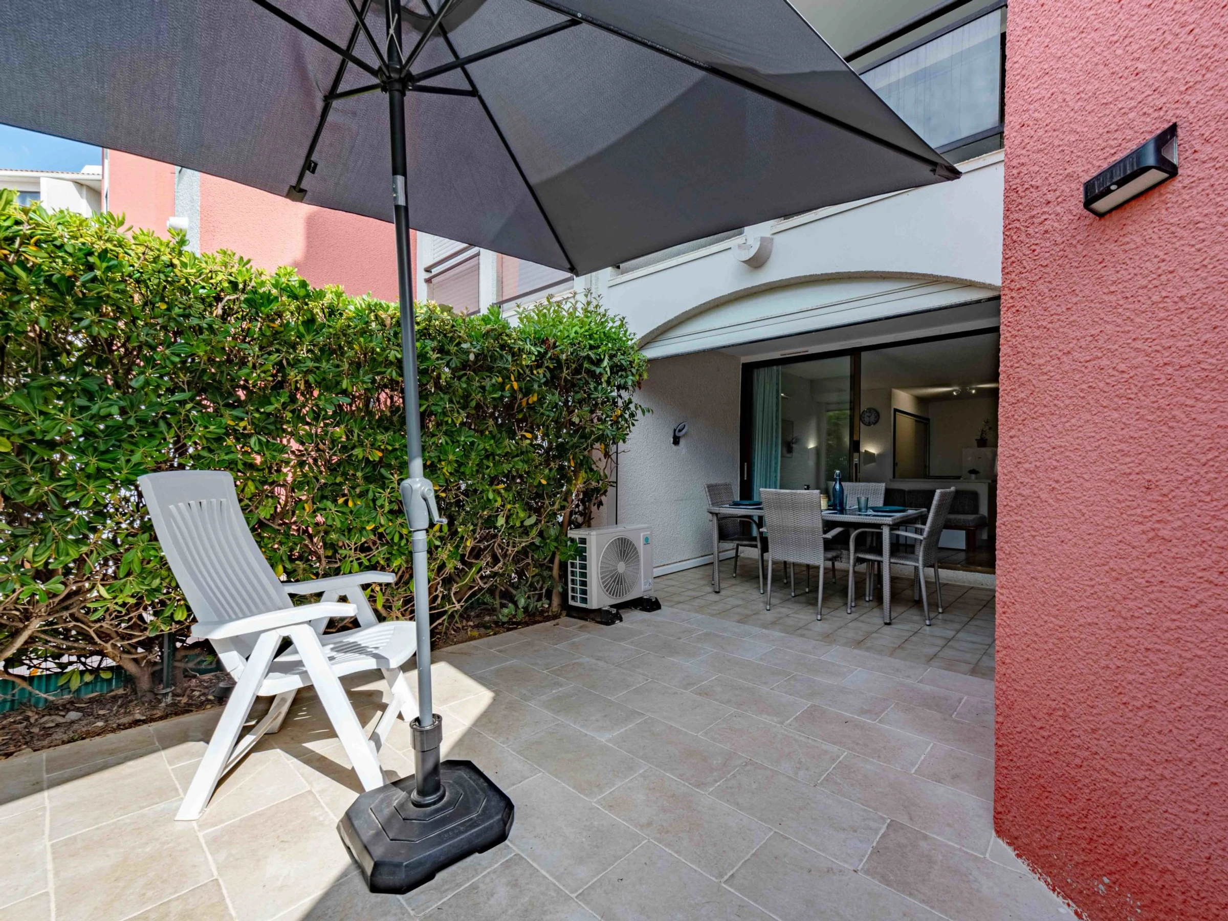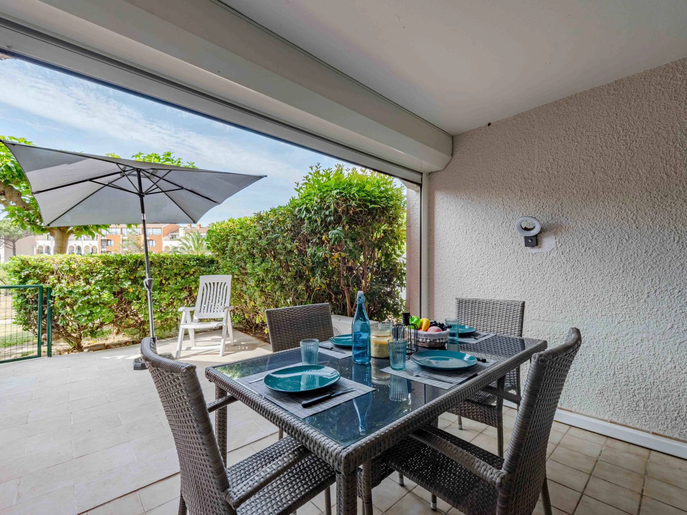 Apt 2 pièces 23 m2, au rez-de-chaussée, situation nord-est. Séjour/salle à manger avec 1 divan-lit (70 cm, longueur 190 cm), 1 lit gigogne (2 pers. 2 x 70 cm, longueur 190 cm), TV (écran plat). Sortie sur la terrasse. 1 chambre avec 1 grand-lit (1 x 140 cm, longueur 190 cm). Coin cuisine (4 plaques de cuisson, mini-four, lave-vaisselle, micro-ondes, cafetière électrique). Bain/WC. Air-conditionné. Terrasse 7 m2. Meubles de terrasse. Vue sur le jardin et le canal. A disposition: lave-linge. Internet (Connexion WIFI, en sus). Veuillez noter: détecteur de fumée. Annonce d'un particulier (art 155, IV du CGI).