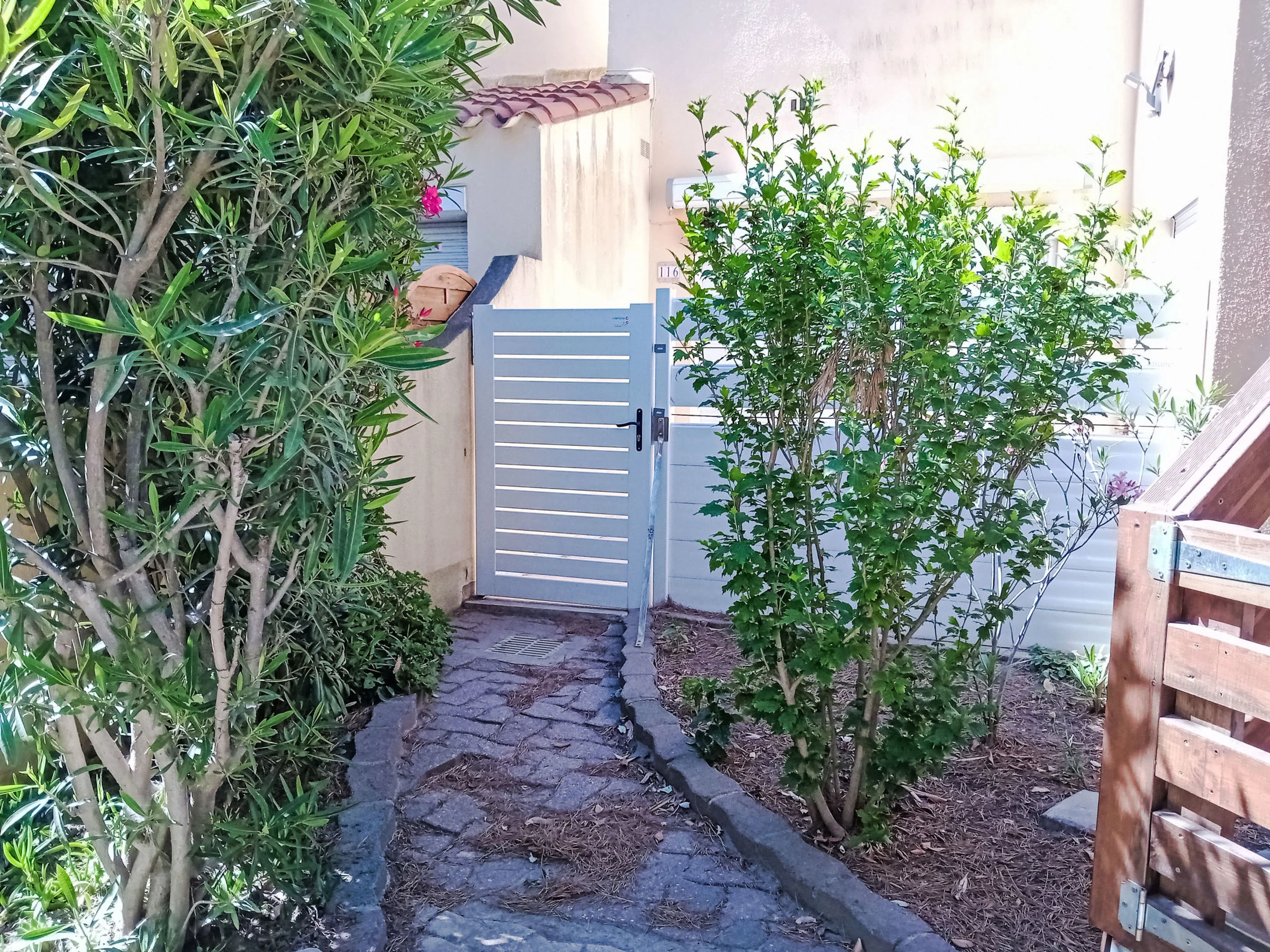 Apt 2 pièces 29 m2, au rez-de-chaussée. Aménagement simple: séjour/salle à manger avec 1 divan-lit double (140 cm, longueur 190 cm), TV (écran plat), ventilateur. Sortie sur la terrasse. 1 chambre avec 1 grand-lit (140 cm, longueur 190 cm), ventilateur. Sortie sur la terrasse. Coin cuisine (mini-four, 4 plaques vitrocéramiques, grille-pain, micro-ondes, congélateur, cafetière électrique). Douche/WC. Chauffage électrique. Terrasse 15 m2. Meubles de terrasse. A disposition: lave-linge. Internet (Connexion WIFI, en sus). Place de parking No 116. Veuillez noter: détecteur de fumée. [hidden]
