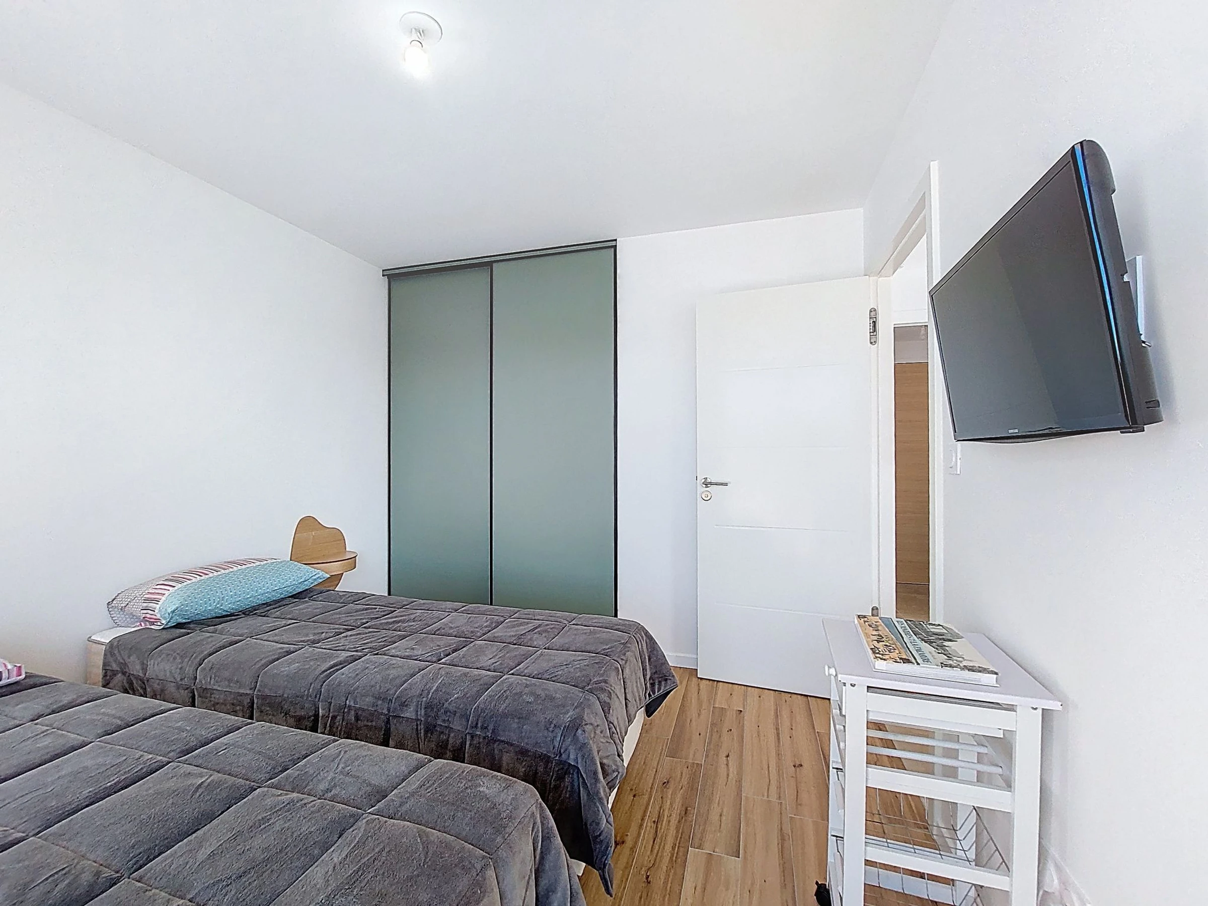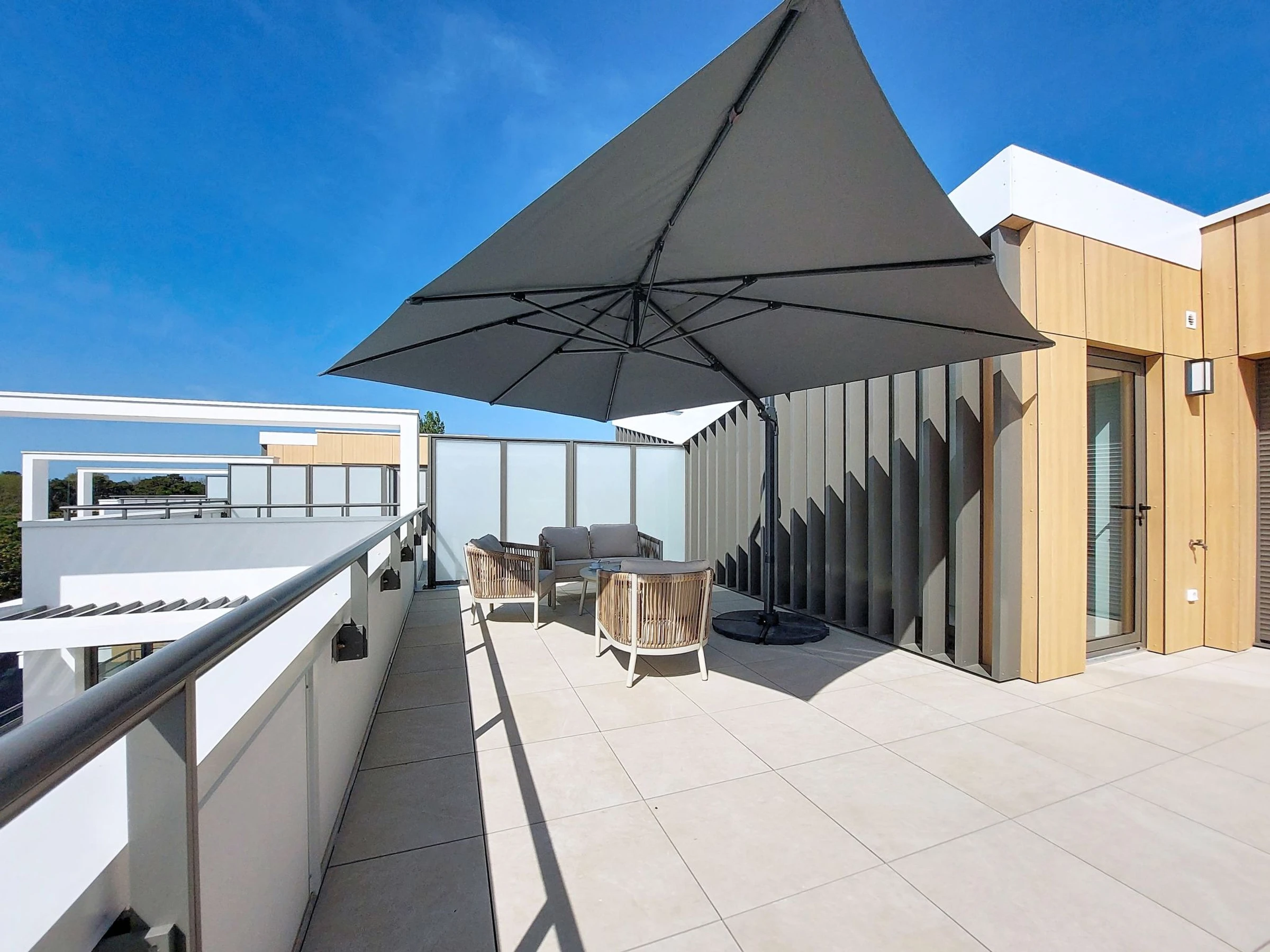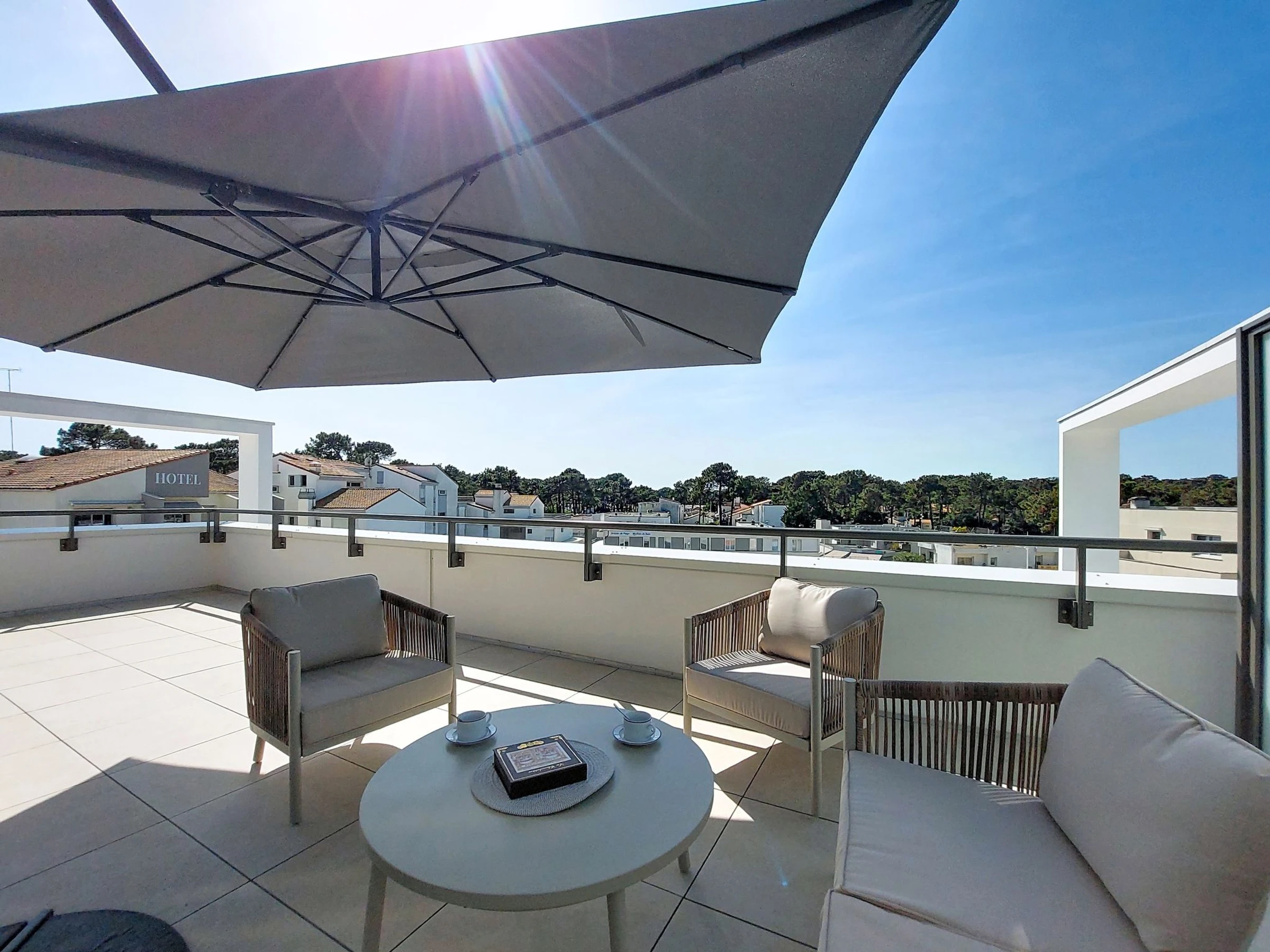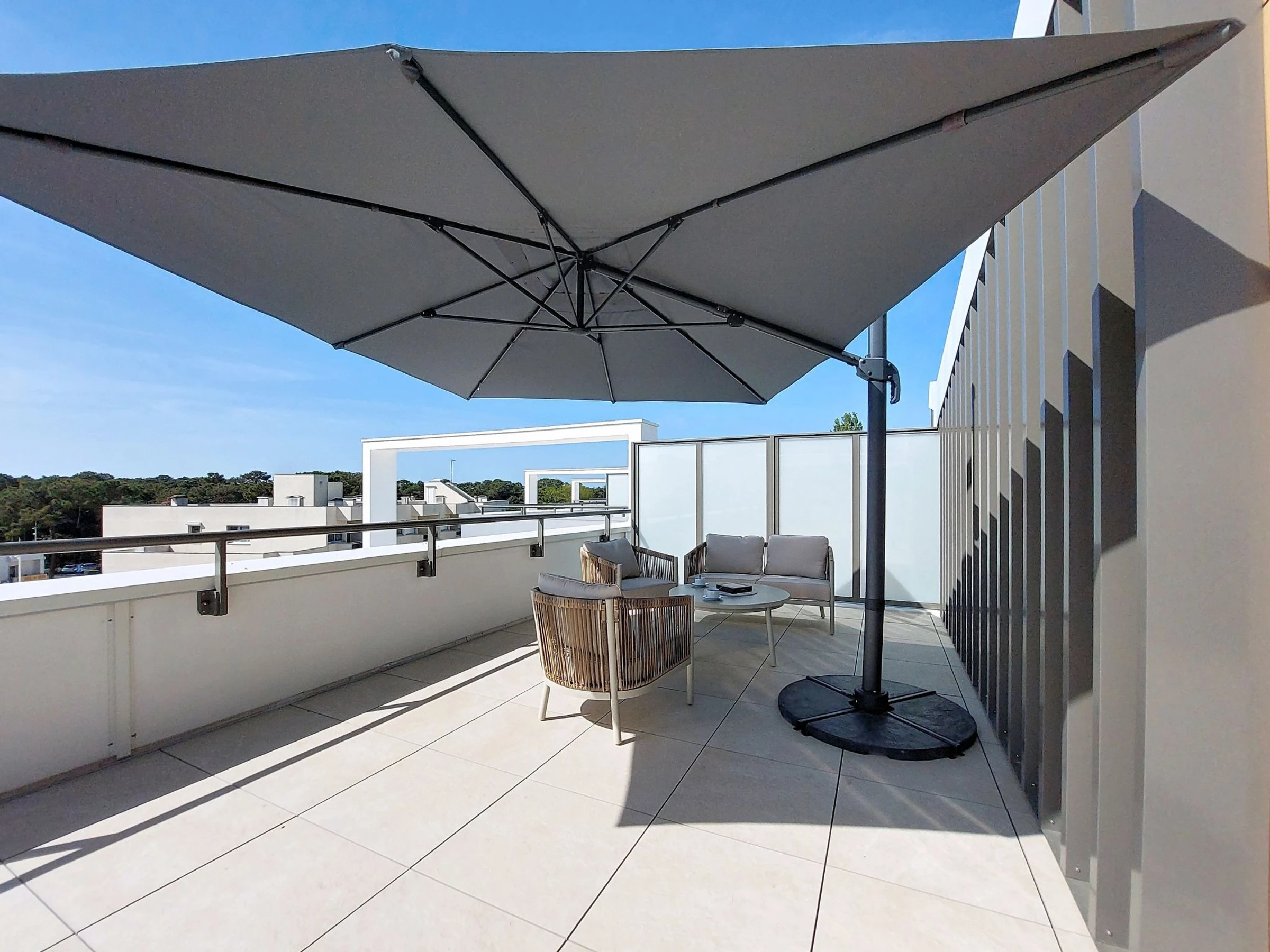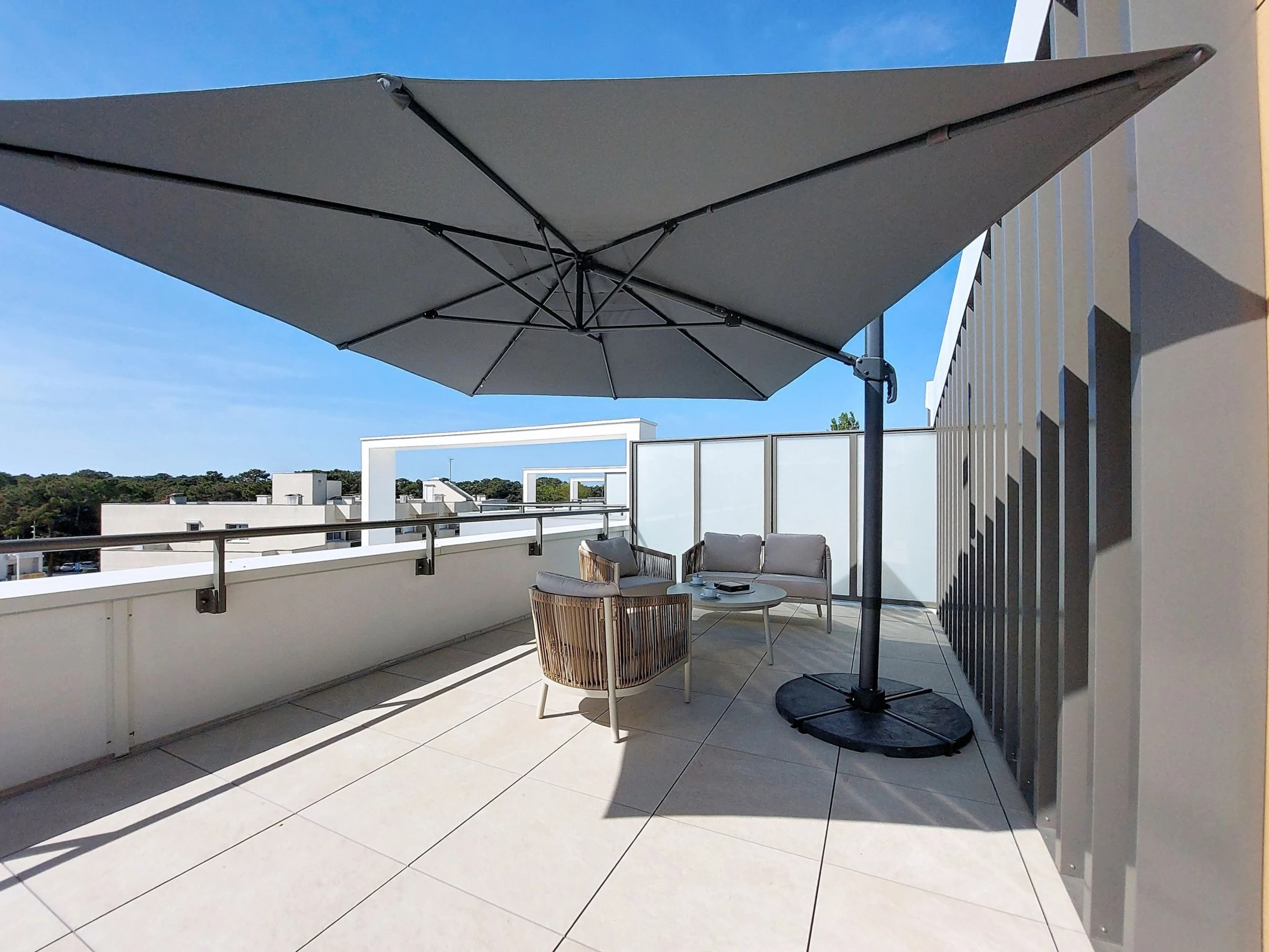 Appartement sur 2 niveaux 4 pièces 96 m2 au 3ème étage, situation sud-ouest. Aménagement confortable et moderne: séjour/salle à manger avec TV (écran plat), air-conditionné. Sortie sur le balcon. 1 chambre avec 1 grand-lit (1 x 160 cm, longueur 190 cm), TV (écran plat). Sortie sur le balcon. 1 chambre avec 2 lits (90 cm, longueur 190 cm), TV (écran plat). Cuisine ouverte (four, 3 plaques vitrocéramiques, grille-pain, bouilloire électrique, micro-ondes, congélateur, cafetière électrique, Capsules pour machine à café (Senseo) (NON INCLUSES)). Douche, WC séparé. Air-conditionné, chauffage par le sol. À l'étage supérieur: 1 chambre avec 1 grand-lit (1 x 140 cm, longueur 190 cm), douche/WC, double vasque et TV (écran plat). Sortie sur la terrasse. Grand balcon 15 m2, situation sud et situation ouest. A disposition: lave-linge, fer à repasser, sèche-cheveux. Internet (Connexion WIFI, gratuit). Garage No 3 (1 Voiture), hauteur 201 cm, largeur 241 cm. Veuillez noter: détecteur de fumée. Annonce d'un particulier (art 155, IV du CGI).
