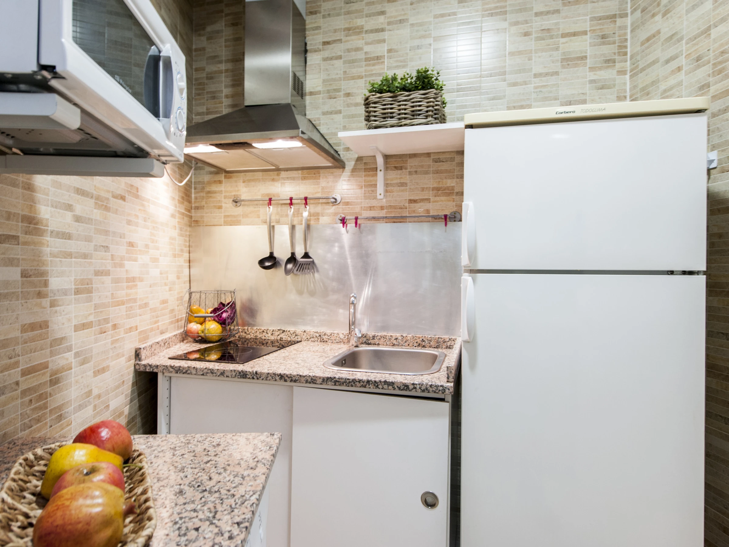 La cuisine indépendante, à vitrocéramique, est équipée avec réfrigérateur, micro-ondes et cafetière.