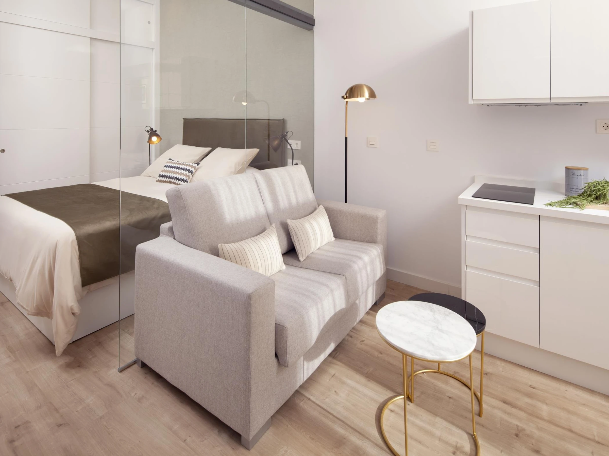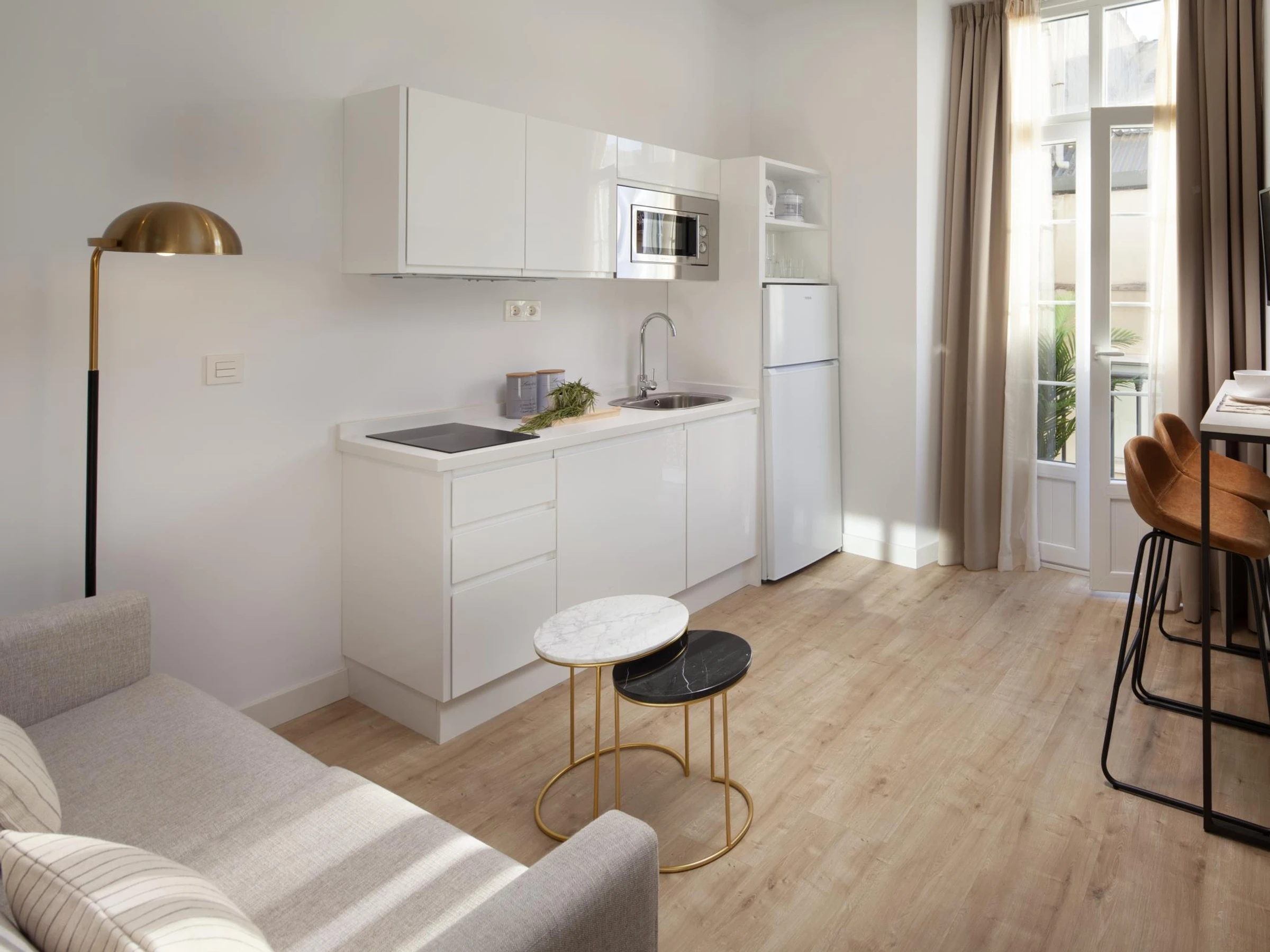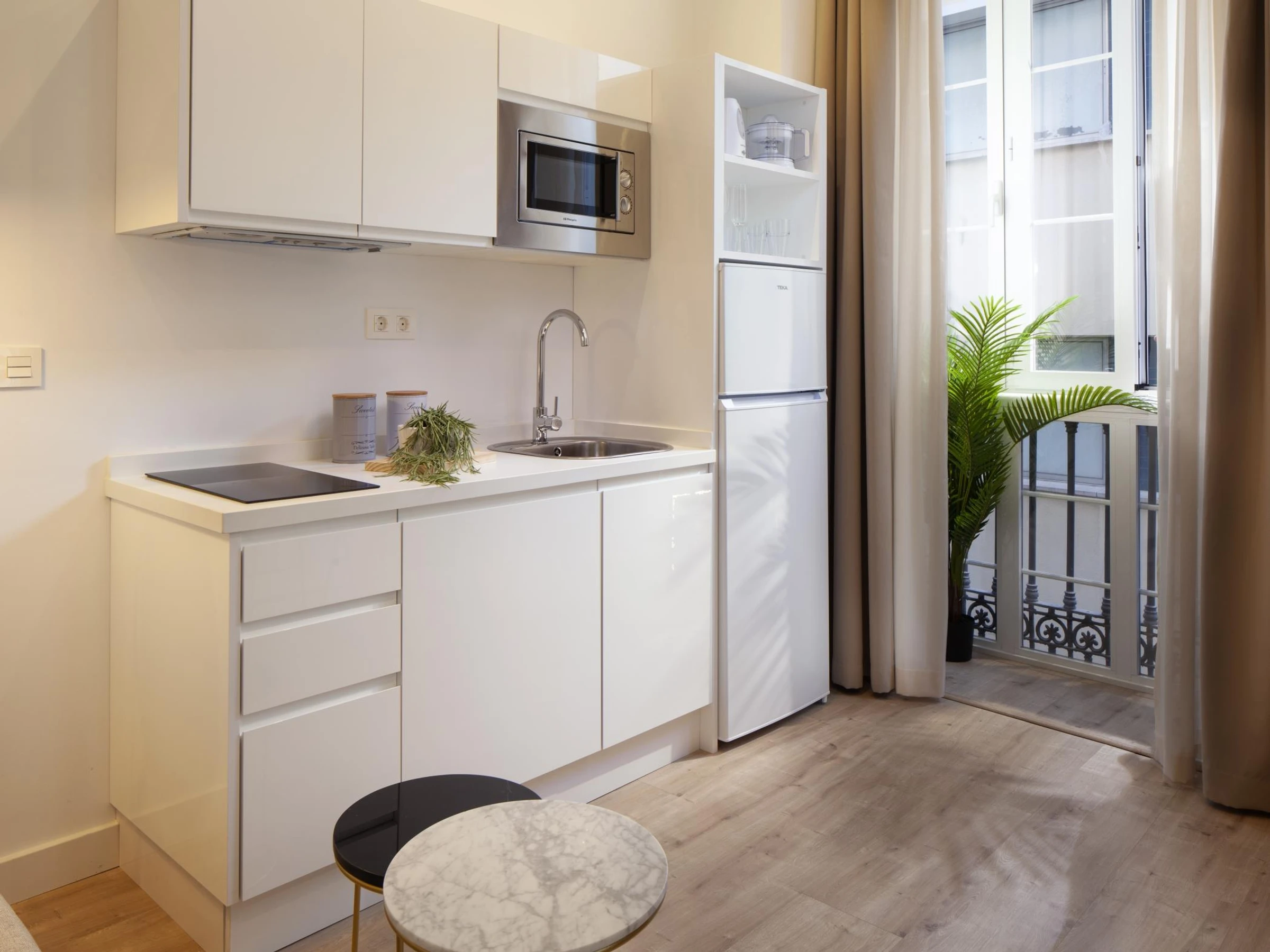 INMálaga Kora-1, dispose d'une chambre avec un lit double, d'une salle de bain avec douche et d'une cuisine américaine ouverte sur le salon et équipée d'un réfrigérateur, plaque à induction 2 feux, micro-ondes, cafetière, bouilloire, grille-pain, lave-linge, fer à repasser , table à repasser, sèche-cheveux, vaisselle, verres, verres à vin, verres à champagne, ustensiles de cuisine, casserole, poêle à frire etc ... L'appartement offre tout le confort pour passer et profiter d'un séjour agréable et inoubliable.