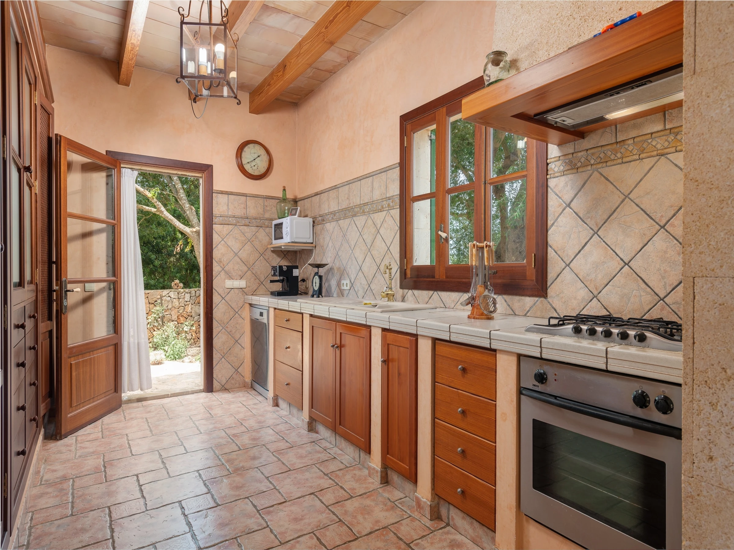 La cuisine, est équipée avec réfrigérateur, micro-ondes, four, lave-vaisselle et cafetière.
