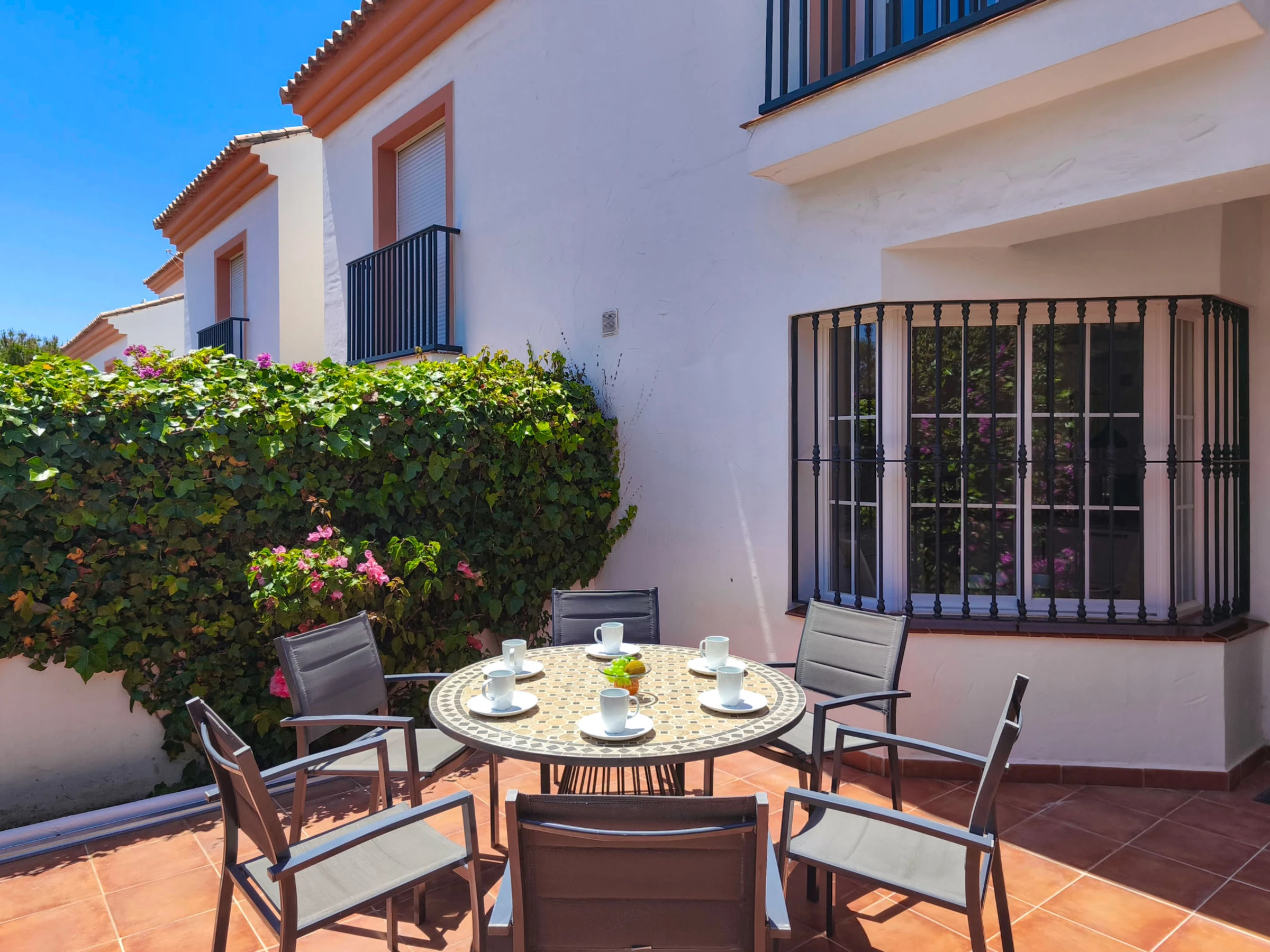 Maison mitoyenne 4 pièces 157 m2 sur 2 niveaux. Partiellement rénovée en 2025, aménagement confortable et agréable: séjour/salle à manger avec TV (satellite), Télévision numérique et chaîne stéréo. Sortie sur le jardinet. Cuisine (four, lave-vaisselle, 4 plaques à induction, micro-ondes, congélateur). WC séparé. Chauffage électrique, air-conditionné, chauffage à air chaud, chauffe eau (200 litres). À l'étage supérieur: 1 chambre avec 2 lits. 1 chambre avec 1 grand-lit. 1 chambre avec 1 grand-lit et douche/WC (privé). Bain/bidet/WC. Terrasse. Barbecue, chaises longues (2). Vue sur les montagnes et Terrain de golf. A disposition: lave-linge, sèche-linge, chaise haute pour enfant, lit bébé. Internet (Connexion WIFI, gratuit). Garage No 56. Veuillez noter: maison non-fumeur. [hidden] // Reg. Nr.: ESFCTU0000290280003527880000000000000000VUT/MA/967230