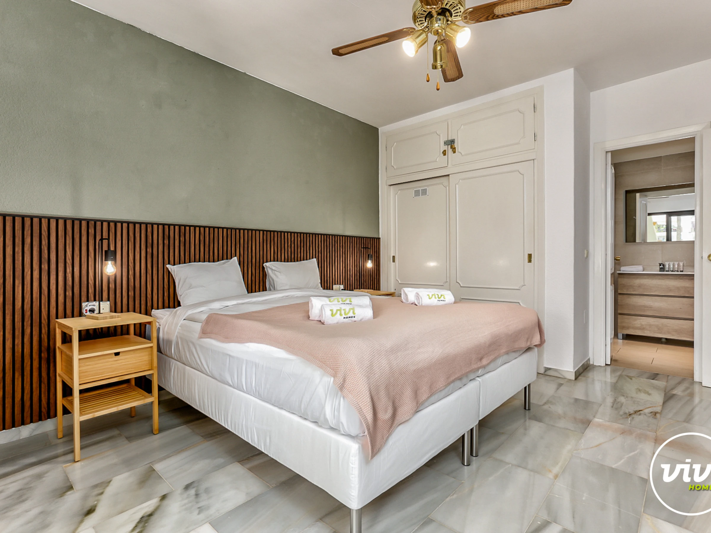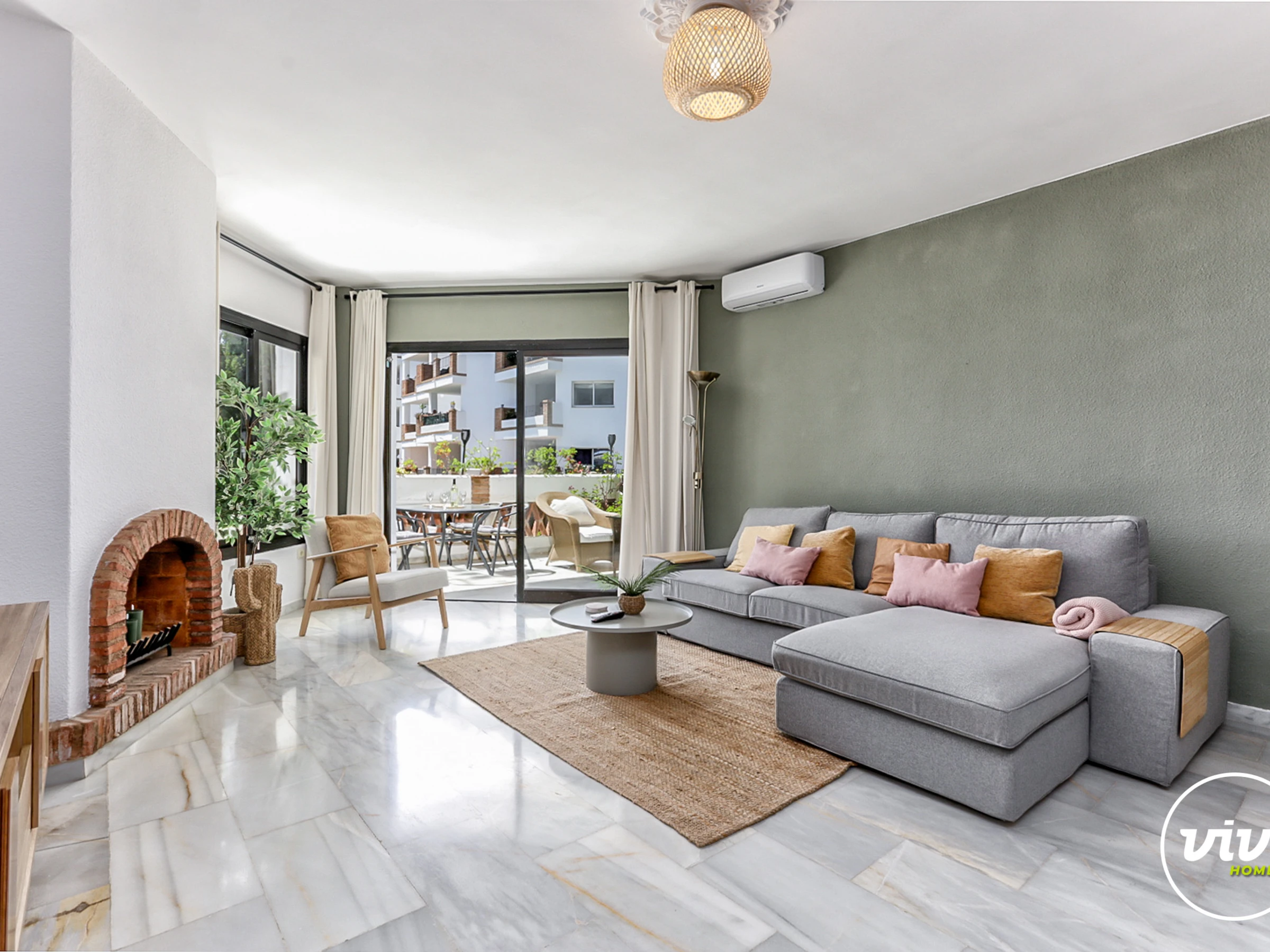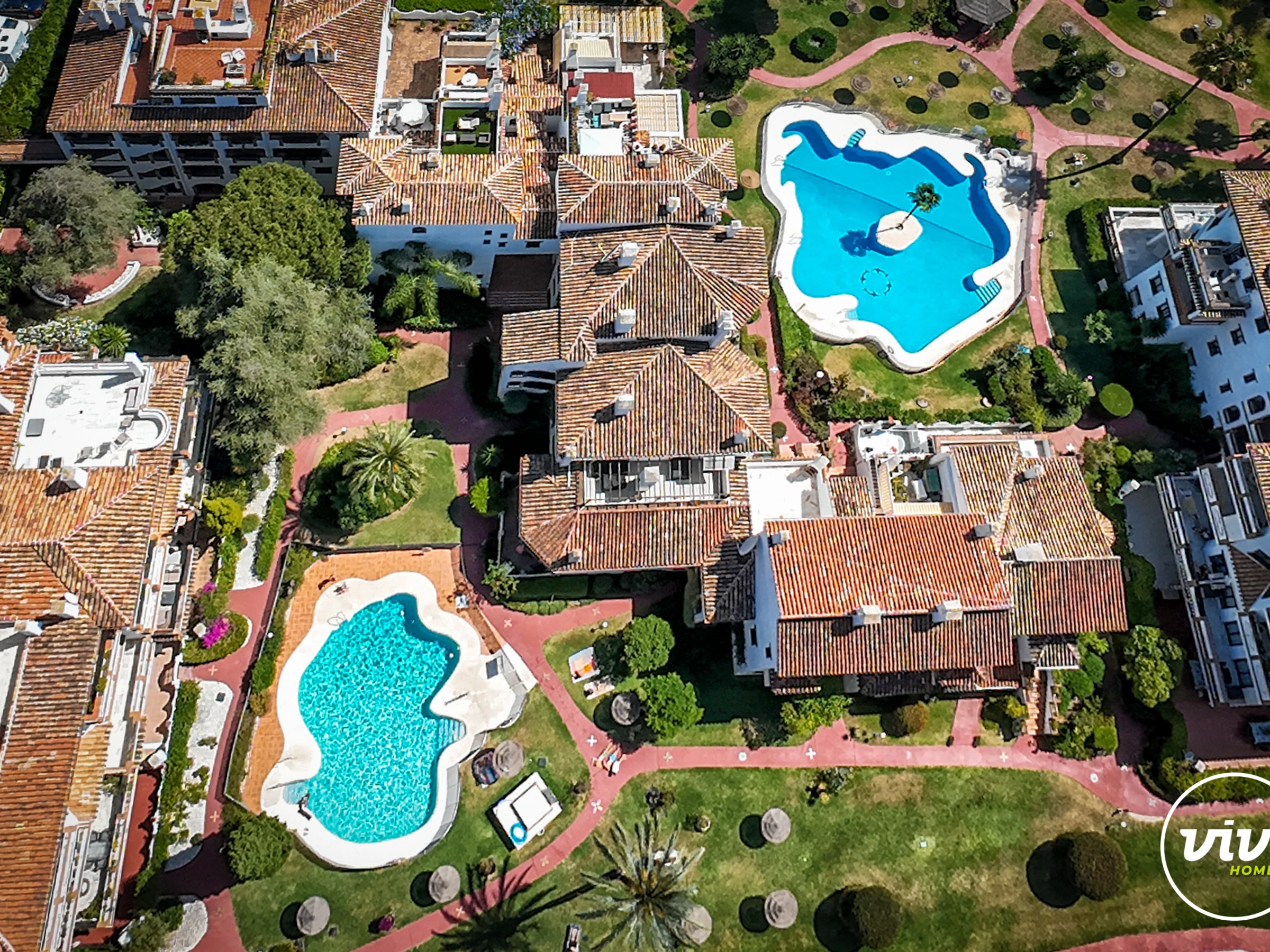 Logement de 80 m² meublé avec goût et totalement équipé, situé en front de plage, avec vue sur le jardin et la piscine.