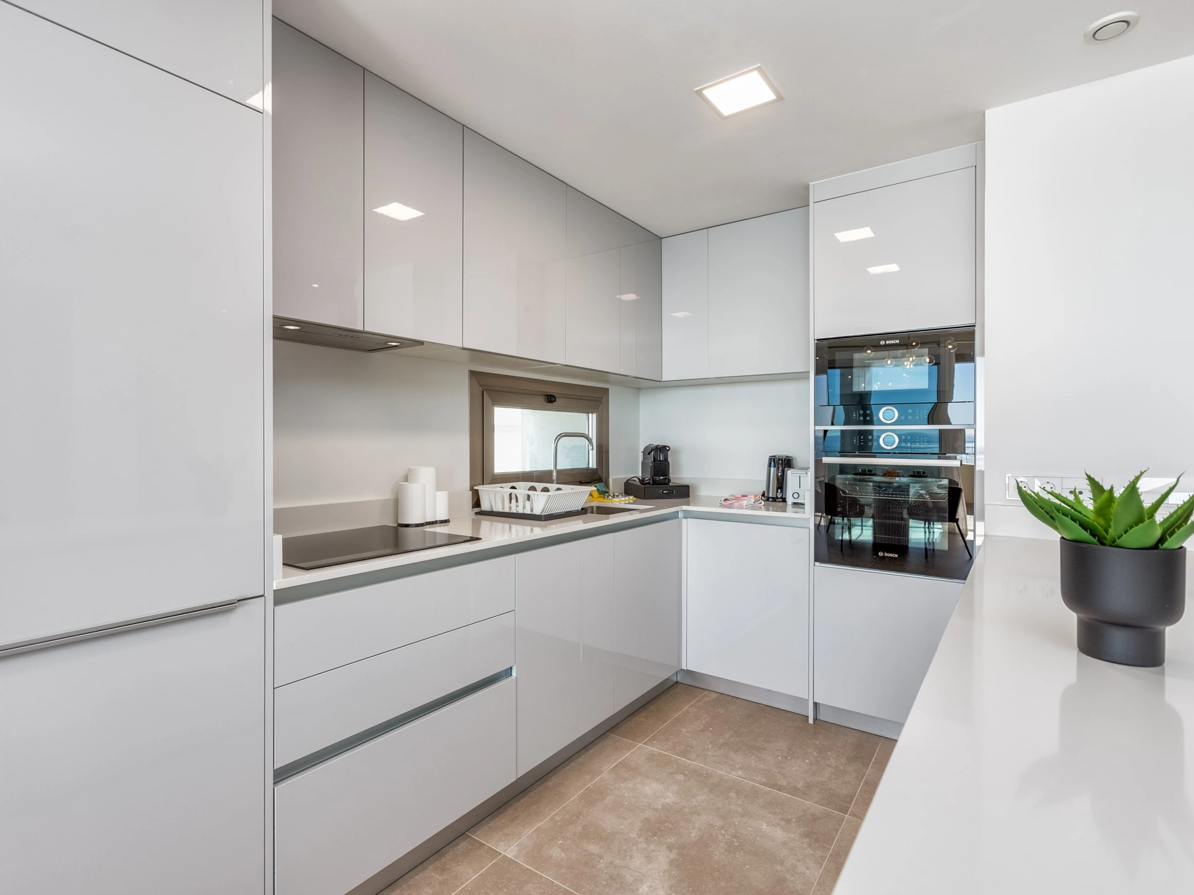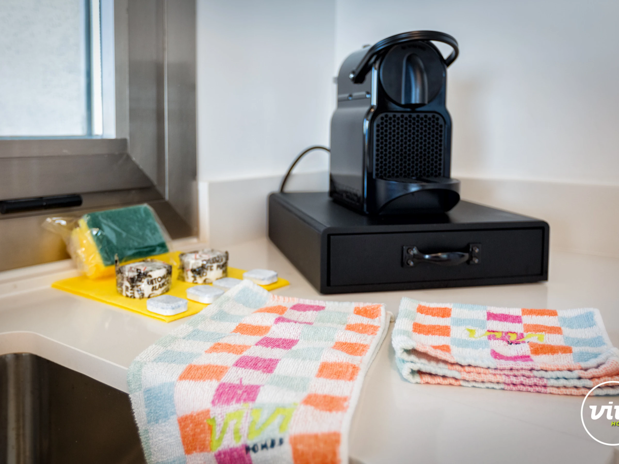 La cuisine américaine, à induction, est équipée avec réfrigérateur, micro-ondes, four, congélateur, lave-vaisselle, vaisselle/couverts, ustensiles/cuisine, cafetière, grille pain, bouilloire, equipement de cuisine, assiettes et bols.