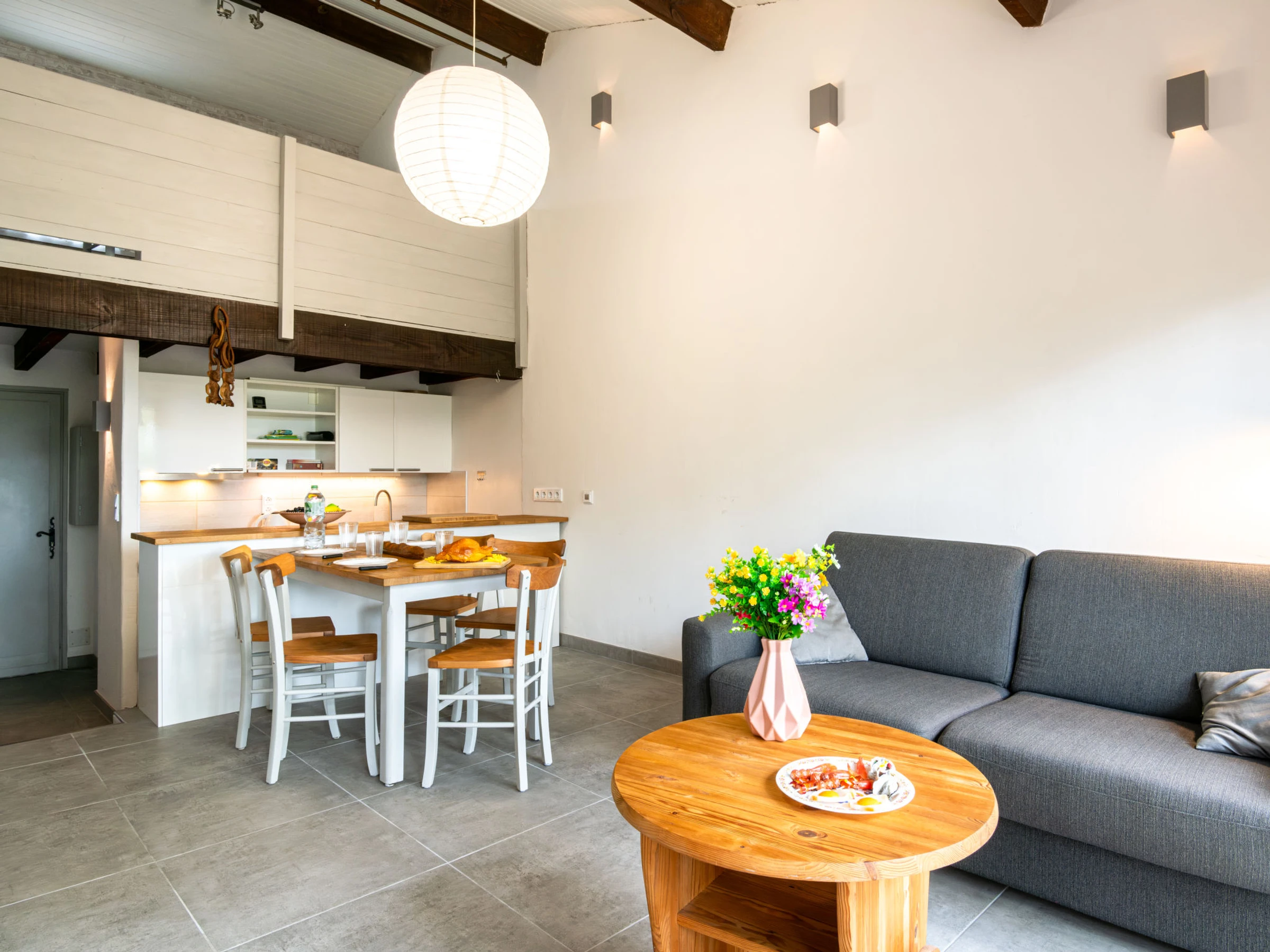 "Mimosas", apt 2 pièces 40 m2. Aménagement confortable et agréable: séjour/salle à manger avec 1 divan-lit (140 cm, longueur 190 cm), TV (écran plat). Cuisine ouverte (four, 1 plaque vitrocéramiques, 4 feux, grille-pain, bouilloire électrique, congélateur, cafetière électrique, Capsules pour machine à café (filtre)). Douche, WC séparé. Chauffage par le sol. À l'étage supérieur: 1 chambre, mansardée, ouverte avec 2 lits (90 cm, longueur 190 cm). Terrasse 12 m2, situation ouest et situation nord. Meubles de terrasse. Vue sur le canal. A disposition: lave-linge. Internet (Connexion WIFI, en sus). Place de parking. Veuillez noter: logement non-fumeur. Maximum 1 animal/ chien autorisé. Détecteur de fumée. Annonce d'un particulier (art 155, IV du CGI).