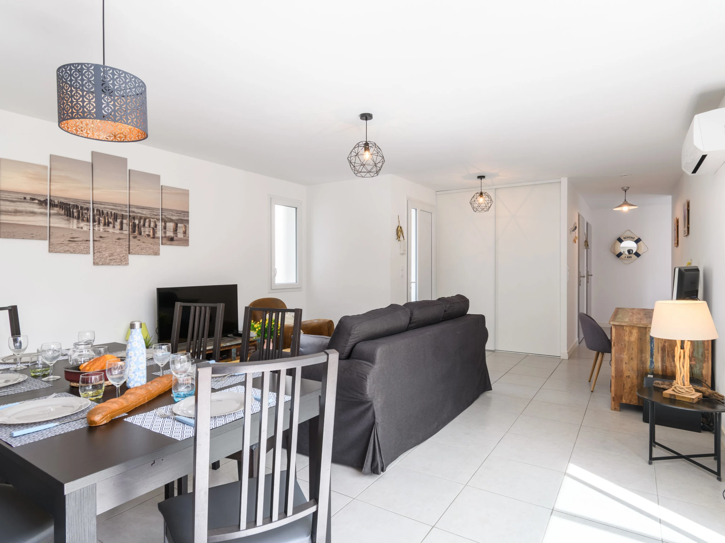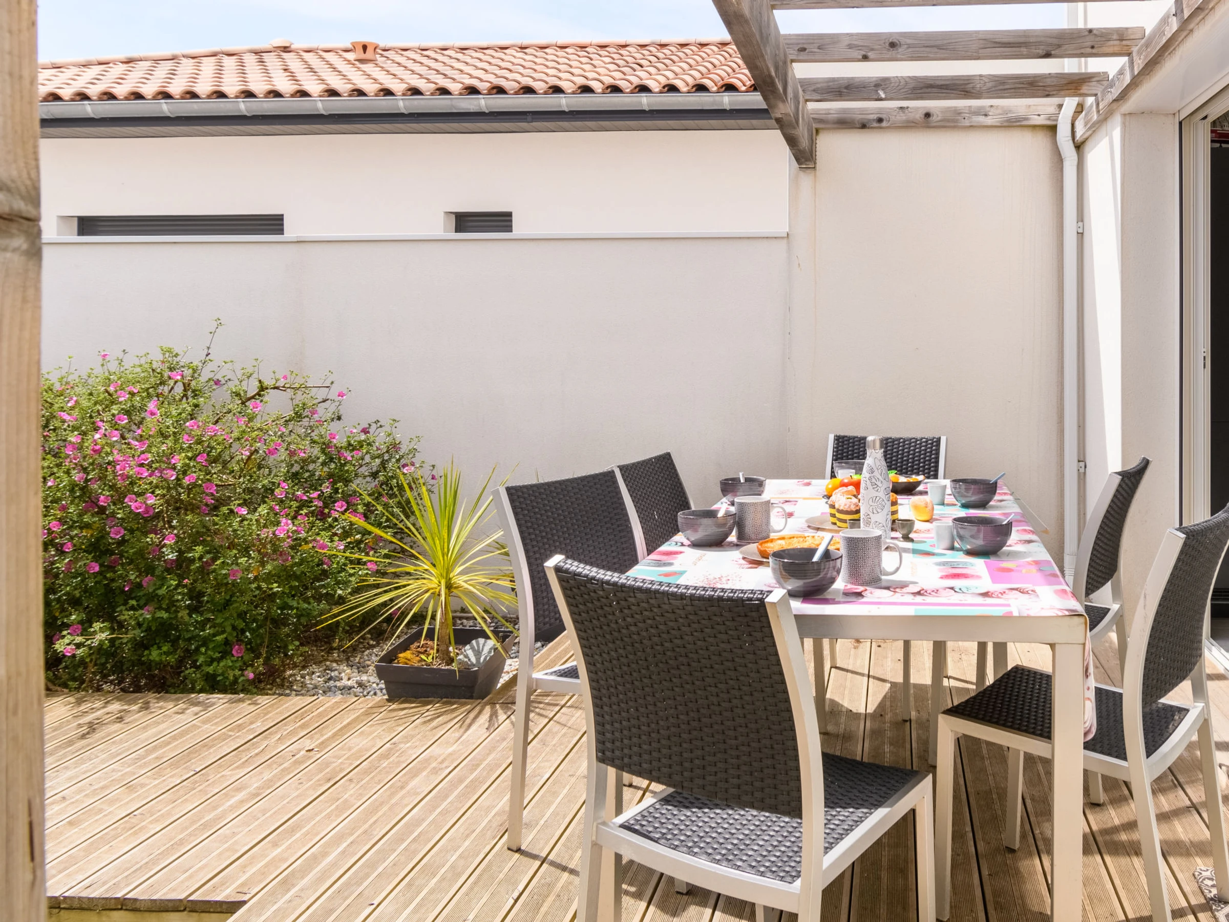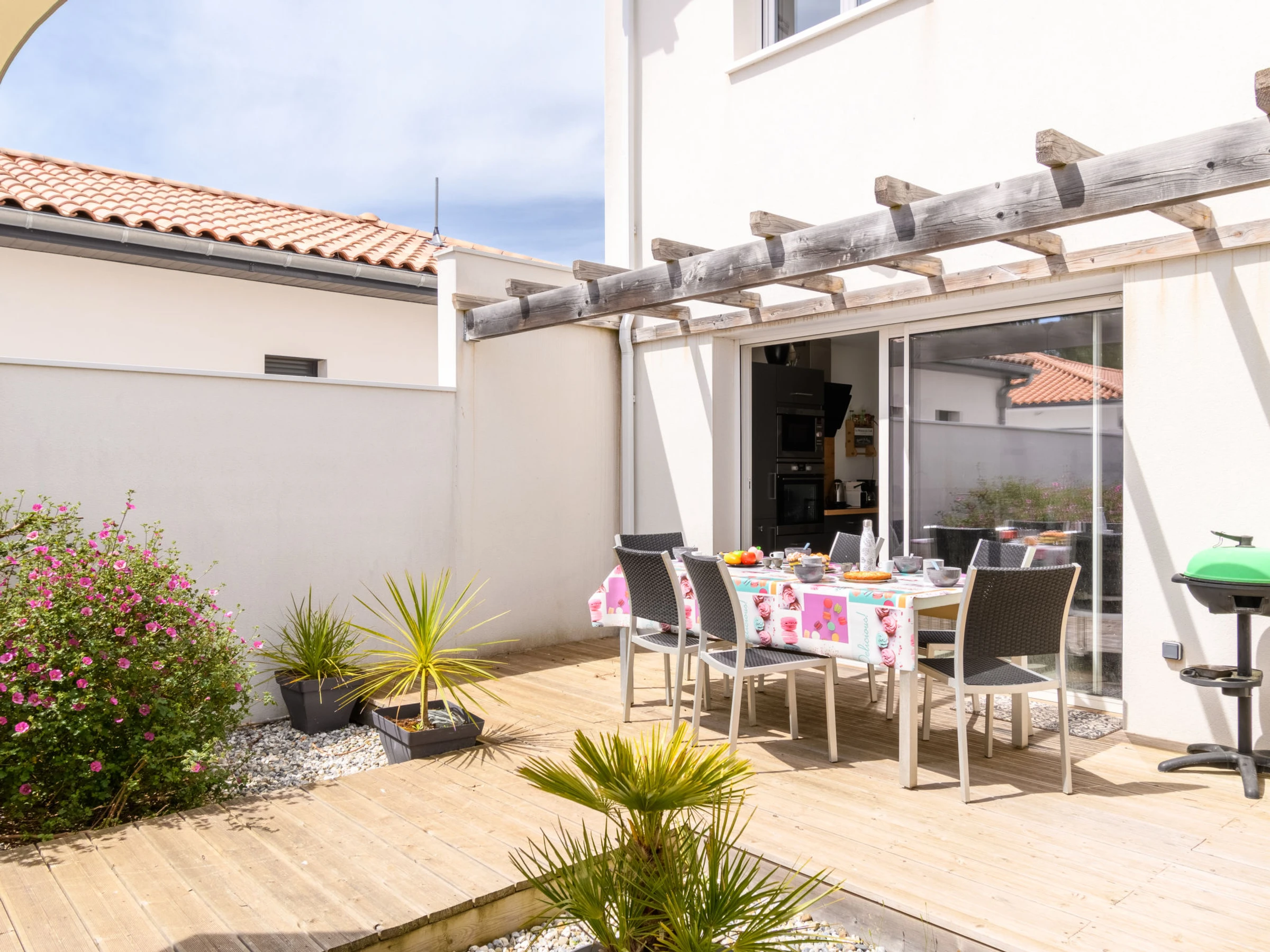 Apt 3 pièces 73 m2, au rez-de-chaussée. Aménagement fonctionnel et moderne: séjour/salle à manger avec baie vitrée avec 1 divan-lit (160 cm, longueur 200 cm), TV (écran plat), air-conditionné et chauffage à air chaud. Sortie sur la terrasse. 1 chambre avec 1 lit double (140 cm, longueur 190 cm). Sortie sur la terrasse. 1 chambre avec 2 lits (90 cm, longueur 190 cm). Sortie sur la terrasse. Coin cuisine (four, lave-vaisselle, 4 plaques à induction, micro-ondes, cafetière électrique, Capsules pour machine à café (Nespresso + filtre) (NON INCLUSES)). Douche, WC séparé. Grande terrasse 36 m2. Meubles de terrasse, barbecue. A disposition: lave-linge, sèche-cheveux. Internet (Connexion WIFI, gratuit). Place de parking. Veuillez noter: maximum 1 animal/ chien autorisé. Détecteur de fumée.