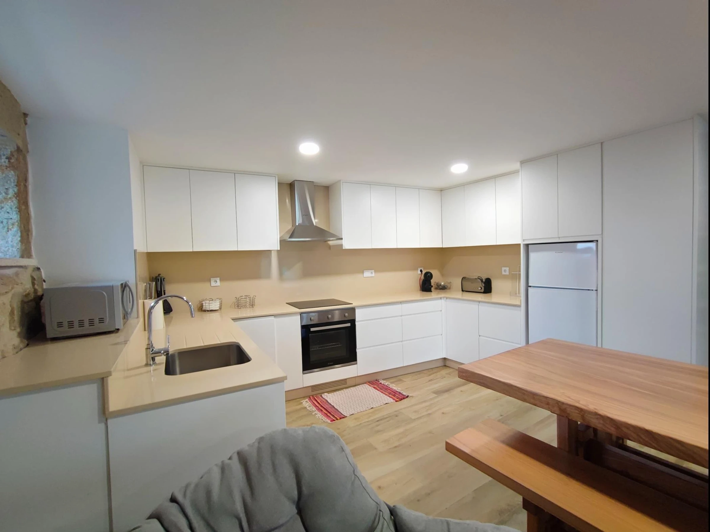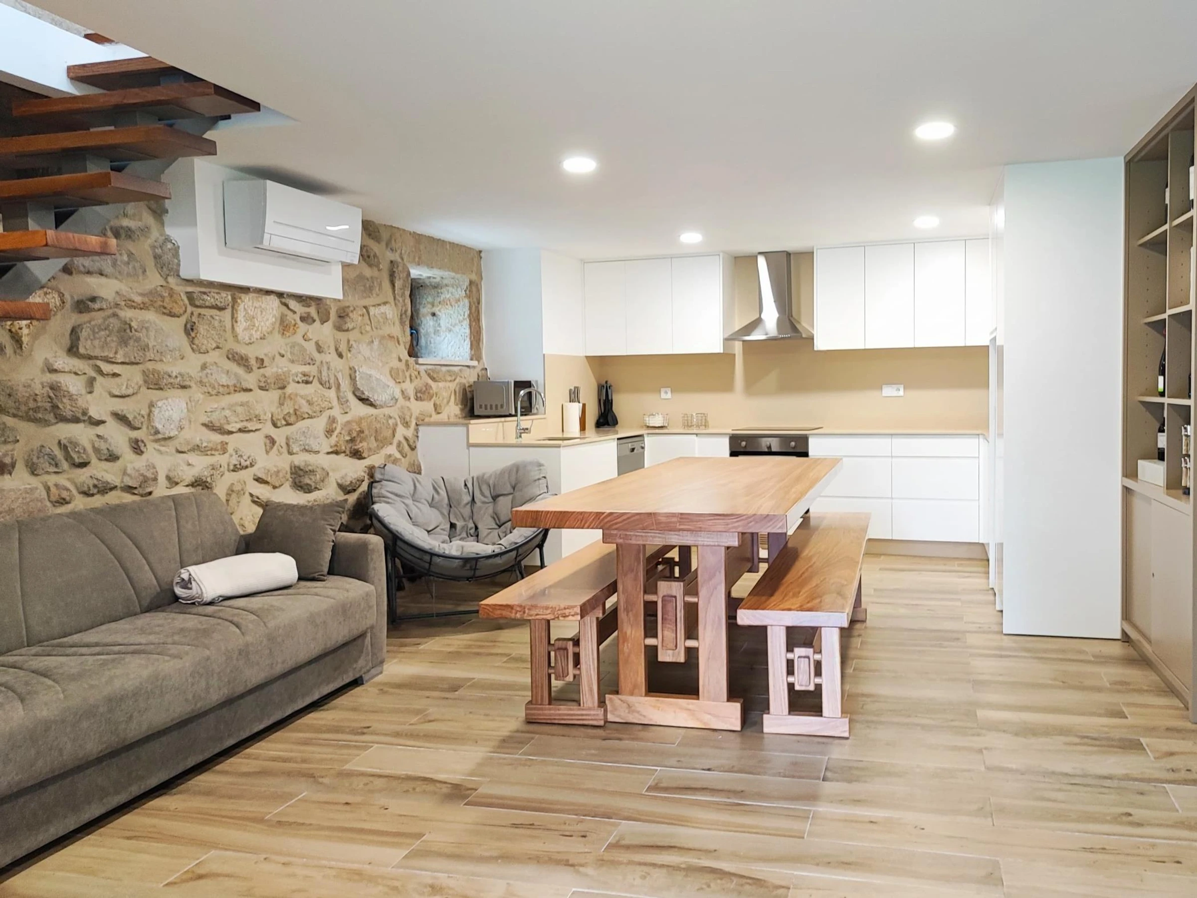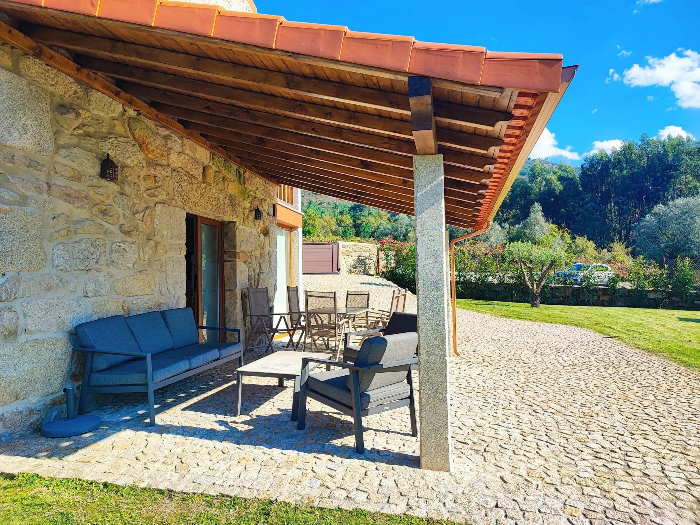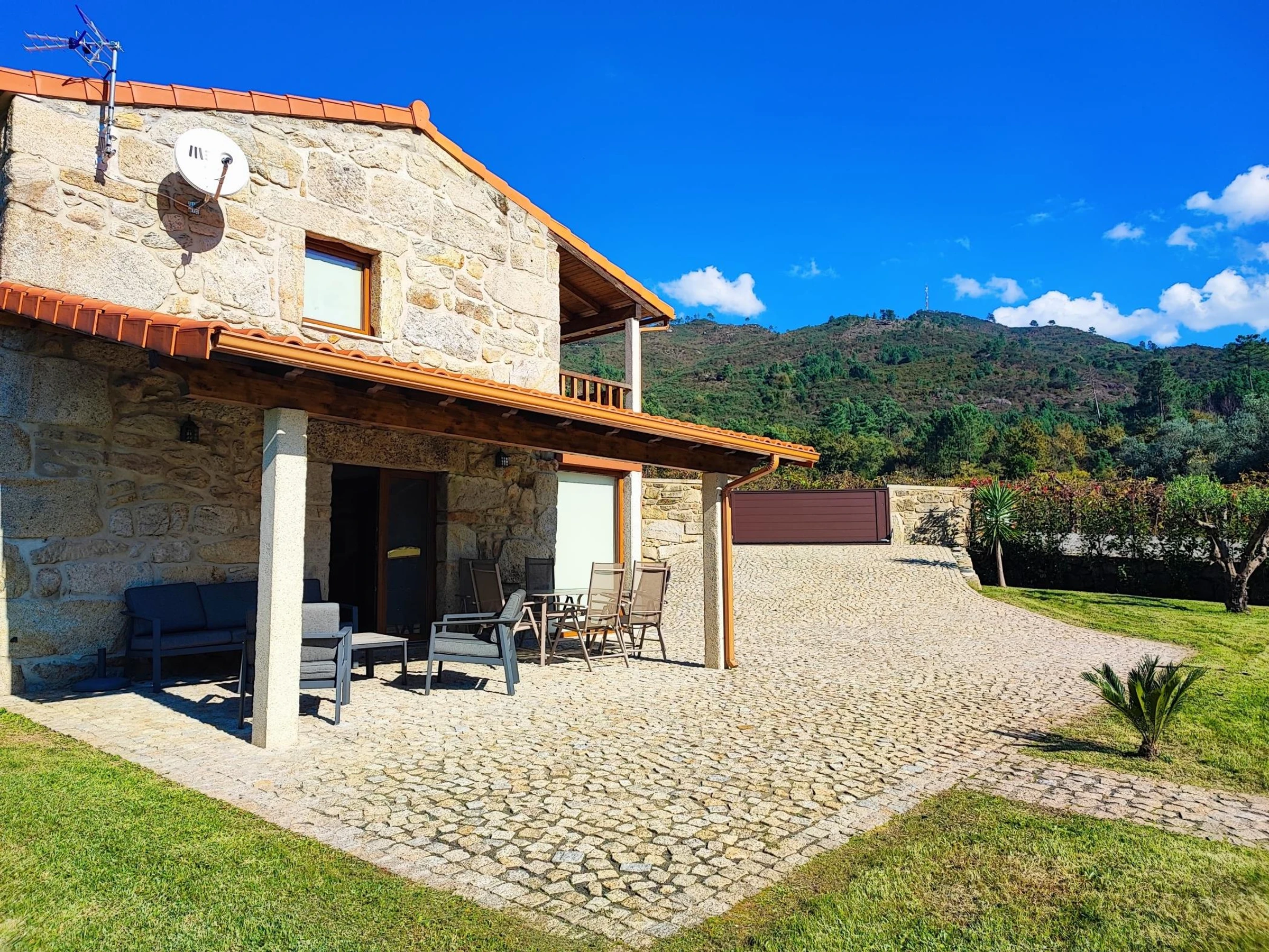 L'extérieur est le prolongement de l'espace intérieur, qui a cherché à conserver son style, en mettant en valeur les murs en pierre et les niches si caractéristiques de ces constructions en granit. Il dispose également d'une table à manger extérieure, de canapés et d'une table basse, pour profiter du calme du lever du soleil ou des fins d'après-midi.