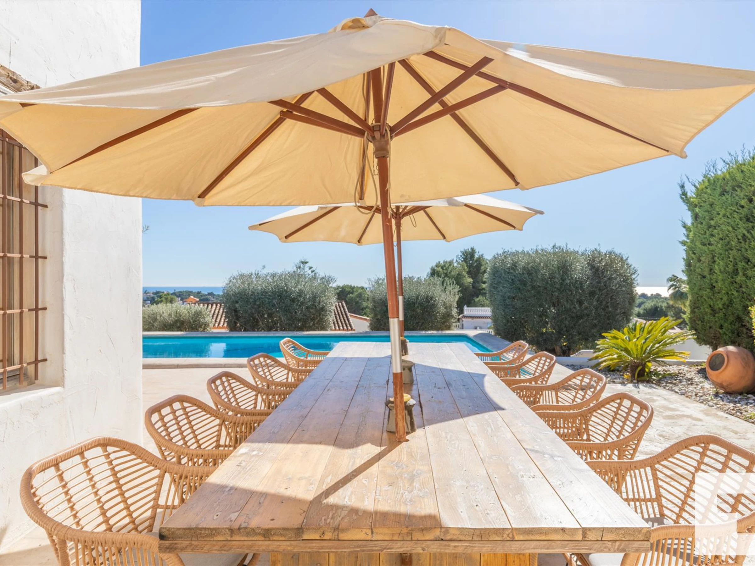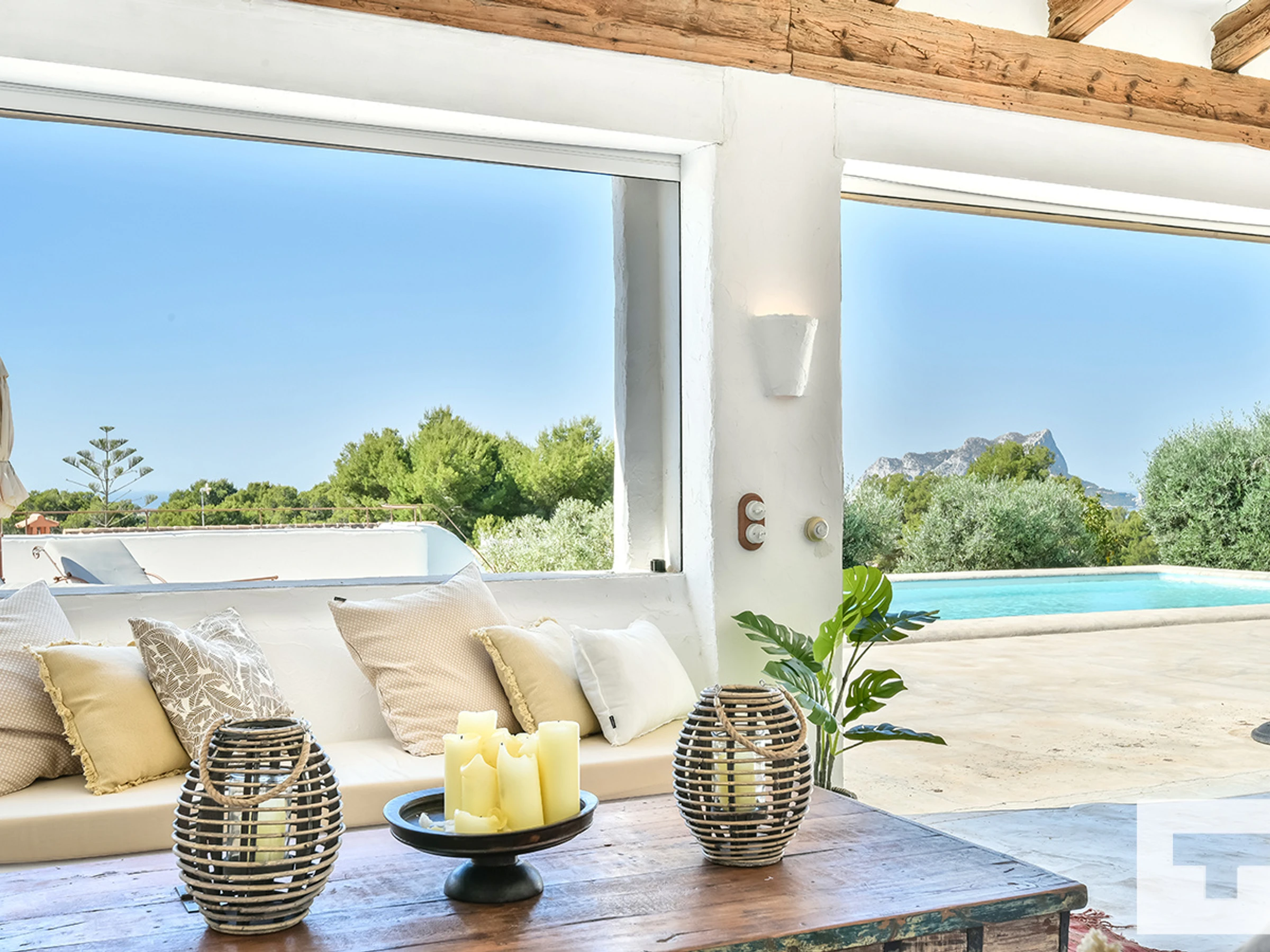 Laissez-vous séduire par cette splendide villa de style ibicenco, située dans un quartier paisible de Moraira, à seulement 2 km de la Cala Baladrar.