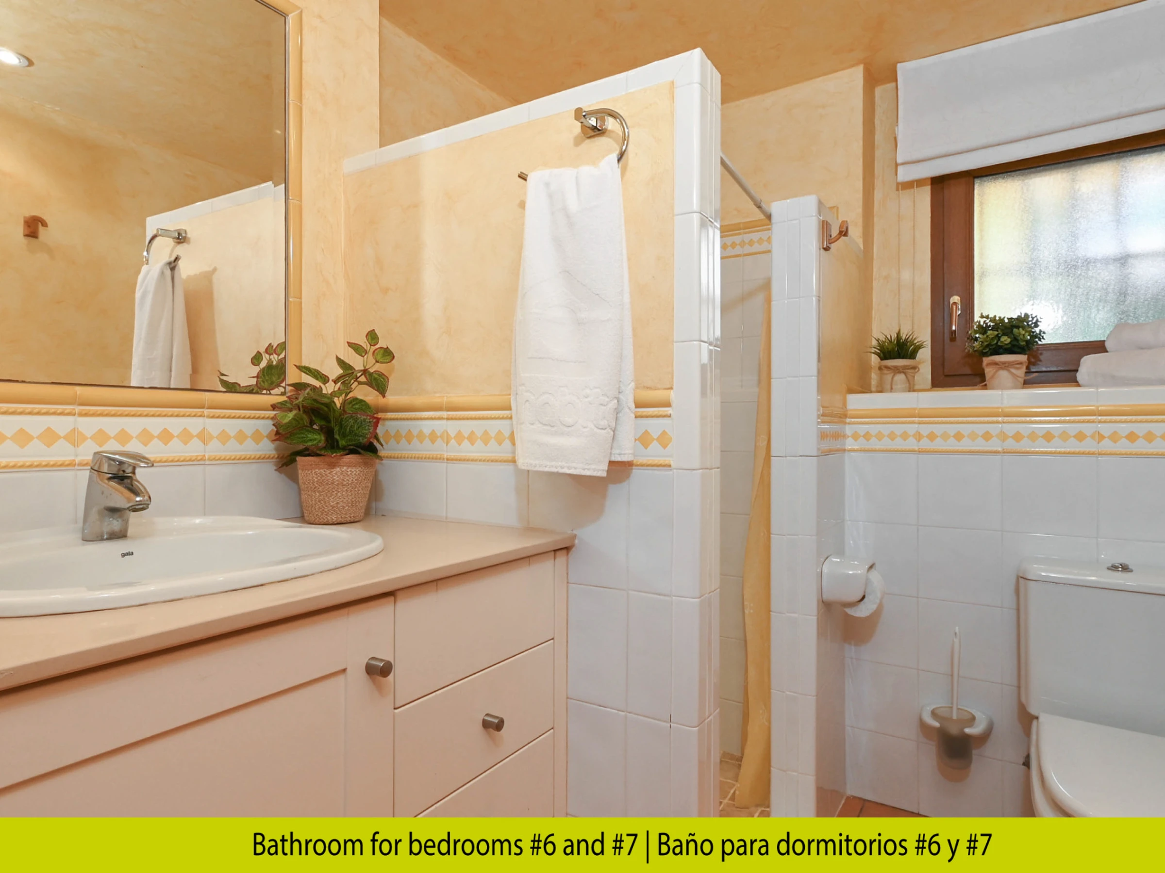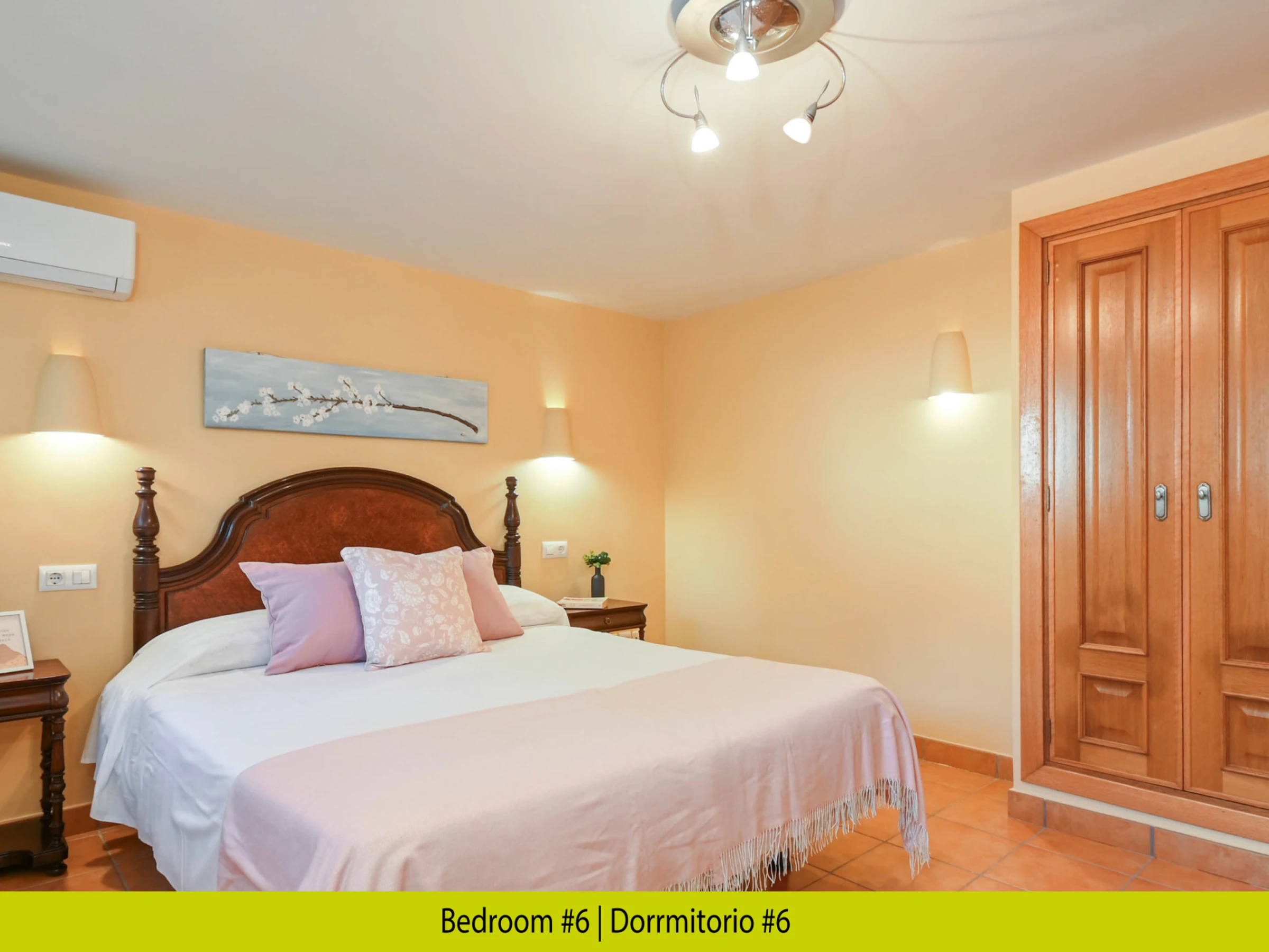 Dans une zone plus privée de l'étage principal, trois chambres sont situées dans le même couloir. La chambre #1 dispose d'une élégante salle de bain attenante et d'un spacieux dressing. La chambre #2 dispose d'une salle de bain extérieure. La chambre #3 dispose d'une salle de bain attenante et d'un dressing. Au rez-de-chaussée, dans une zone très calme de la maison, se trouvent les trois autres chambres. Les chambres #4 et #5 peuvent être reliées par une porte pour former une grande chambre familiale. À côté de la chambre #4 se trouve une salle de bain avec douche. La chambre #5 dispose d'une salle de bain attenante et d'un grand dressing. La chambre #6 est une chambre familiale qui dispose d'un lit de matrimonial, d'un lit simple et d'une salle de bain attenante avec douche. Au rez-de-chaussée se trouvent également la porte d'entrée du logement et le garage.