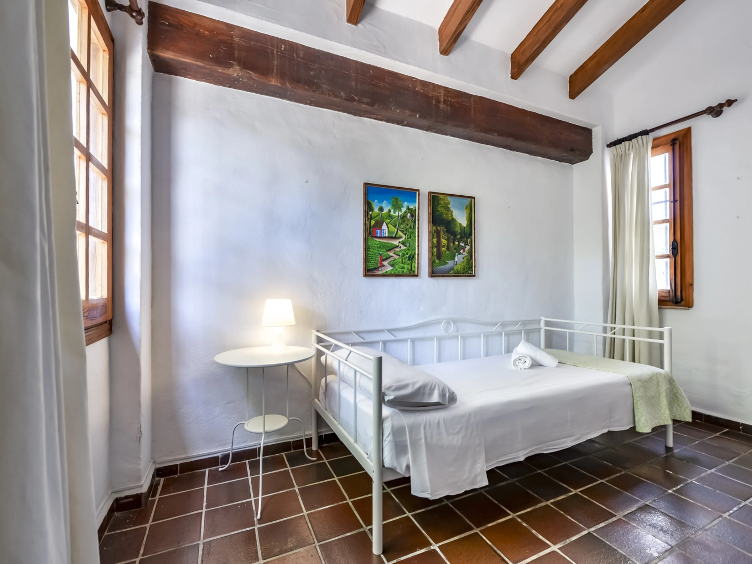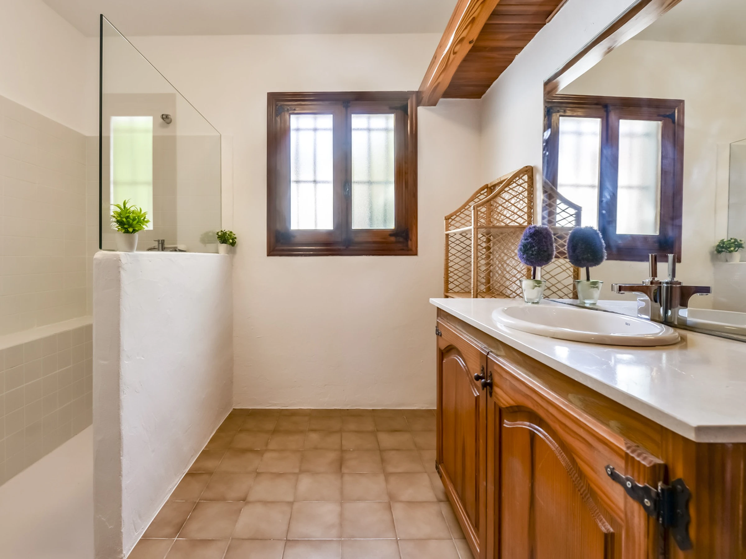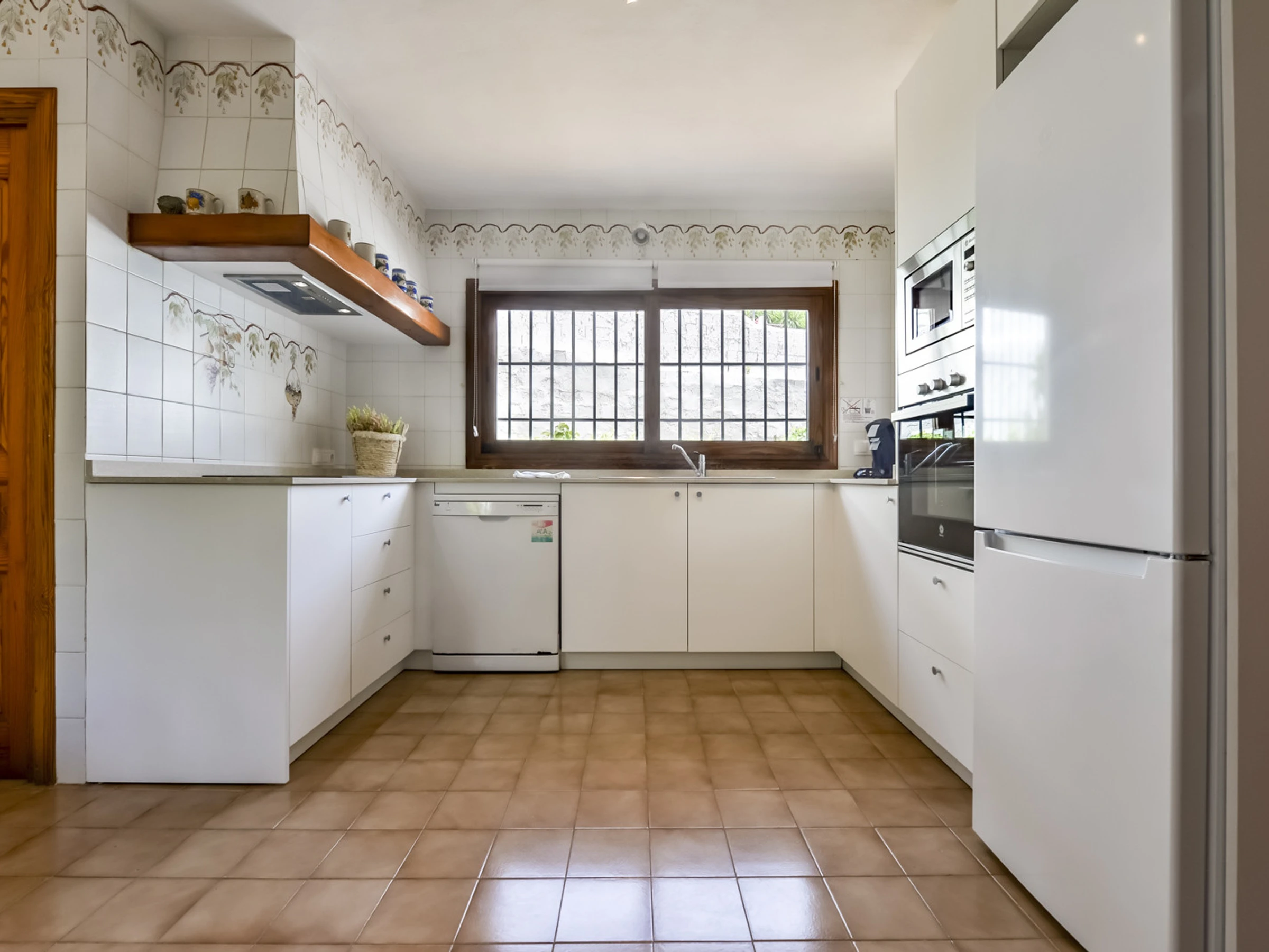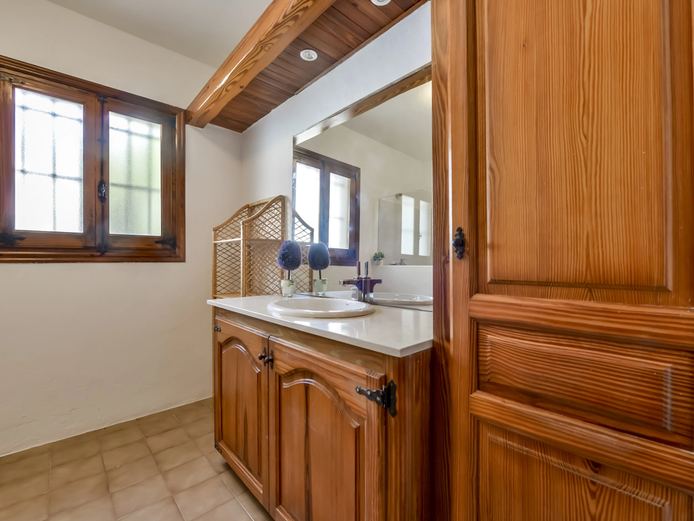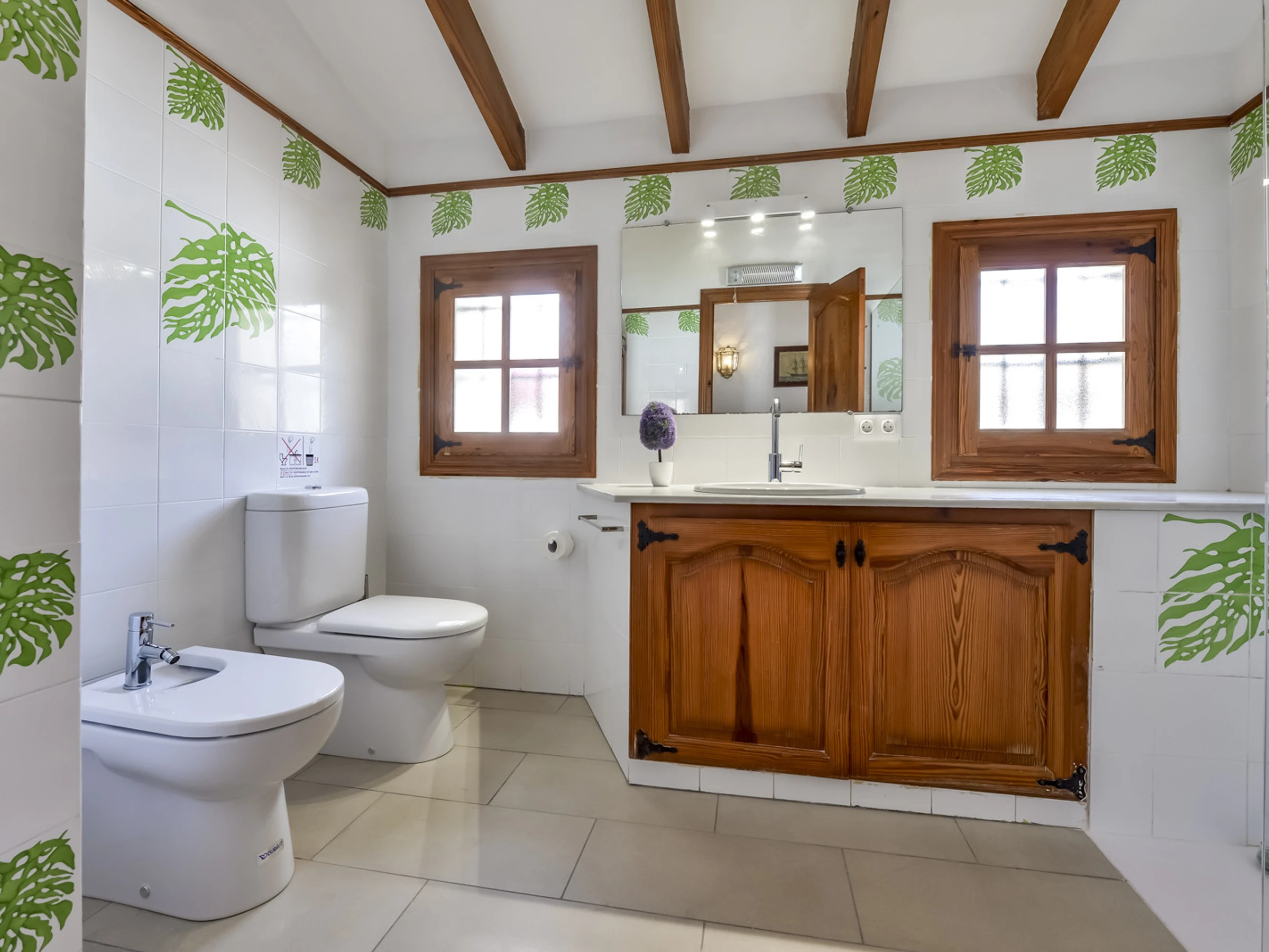 Avec 150 m² de surface habitable et une décoration typiquement méditerranéenne espagnole, la villa est distribuée comme suit : Un étage principal avec une cuisine spacieuse, entièrement équipée et indépendante. De la cuisine, on accède à l'une des chambres avec un lit simple et une salle de bains attenante avec une petite baignoire. Un salon/salle à manger spacieux avec une cheminée décorative, l'air conditionné, un canapé et un coin repas. Depuis le salon, on accède à la deuxième chambre simple, avec un lit de 90/190 cm. Un couloir partant du salon mène à un vestiaire pour les invités avec WC et lavabo seulement, à une troisième chambre avec un lit double et à une salle de bains avec douche.