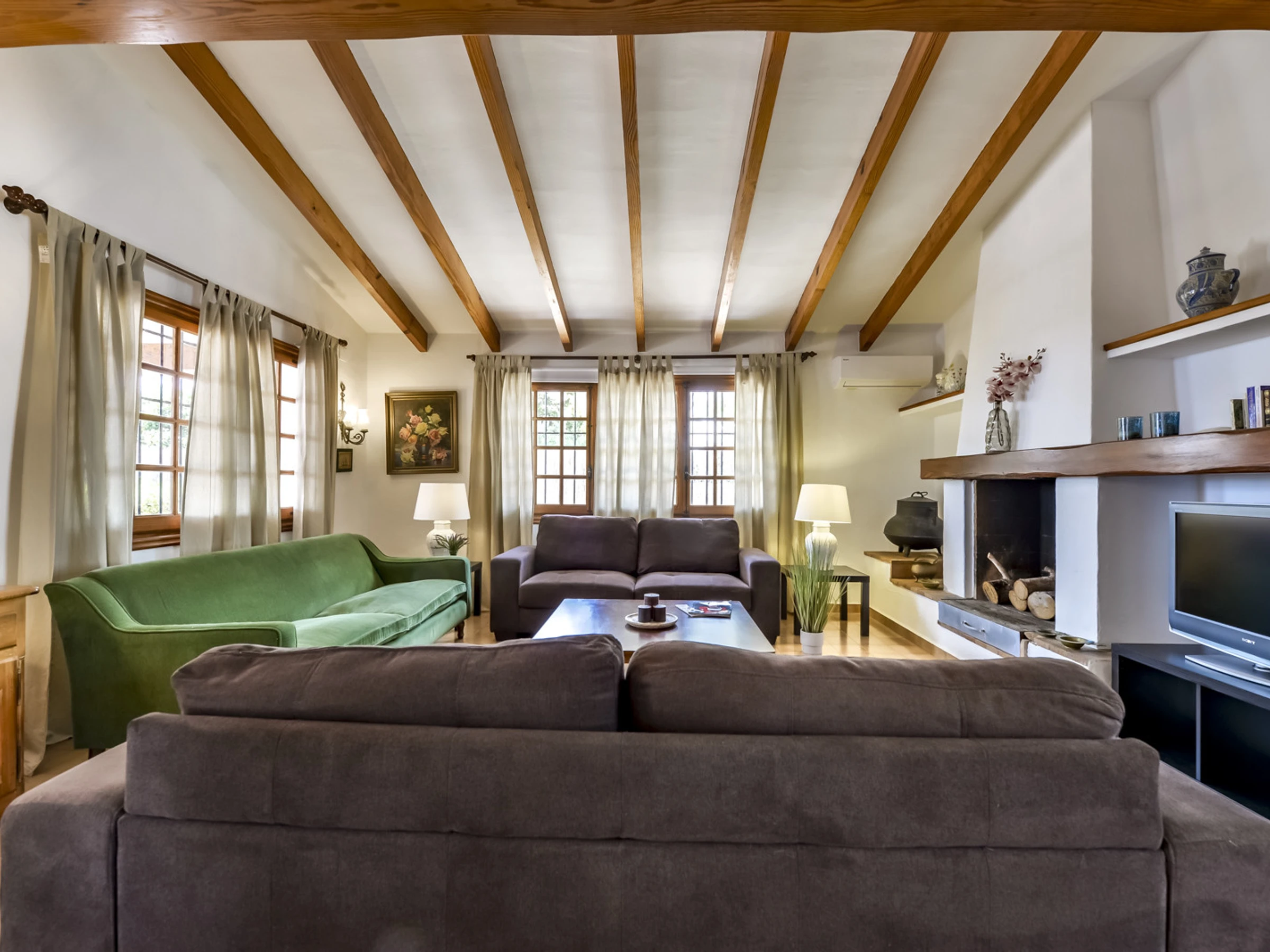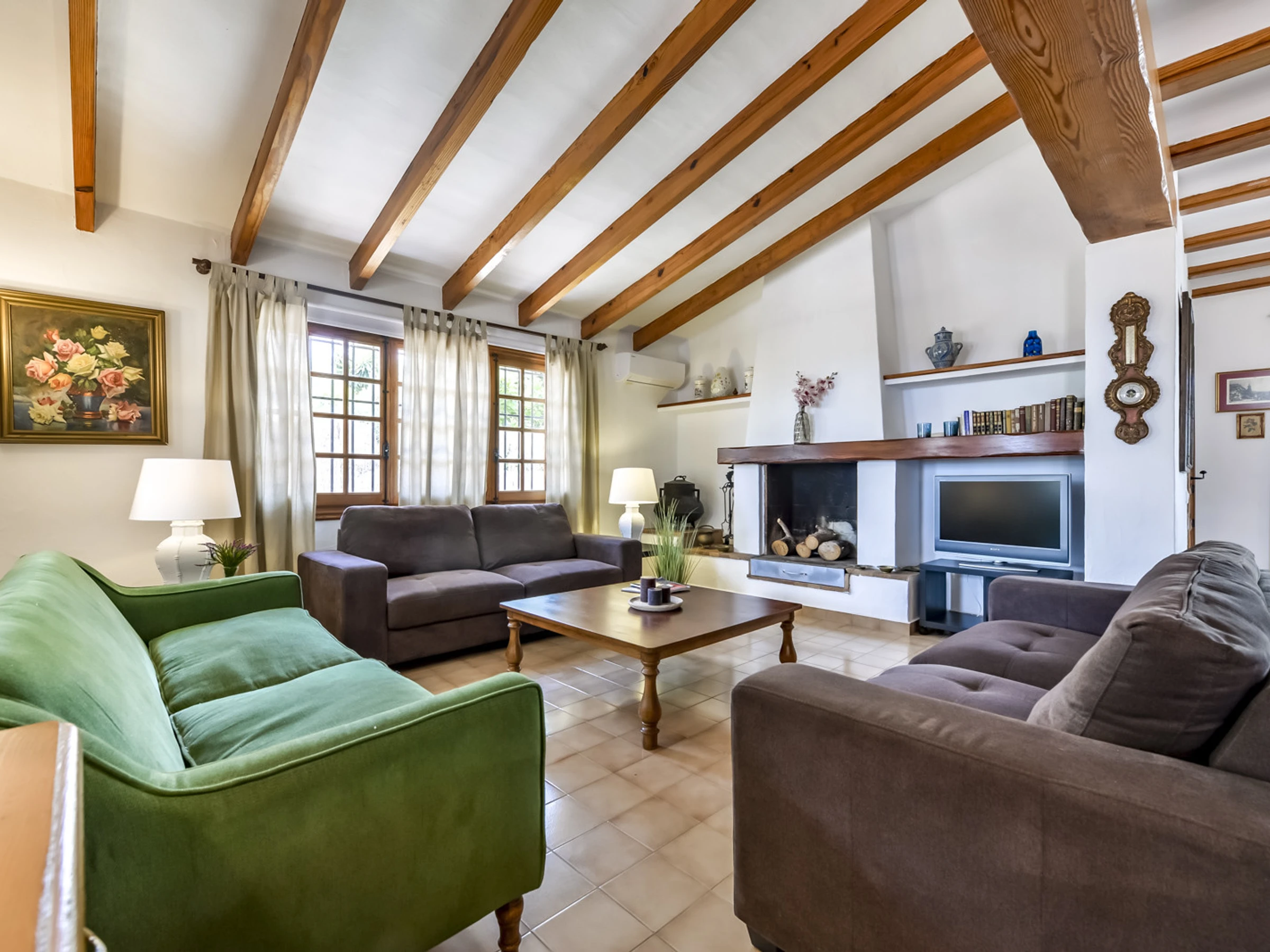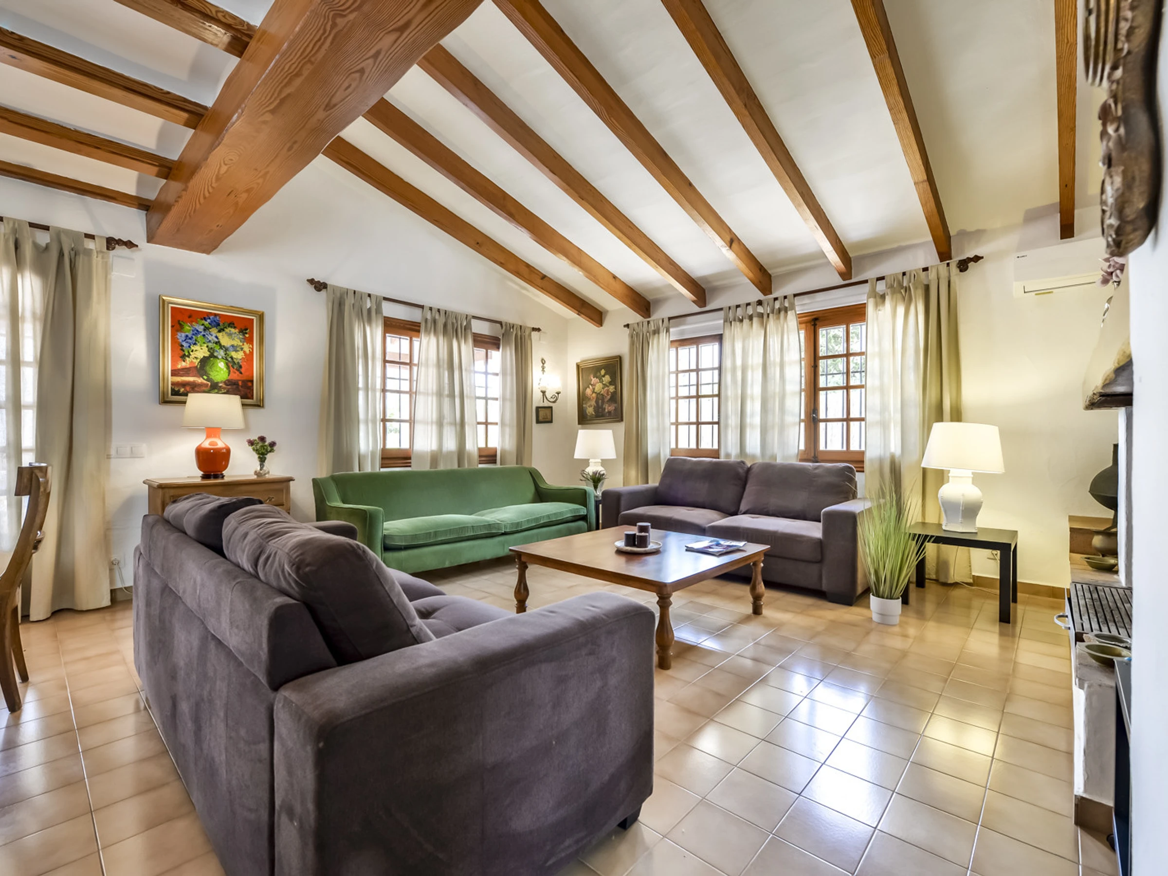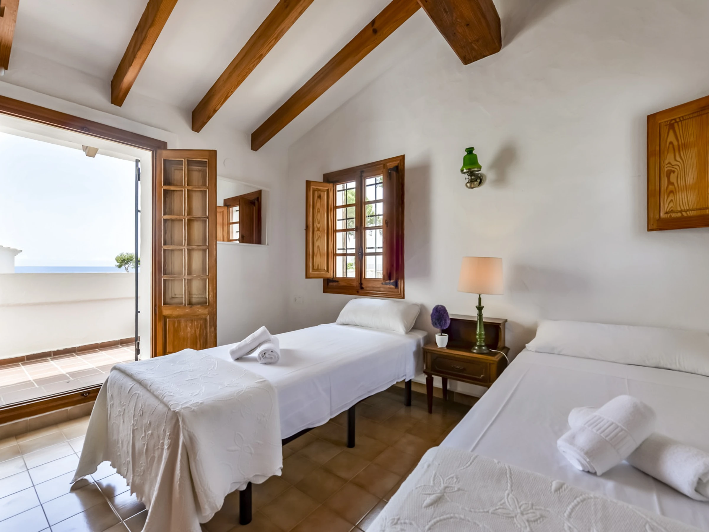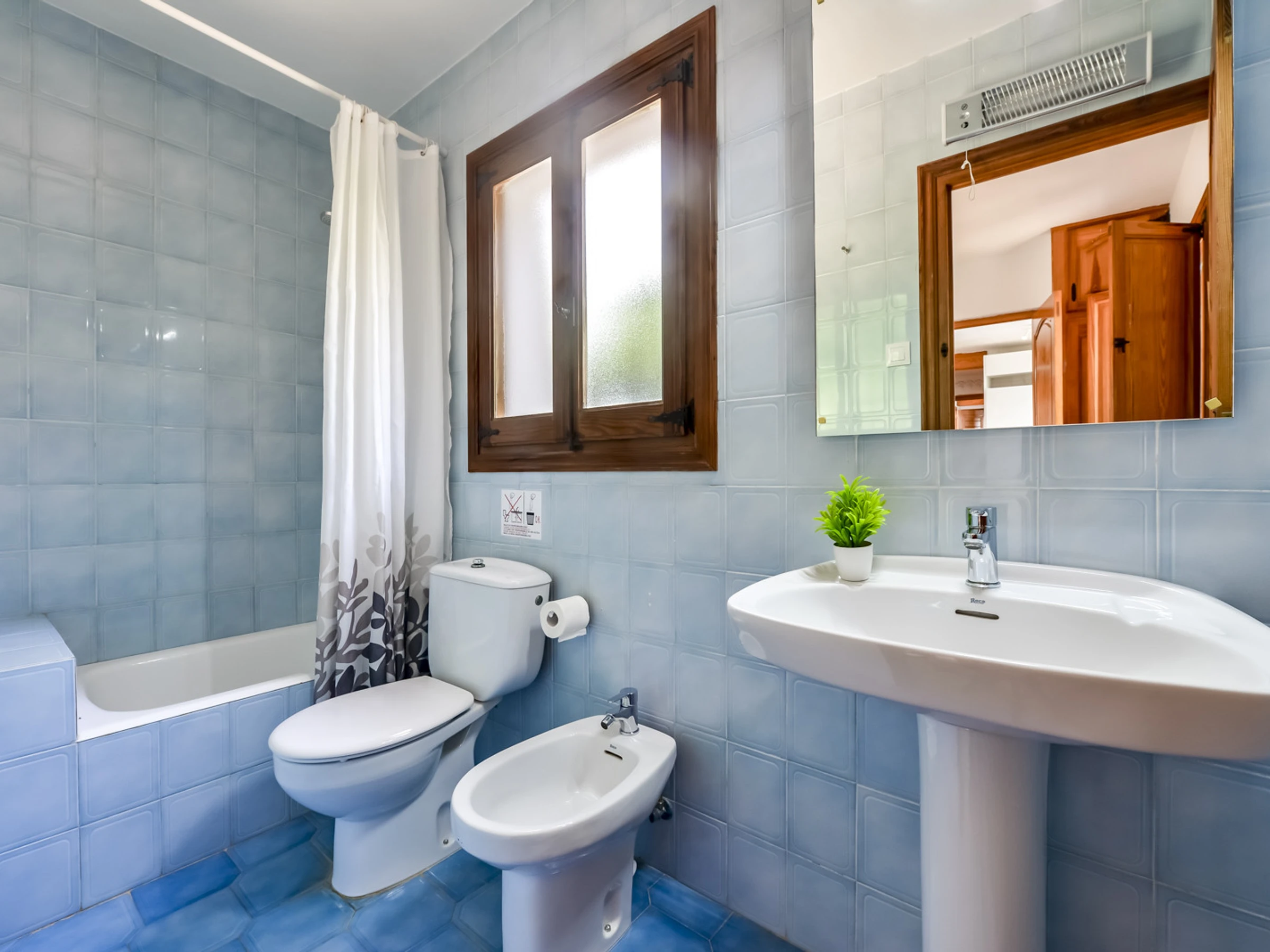 Avec 150 m² de surface habitable et une décoration typiquement méditerranéenne espagnole, la villa est distribuée comme suit : Un étage principal avec une cuisine spacieuse, entièrement équipée et indépendante. De la cuisine, on accède à l'une des chambres avec un lit simple et une salle de bains attenante avec une petite baignoire. Un salon/salle à manger spacieux avec une cheminée décorative, l'air conditionné, un canapé et un coin repas. Depuis le salon, on accède à la deuxième chambre simple, avec un lit de 90/190 cm. Un couloir partant du salon mène à un vestiaire pour les invités avec WC et lavabo seulement, à une troisième chambre avec un lit double et à une salle de bains avec douche.