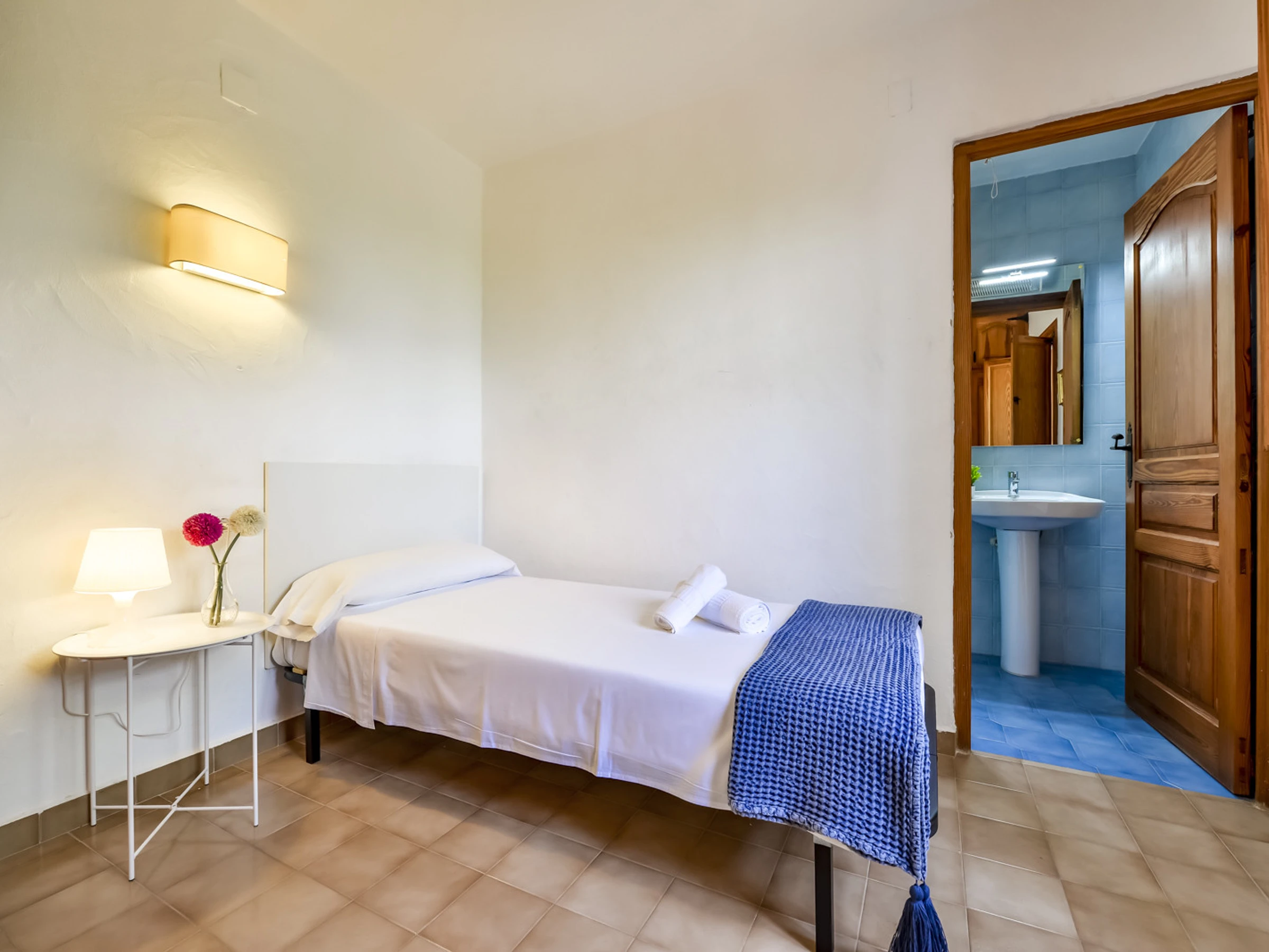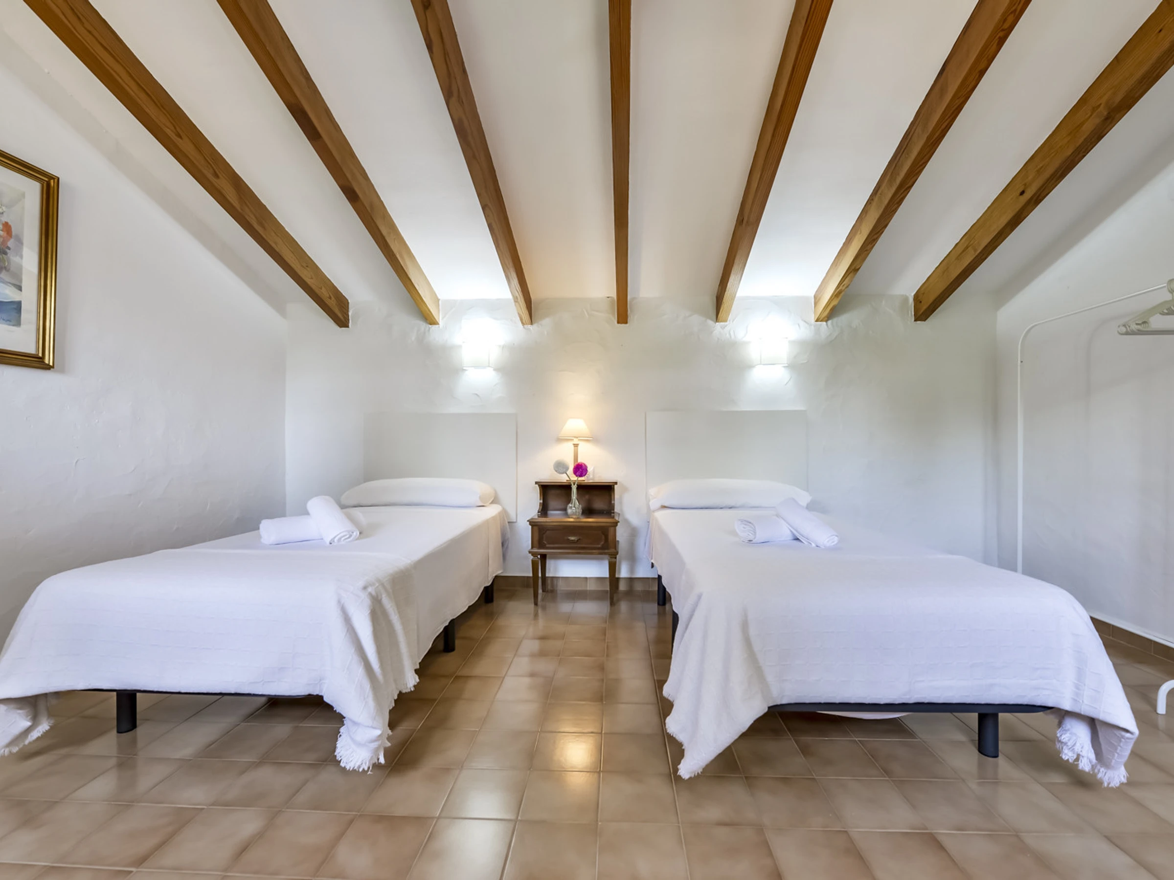 En montant un escalier intérieur, on accède à l'étage supérieur, où se trouvent une chambre avec deux lits simples, une salle de bains complète avec douche, une chambre avec deux lits simples et climatisation, et une sixième chambre avec un lit double et climatisation.