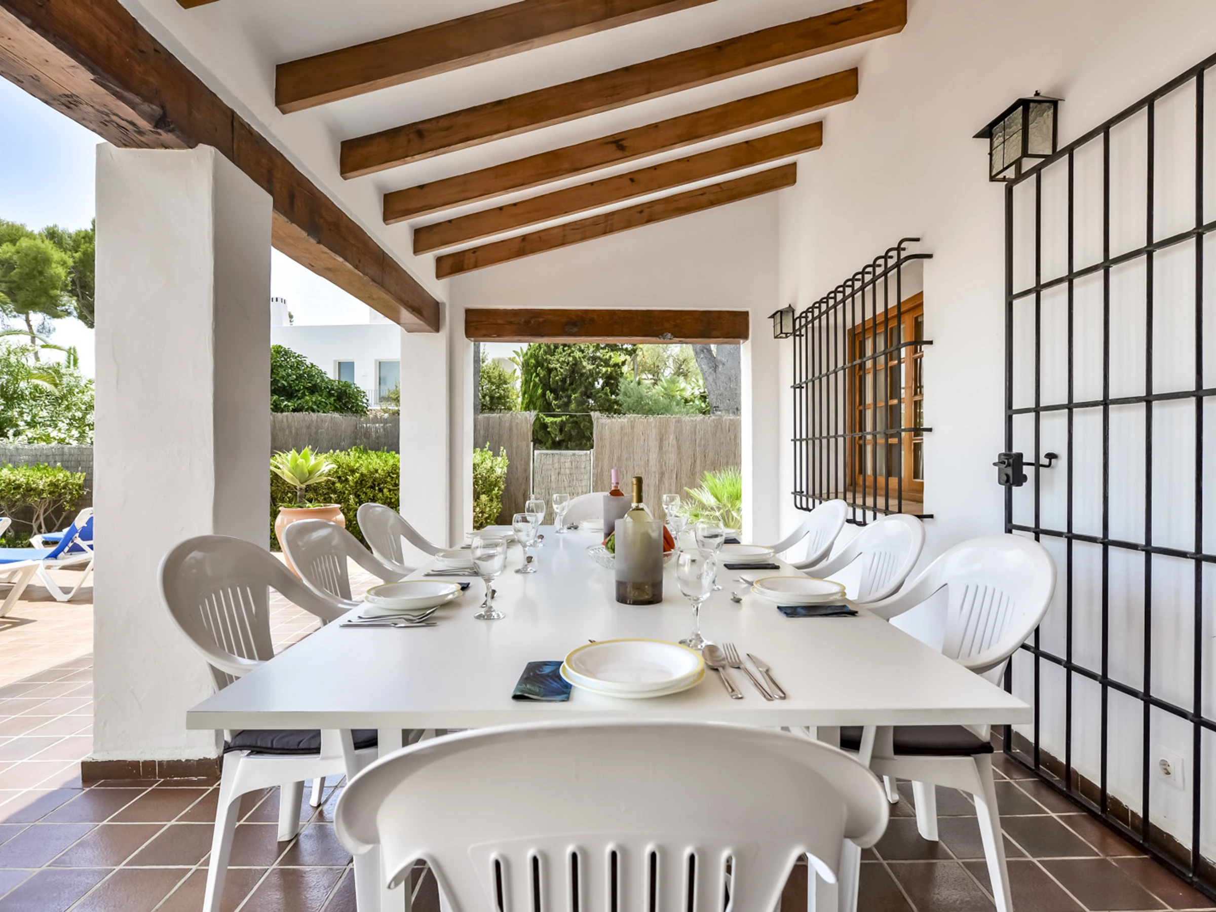 Autour de la villa, vous pouvez profiter d'un grand terrain avec des arbres fruitiers tels que des citronniers et des figuiers, et une terrasse couverte avec une table pour les repas en plein air, une zone de bronzage devant la piscine et un barbecue avec une petite table de jardin.