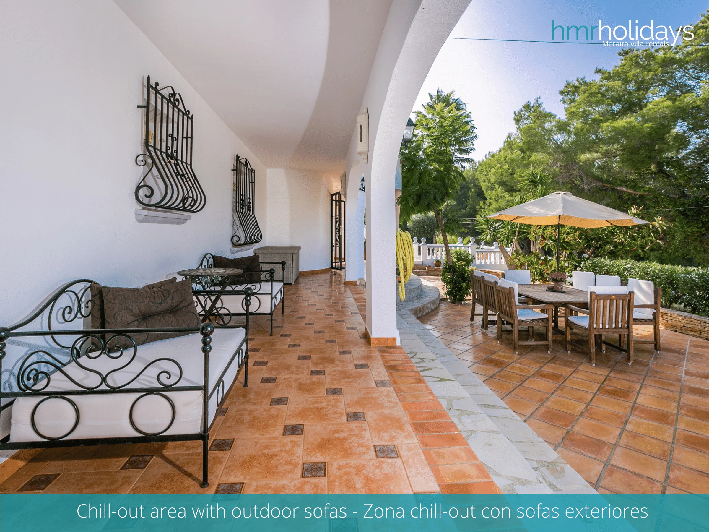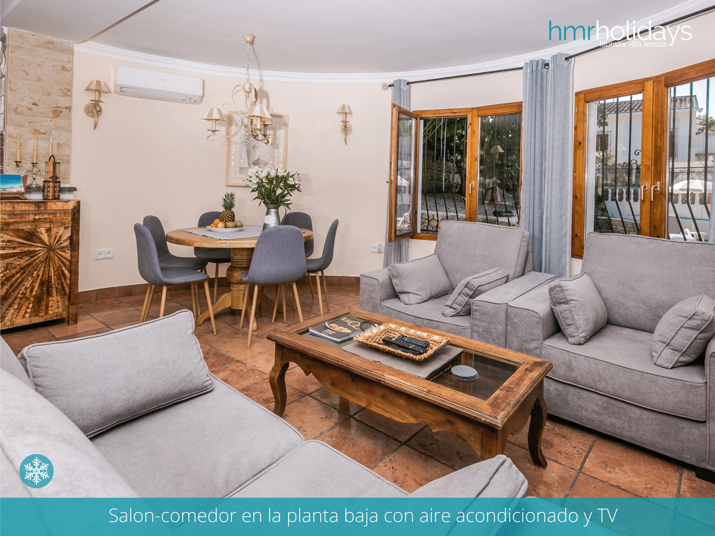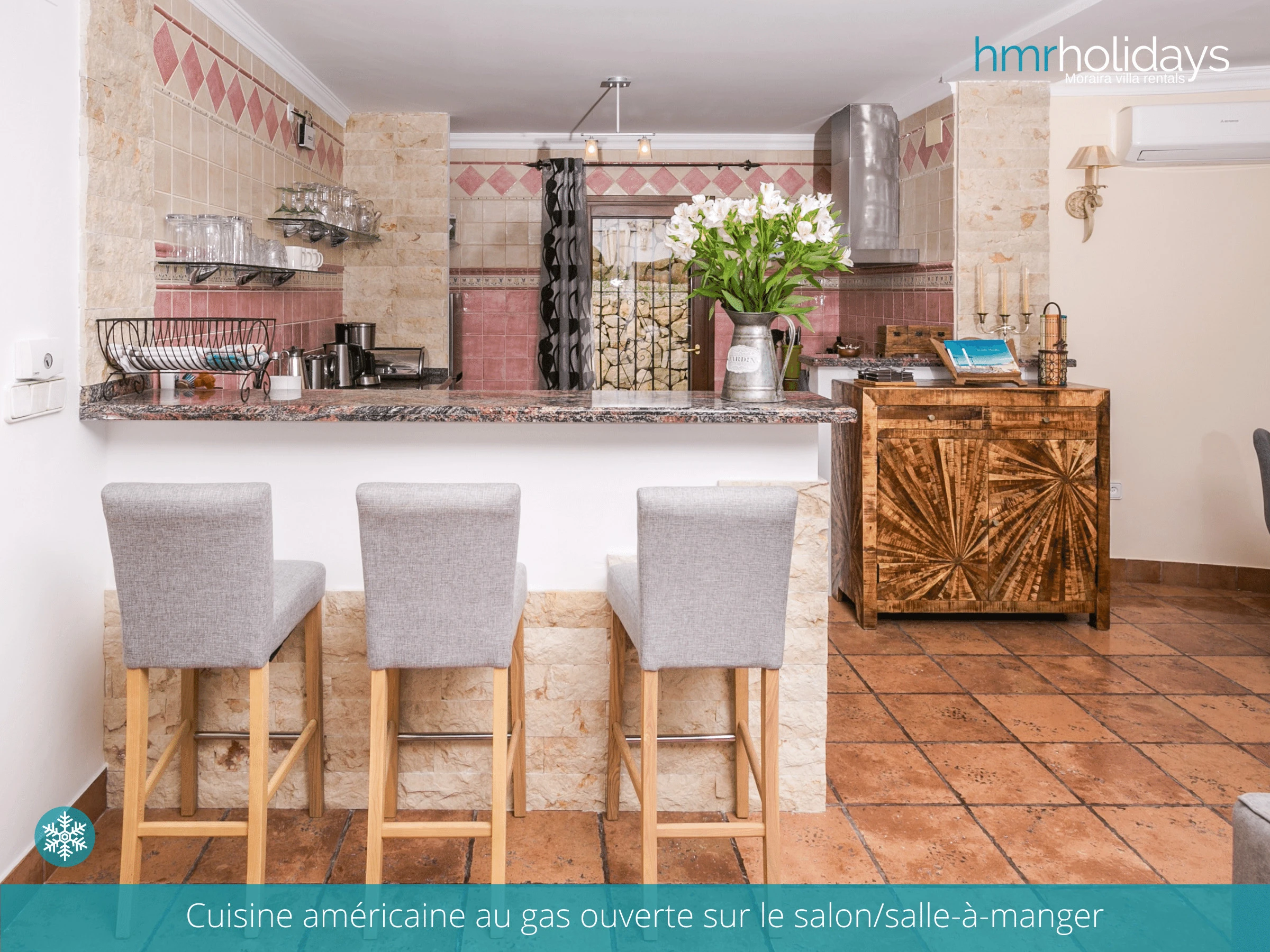 L'intérieur de la villa se caractérise par une architecture traditionnelle espagnole, avec de beaux carrelages et des accents en bois qui créent une atmosphère chaleureuse et accueillante. Le salon dispose d'un confortable coin salon.
