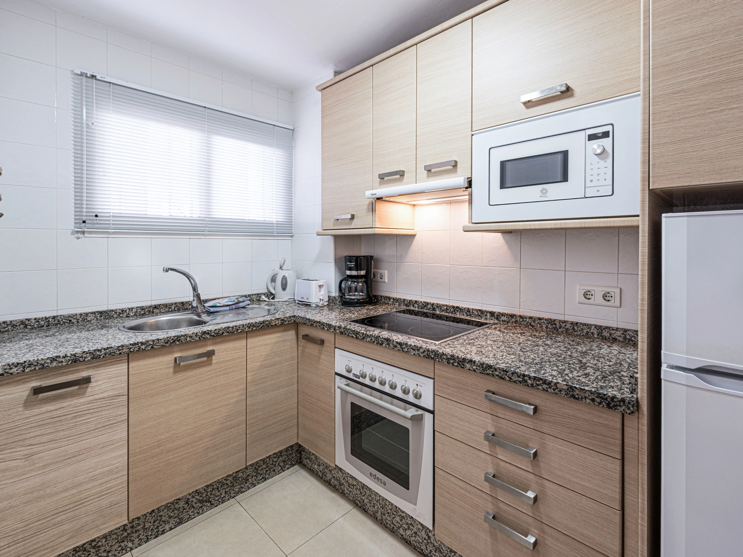 Cet appartement de deux chambres peut accueillir jusqu'à quatre personnes et offre tout ce dont vous avez besoin pour un séjour relaxant. Restez connecté grâce à l'internet haut débit ou détendez-vous sur le balcon privé donnant sur la piscine et les jardins, équipé d'une table pour quatre personnes.