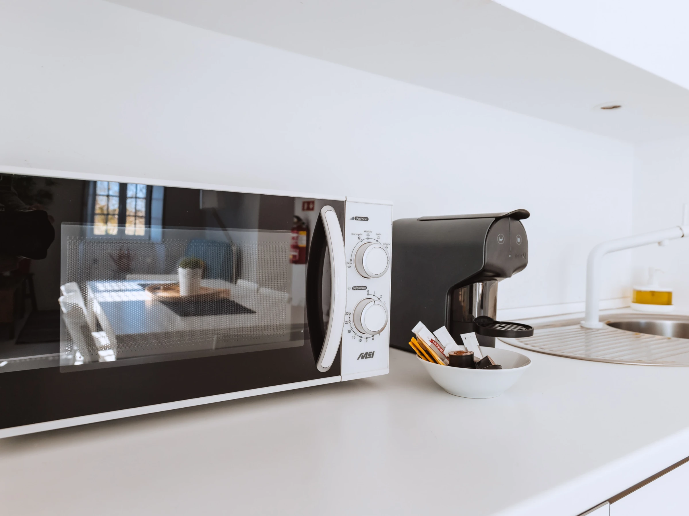 La cuisine, Électrique, est équipée avec réfrigérateur, micro-ondes, vaisselle/couverts, ustensiles/cuisine, cafetière, grille pain et bouilloire.