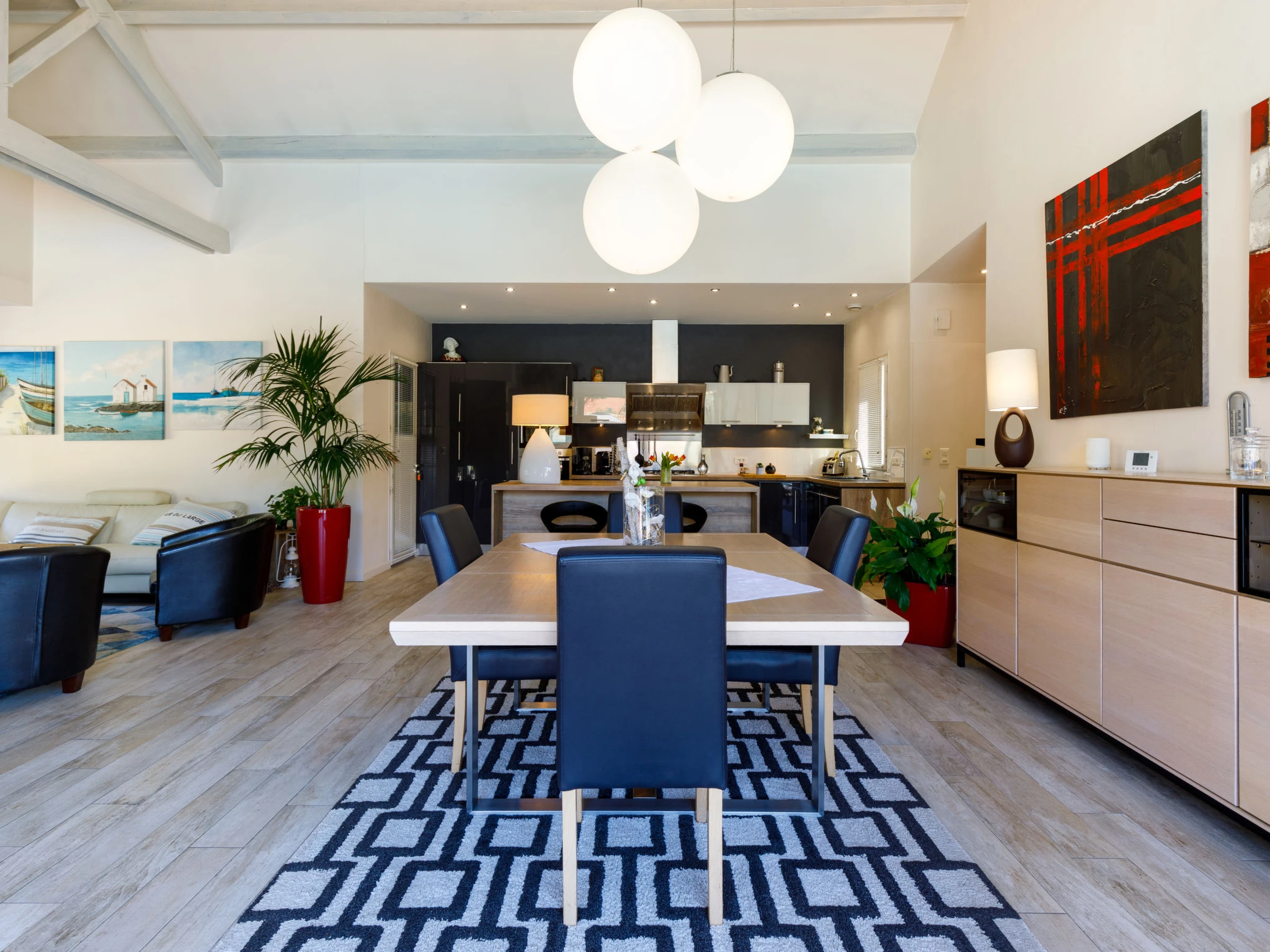 "Le Grand Large", villa 6 pièces 195 m2, situation sud. Spacieux, aménagement moderne: séjour/salle à manger 90 m2 avec cheminée (uniquement à titre de décoration), TV (écran plat), Home cinéma. Sortie sur la terrasse, orientée sud. 3 chambres, chaque chambre avec: 1 grand-lit (1 x 140 cm, longueur 190 cm). 2 chambres, chaque chambre avec: 1 grand-lit (1 x 160 cm, longueur 200 cm). Cuisine ouverte (four, lave-vaisselle, 5 feux, grille-pain, bouilloire électrique, micro-ondes, congélateur, cafetière électrique). Douche, 2 douches/WC, WC séparé. Chauffage par le sol. Grande terrasse, situation sud. Meubles de terrasse, barbecue, chaises longues. A disposition: lave-linge, fer à repasser, sèche-cheveux. Internet (Connexion WIFI, gratuit). Place de parking (cloturée). Veuillez noter: maison non-fumeur. Détecteur de fumée. Pas de liaison interne entre les différentes unités. La piscine mentionnée dans le descriptif est privative. Maison principale : 150m² , 3 chambres et annexe : 45m² , 2 chambres. Annonce d'un particulier (art 155, IV du CGI). [hidden]