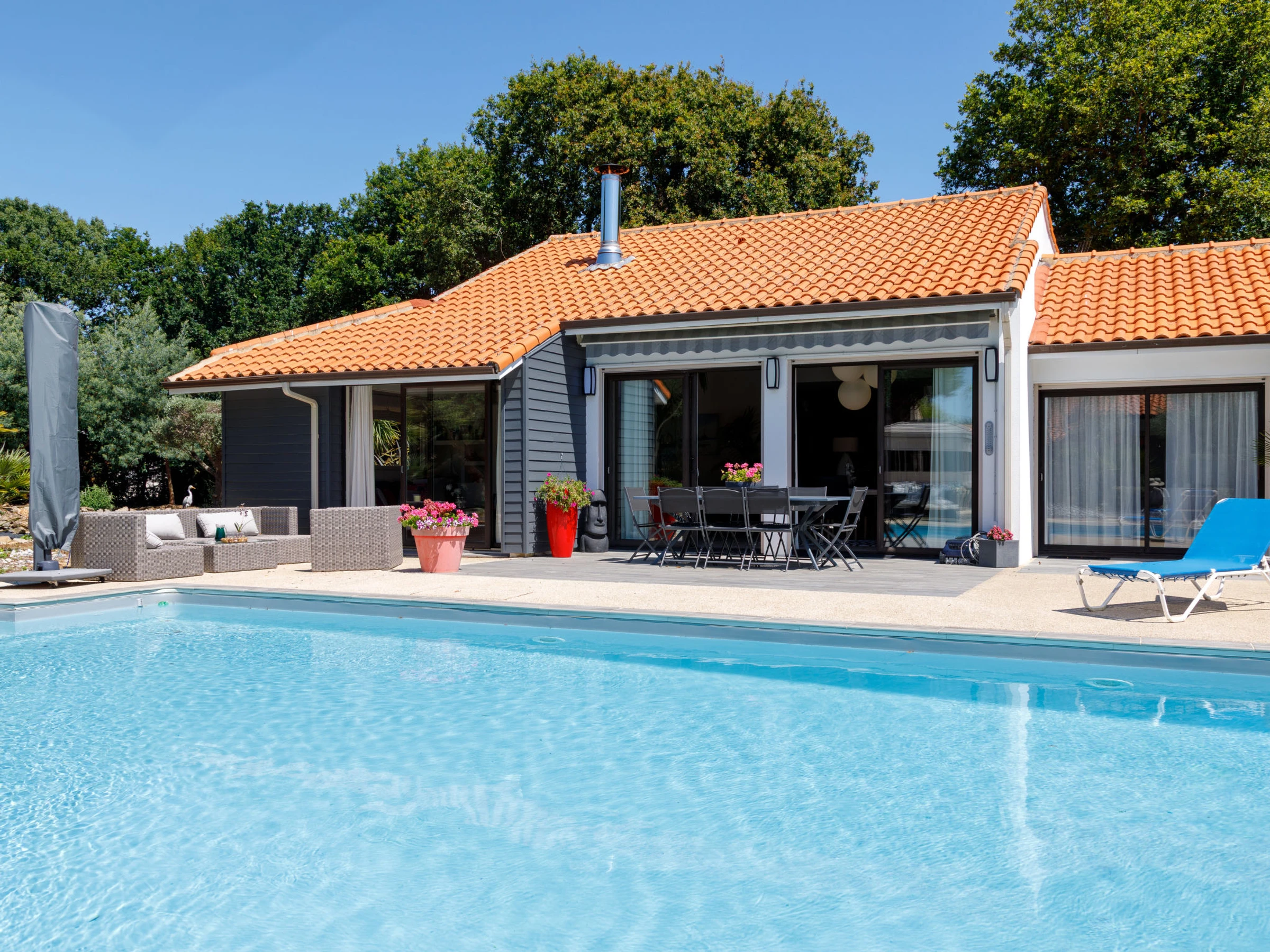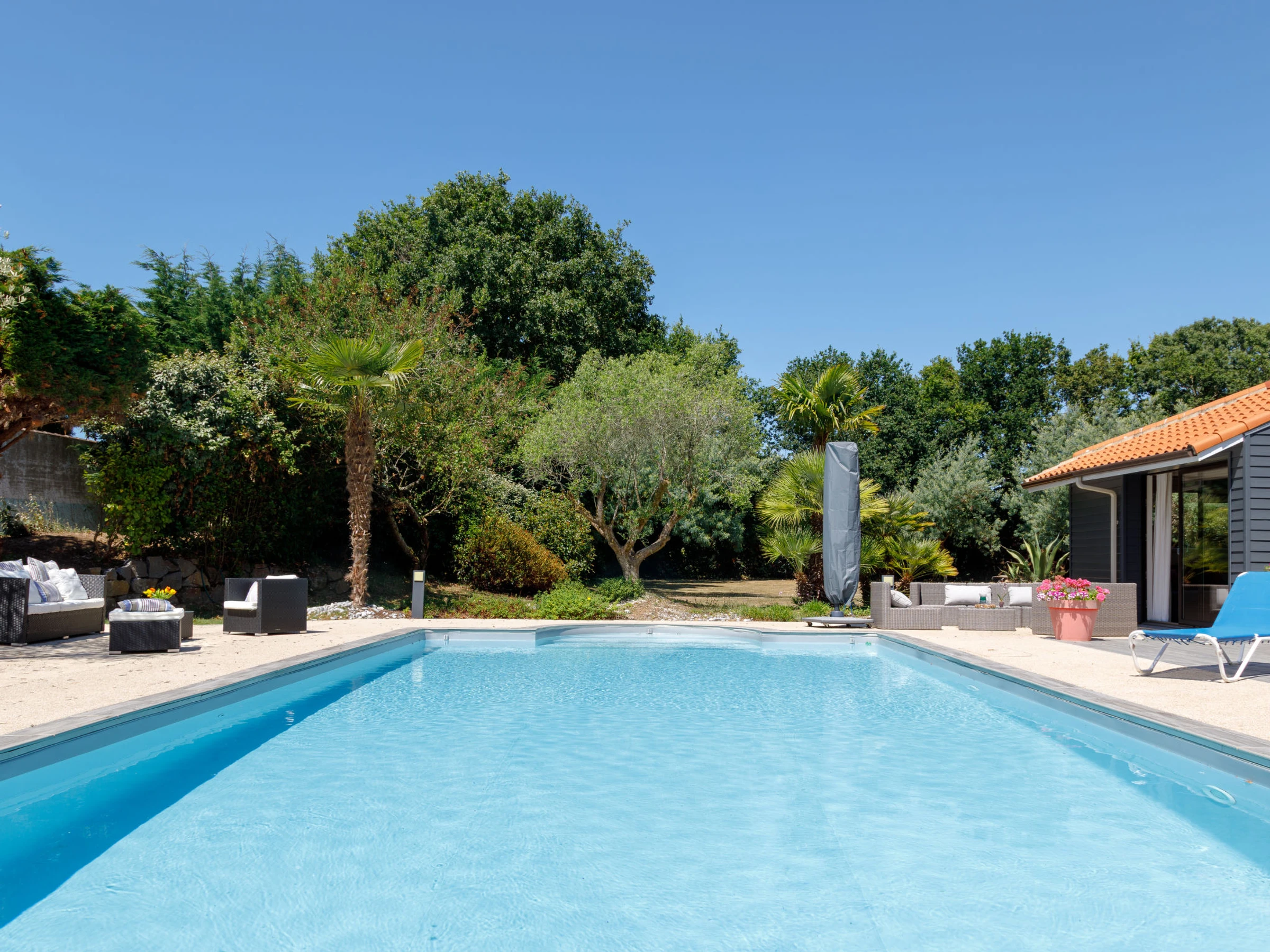 Belle, grande villa "Le Grand Large". Location composée d'un bâtiment principal et d'une annexe, dans le quartier de La Fontaine aux Bretons, situation tranquille, ensoleillée, à 900 m de la mer, à 900 m de la plage, dans une impasse, orientée sud. A usage privé: terrain 3'500 m2 (clôturé), jardin entretenu avec pelouse et arbres, piscine chauffée (6 x 11 m, profondeur 120 - 180 cm, disponibilité saisonnière: [hidden] - [hidden] avec protection par couverture de volet. Meubles de jardin, barbecue, place de parking sur le terrain. Magasins 2 km, magasin d'alimentation 2 km, supermarché 2 km, restaurant 2 km, boulangerie 2 km, centre à 40 minutes à pieds, arrêt de bus "La Fontaine aux Bretons" 300 m, gare ferroviaire "Pornic" 3 km, plage de sable "La Fontaine aux Bretons" 900 m (petit[e]), centre thermal "Alliance Pornic Thalasso & Spa" 2 km. Port plaisance 3 km, terrain de golf (18 trous) 7 km, golf miniature 7 km. Attractions à proximité: Pornic Aventure Accrobranche 5 km, Legendia Parc 20 km, Planète Sauvage 28 km, La Baule 46 km, Nantes 48 km, Ile de Noirmoutier 55 km. Les lacs connus sont facilement accessibles: Lac de Saint Viaud 21 km. Région de randonnées: Sentier des Douaniers 900 m.
