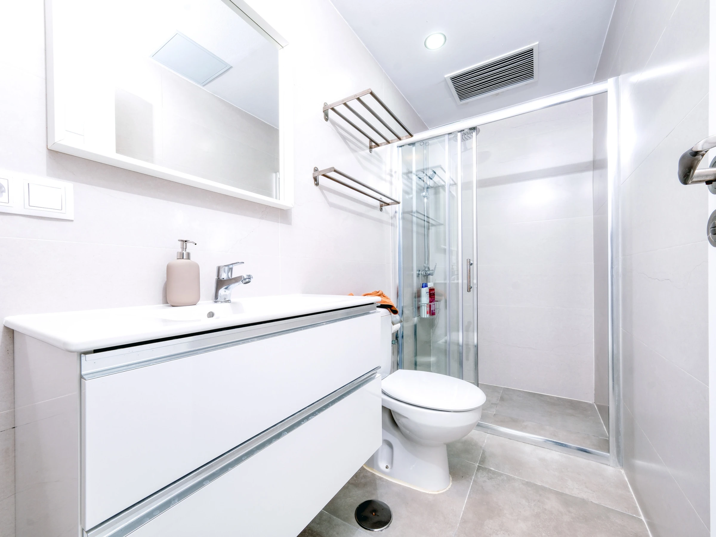 La salle de bain suit la même ligne de modernité et de fonctionnalité, avec une douche spacieuse, un lavabo avec miroir éclairé et un rangement suffisant pour les articles de toilette et un sèche-cheveux. Son design minimaliste apporte une sensation de propreté et de fraîcheur, complétant le style du reste de la résidence.