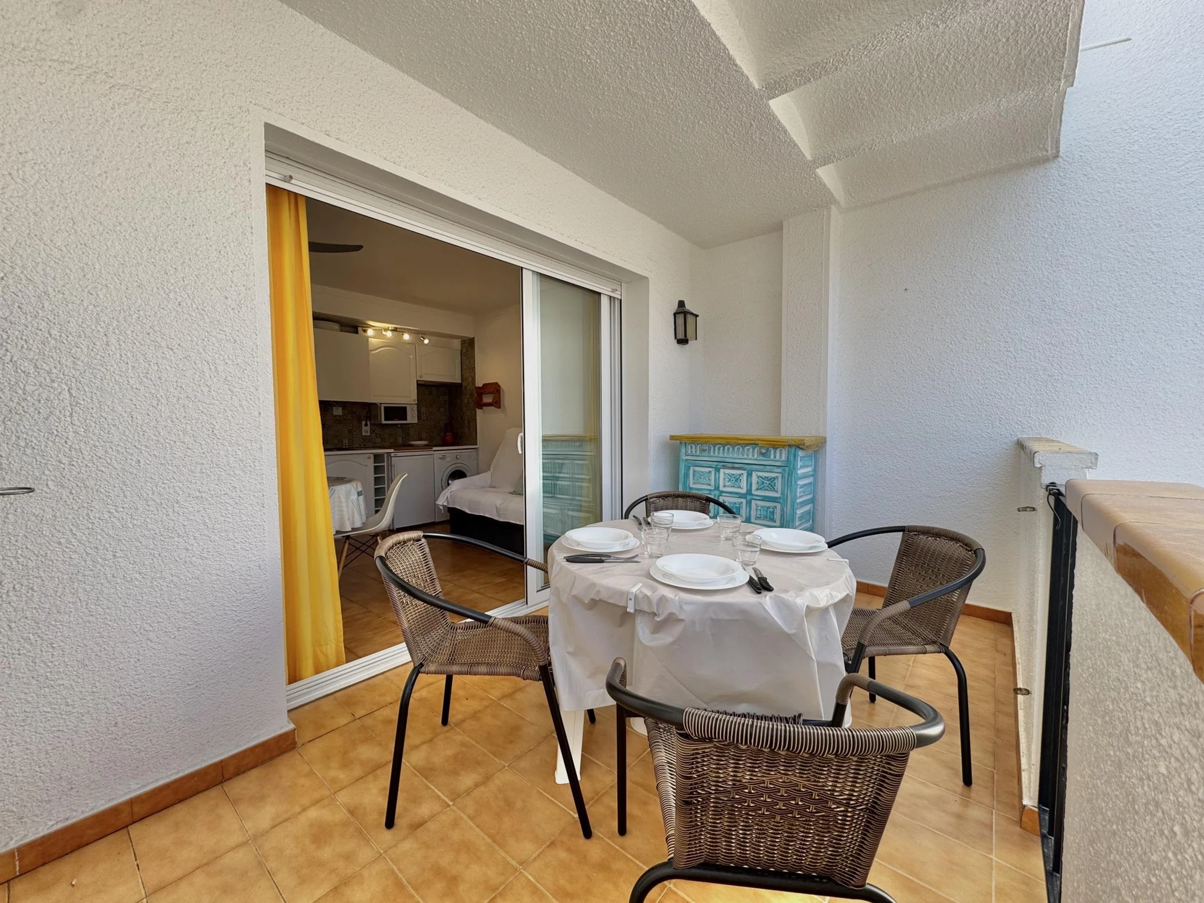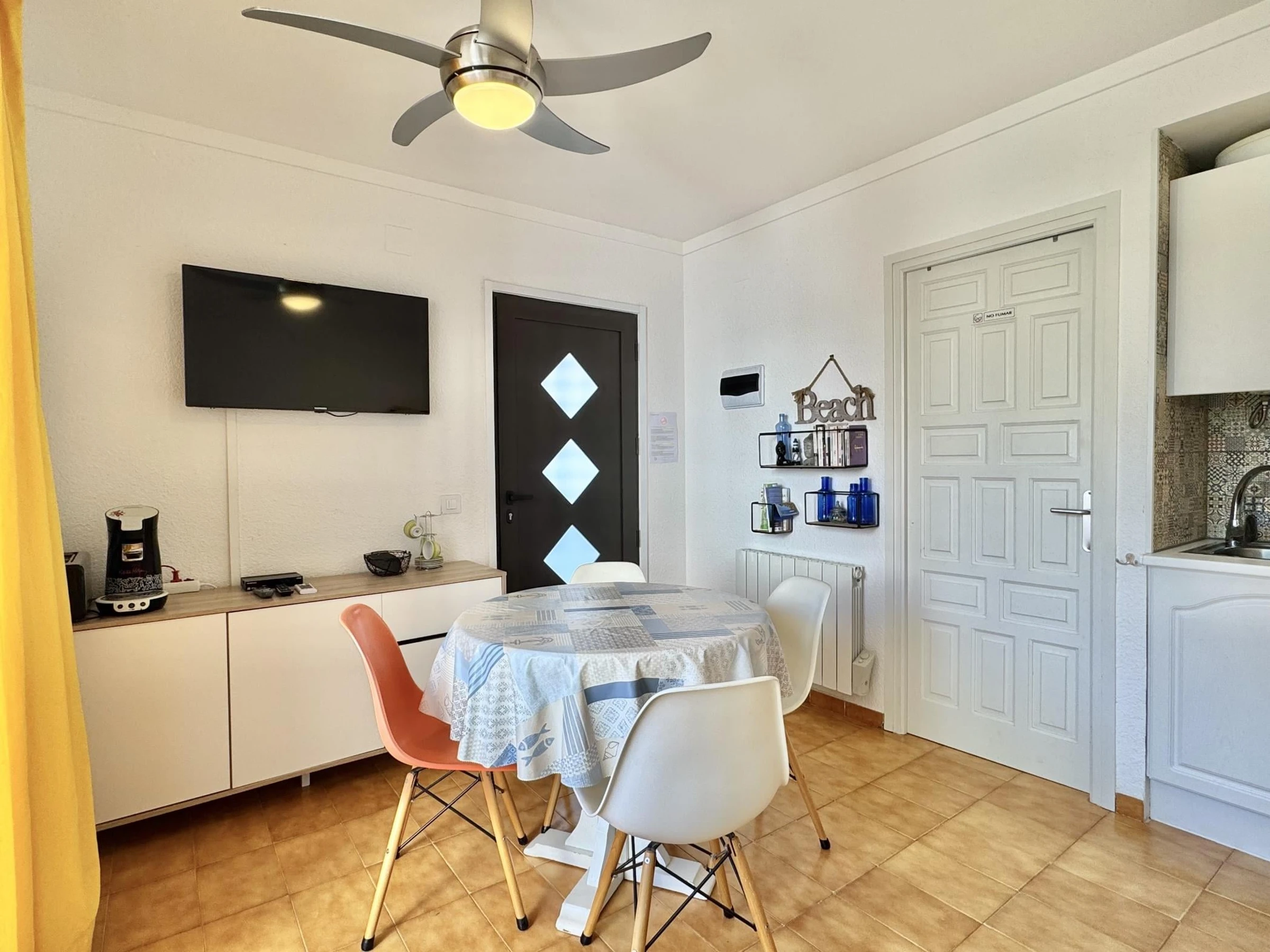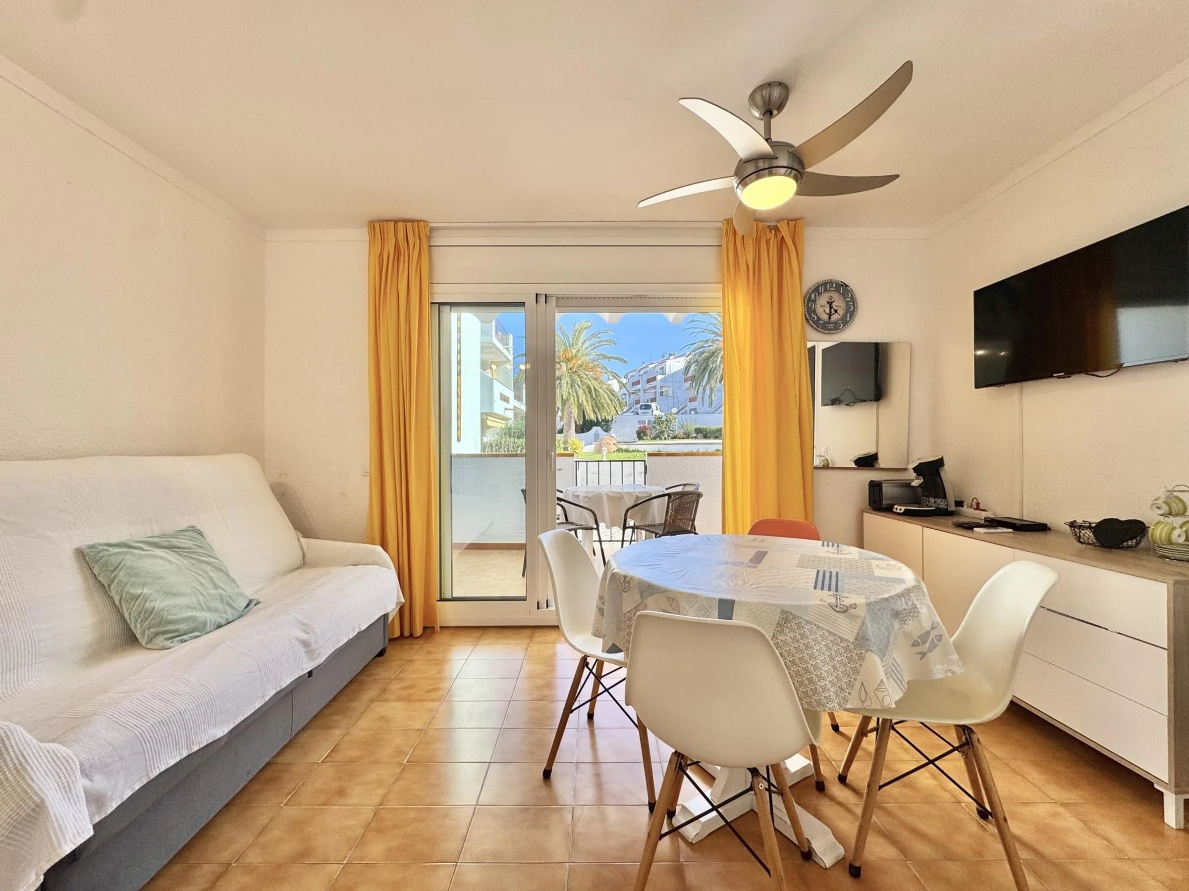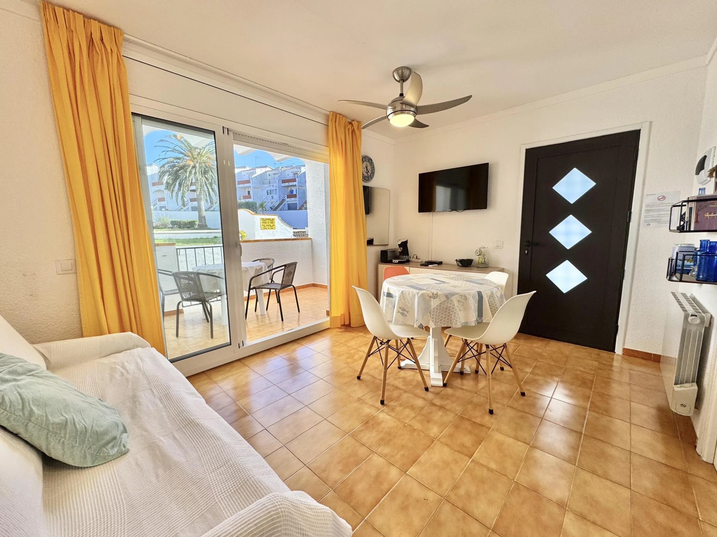 * Salle à manger avec canapé-lit de 135 cm et TV (chaînes espagnoles et TNT SAT pour les chaînes françaises) + ventilateur de plafond.