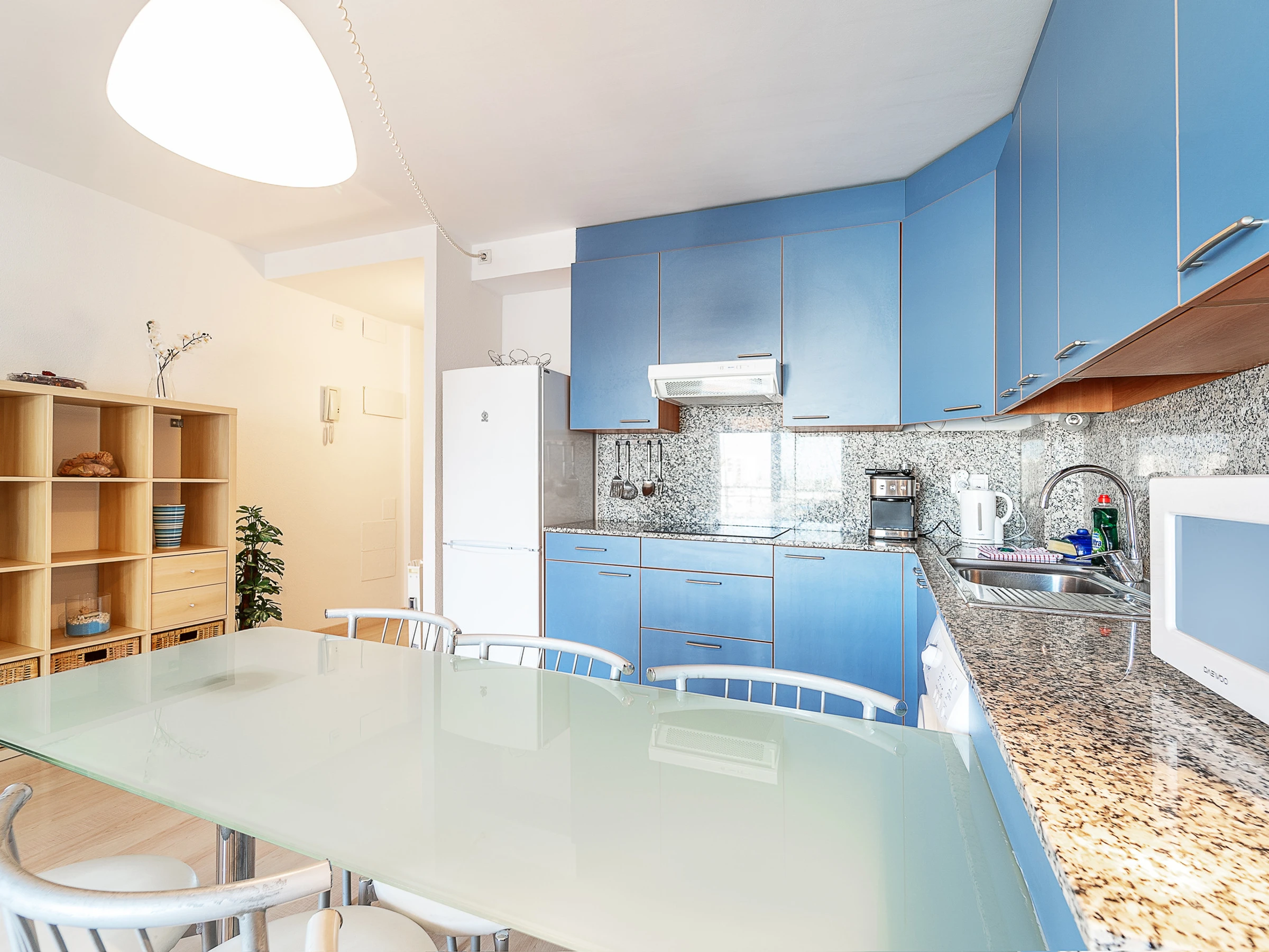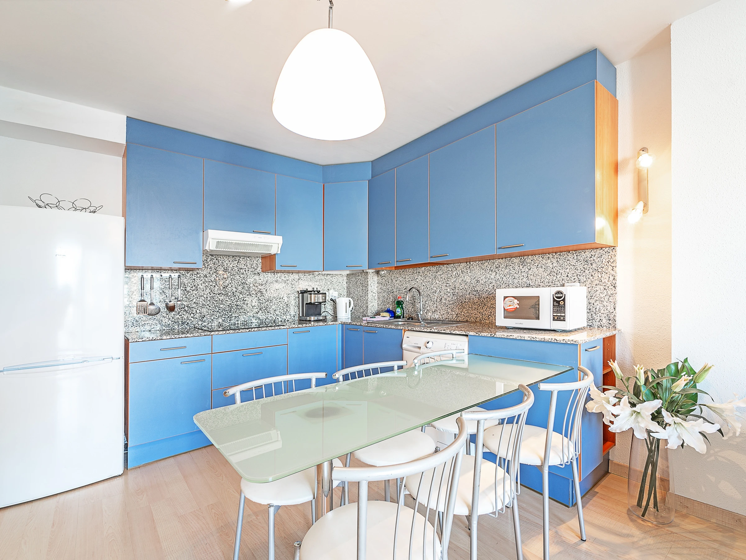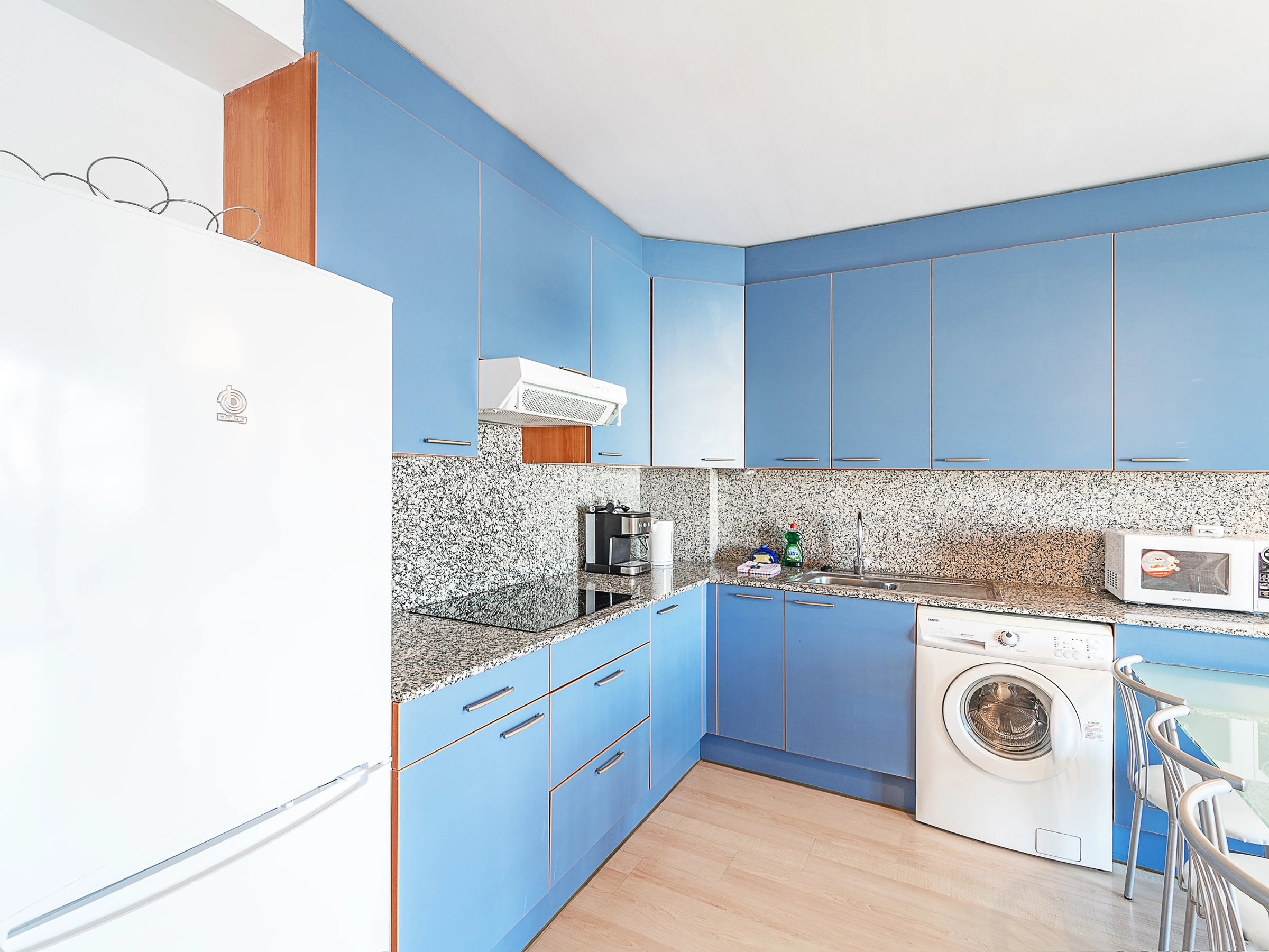 Cuisine entièrement équipée, avec réfrigérateur, congélateur, micro-ondes, plaque vitrocéramique, bouilloire, presse-agrumes, cafetière et grille-pain