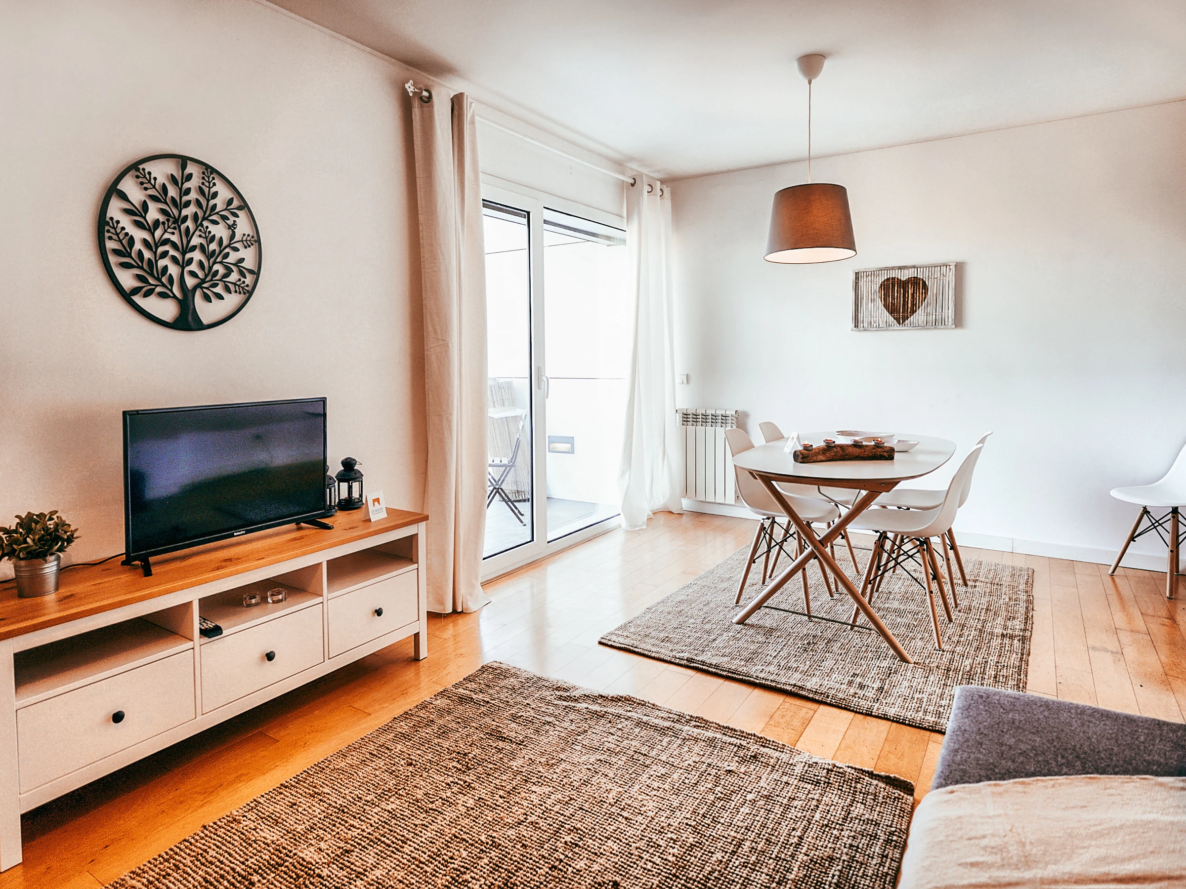 Grande salle avec canapé-lit, télévision et espace repas