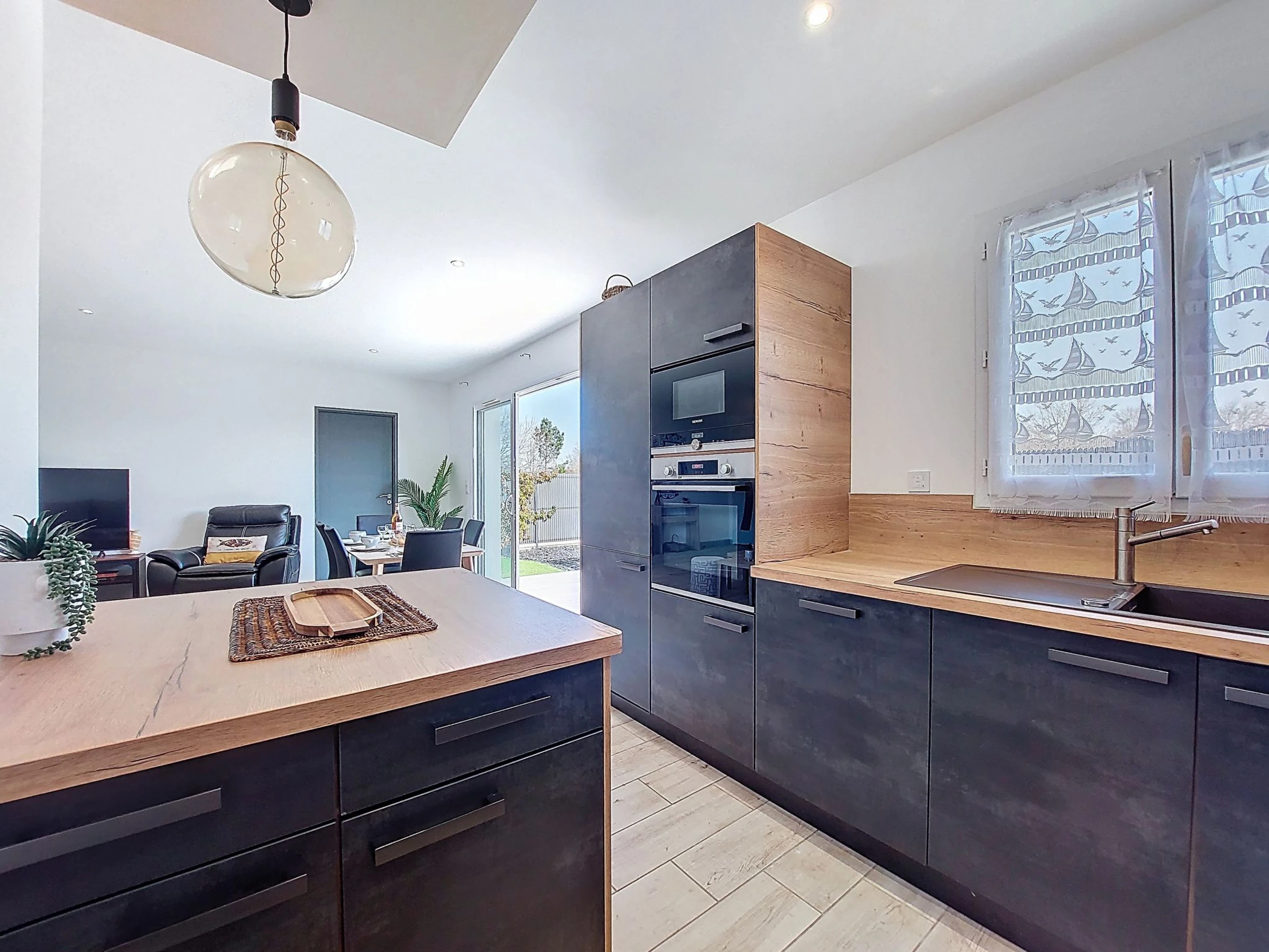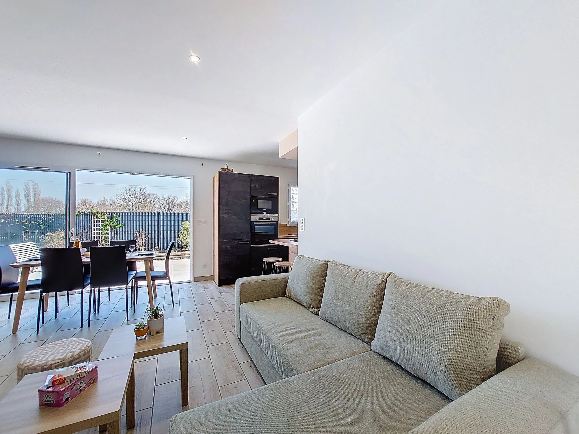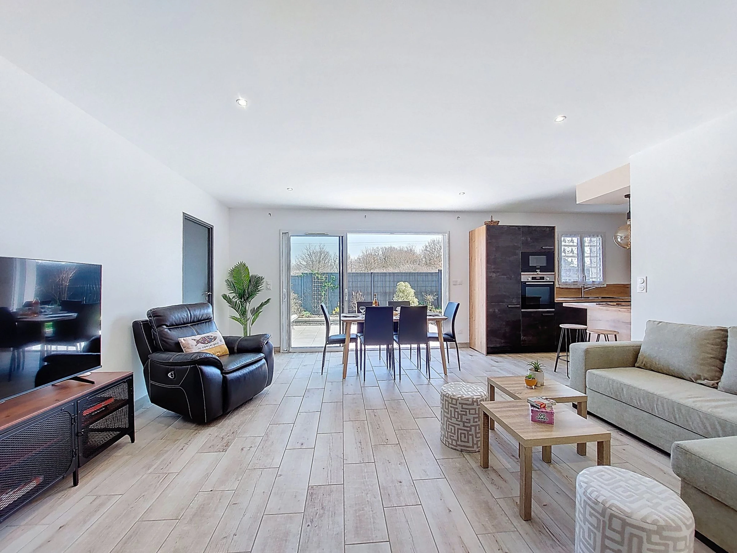 Maison mitoyenne 4 pièces 94 m2, situation sud-ouest. Aménagement moderne: séjour/salle à manger avec TV (écran plat), air-conditionné. Sortie sur la terrasse. 1 chambre avec 1 grand-lit (1 x 160 cm, longueur 190 cm). 1 chambre avec 1 grand-lit (1 x 140 cm, longueur 190 cm). 1 chambre avec 2 lits (90 cm, longueur 190 cm). Cuisine ouverte (four, lave-vaisselle, 3 plaques à induction, grille-pain, bouilloire électrique, micro-ondes, congélateur, cafetière électrique). Douche, WC séparé. Grande terrasse 60 m2. Meubles de terrasse, barbecue électrique. A disposition: lave-linge, chaise haute pour enfant, lit bébé. Internet (Connexion WIFI, gratuit). Place de parking (2 Voitures). Veuillez noter: maximum 1 animal/ chien autorisé. Détecteur de fumée. Annonce d'un particulier (art 155, IV du CGI).
