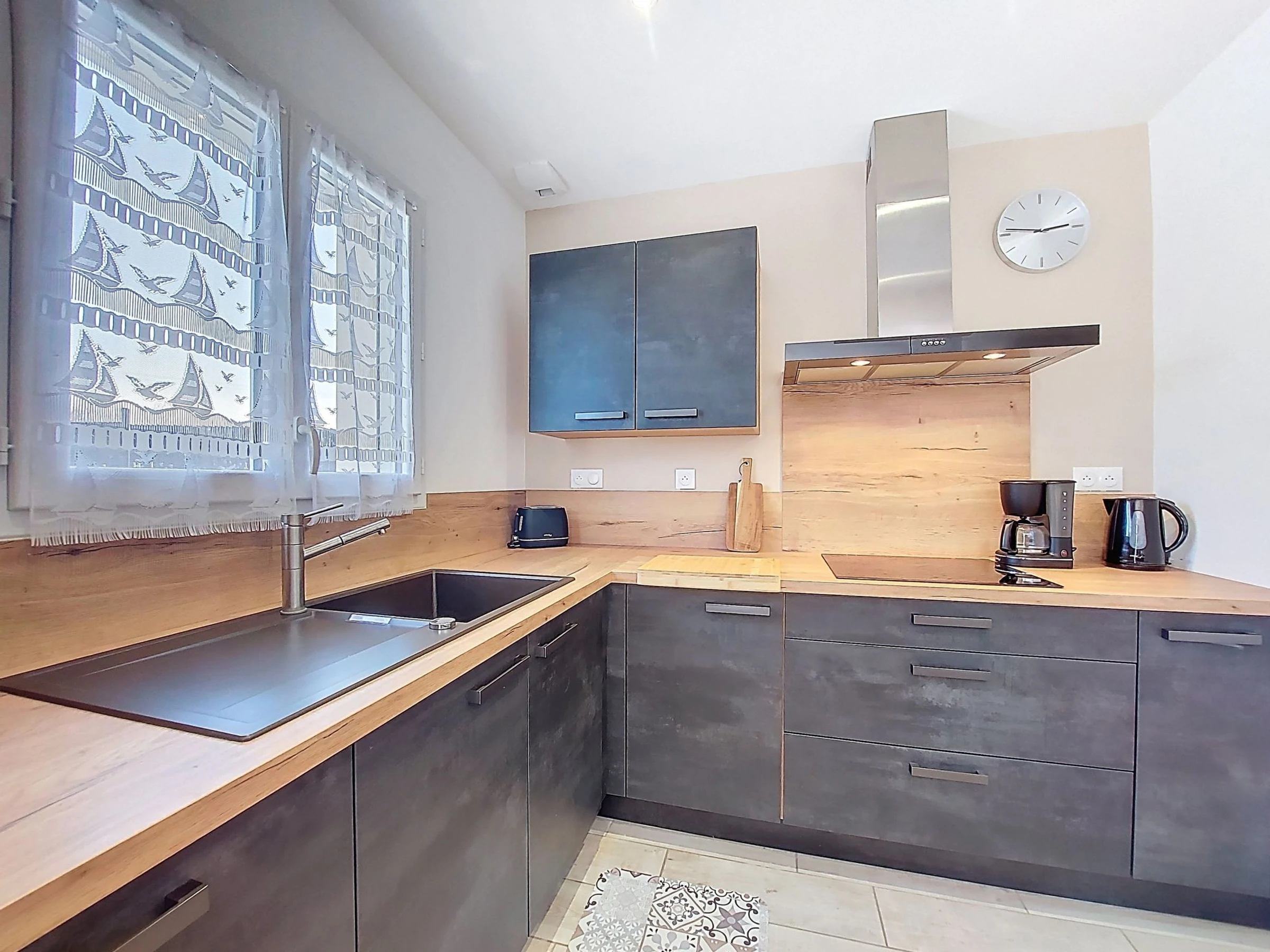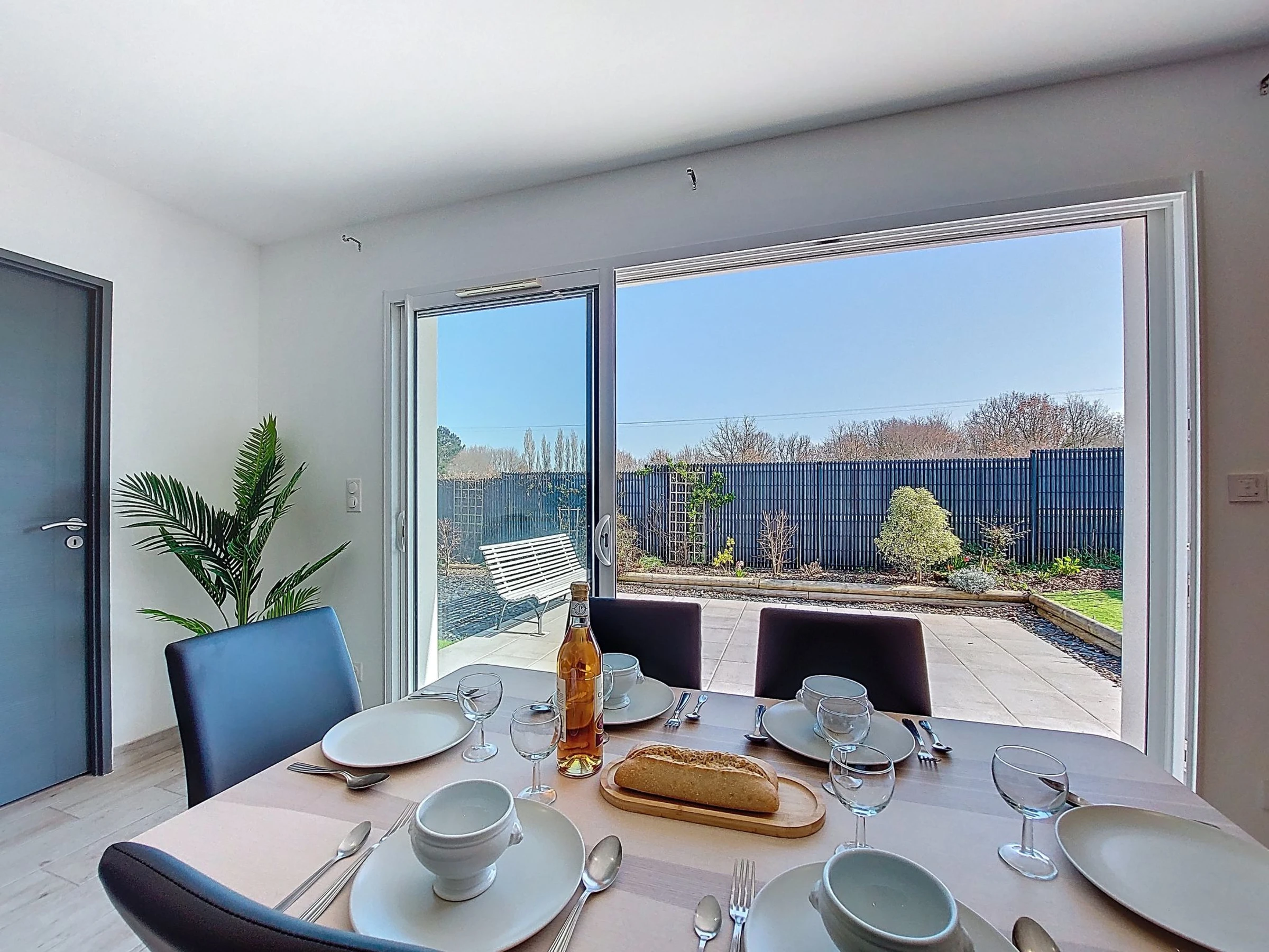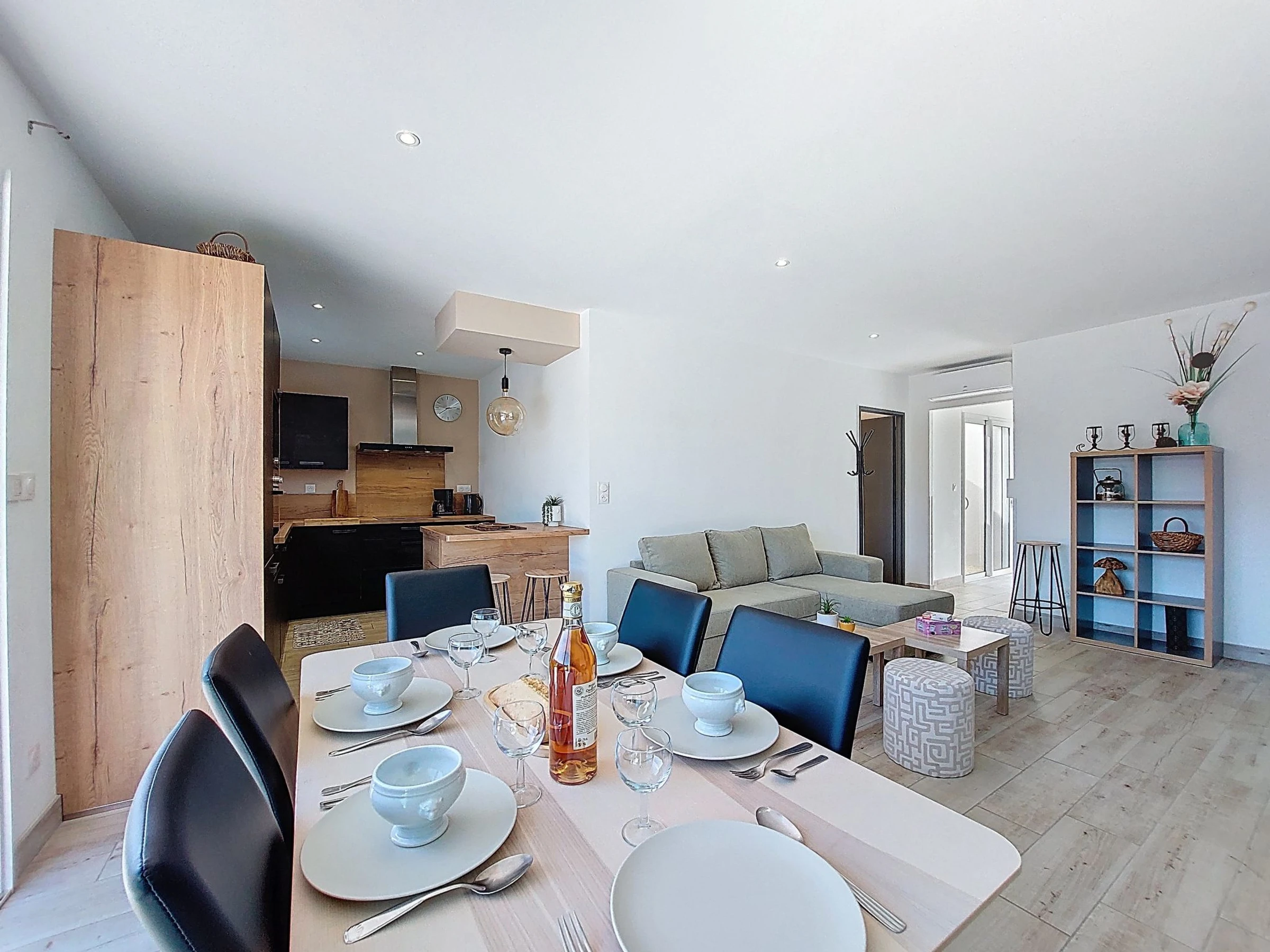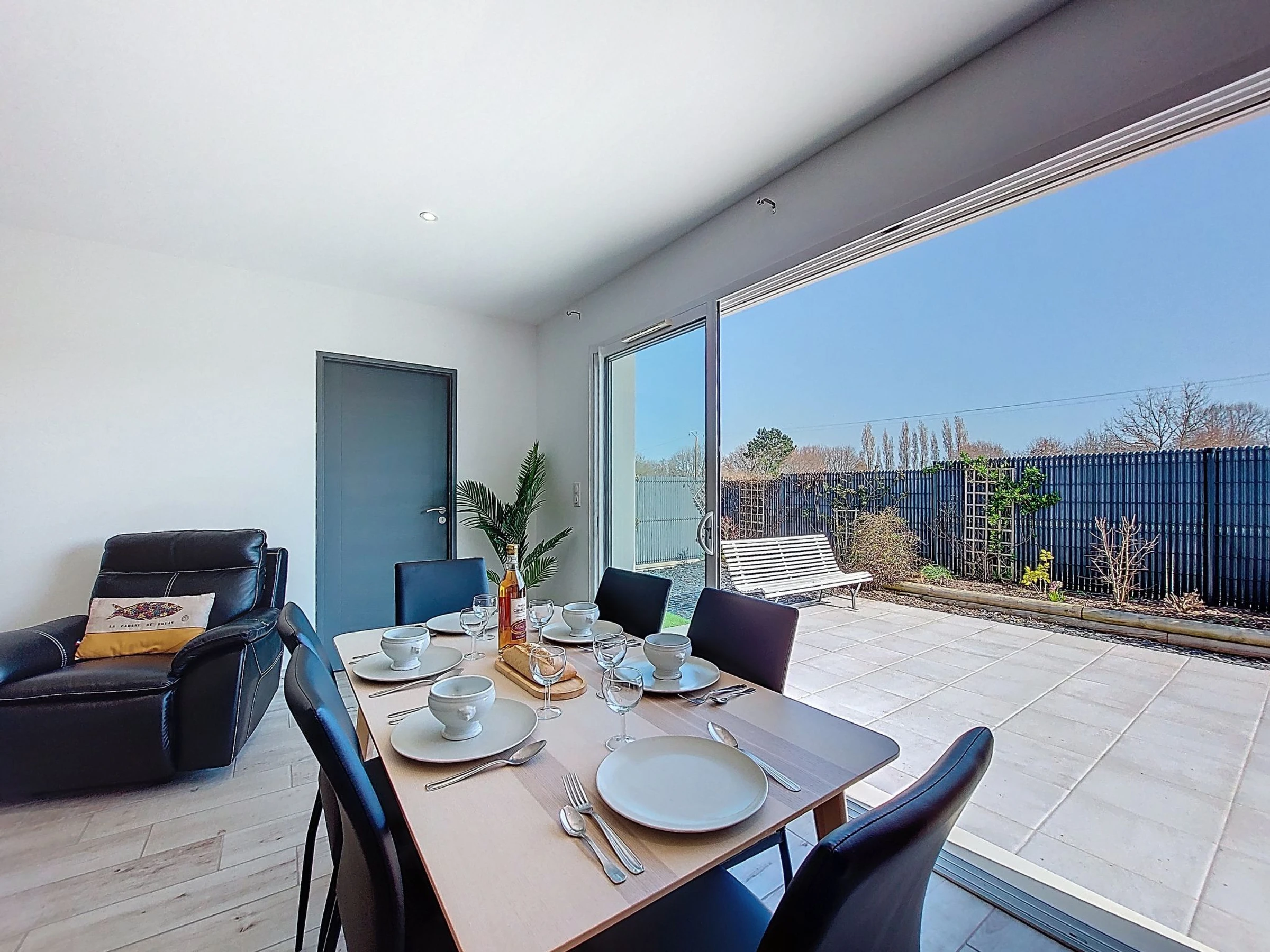 Maison mitoyenne 4 pièces 94 m2, situation sud-ouest. Aménagement moderne: séjour/salle à manger avec TV (écran plat), air-conditionné. Sortie sur la terrasse. 1 chambre avec 1 grand-lit (1 x 160 cm, longueur 190 cm). 1 chambre avec 1 grand-lit (1 x 140 cm, longueur 190 cm). 1 chambre avec 2 lits (90 cm, longueur 190 cm). Cuisine ouverte (four, lave-vaisselle, 3 plaques à induction, grille-pain, bouilloire électrique, micro-ondes, congélateur, cafetière électrique). Douche, WC séparé. Grande terrasse 60 m2. Meubles de terrasse, barbecue électrique. A disposition: lave-linge, chaise haute pour enfant, lit bébé. Internet (Connexion WIFI, gratuit). Place de parking (2 Voitures). Veuillez noter: maximum 1 animal/ chien autorisé. Détecteur de fumée. Annonce d'un particulier (art 155, IV du CGI).