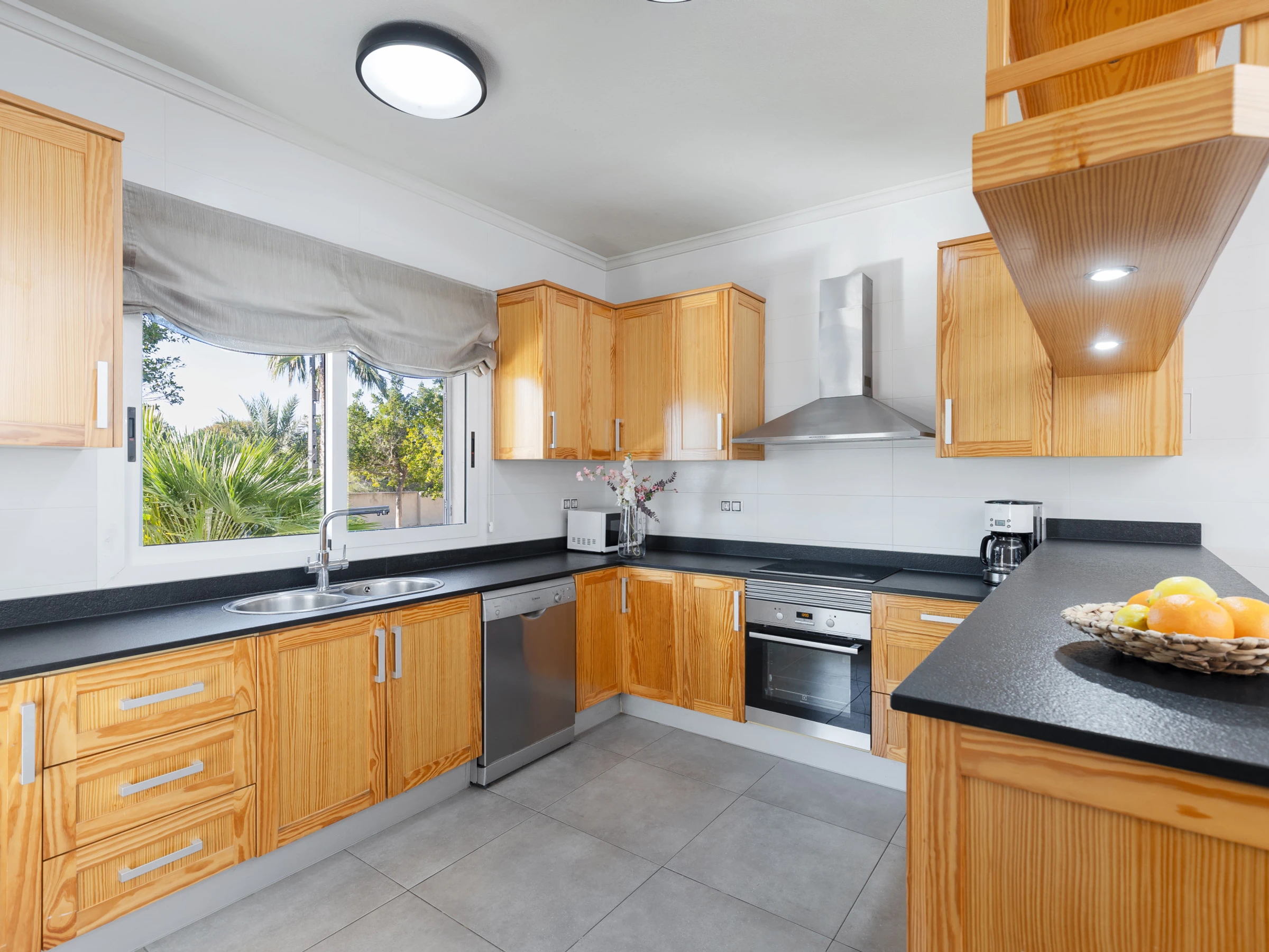 La villa dispose d'un court de tennis, d'une piscine et d'un barbecue privé, avec un grand jardin, idéal pour les fêtes. Des vestiaires avec salle de bain sont situés dans la zone de la piscine, sans qu'il soit nécessaire d'entrer dans la villa. La climatisation et les ventilateurs de plafond dans le reste de la maison sont idéaux par temps chaud. À l'intérieur, nous pouvons trouver au rez-de-chaussée une cuisine entièrement équipée avec îlot et salle à manger, buanderie, salle à manger principale et gazebo et un deuxième salon avec superbe cheminée, salle de bain et deux chambres, une autre salle de jeux avec table.