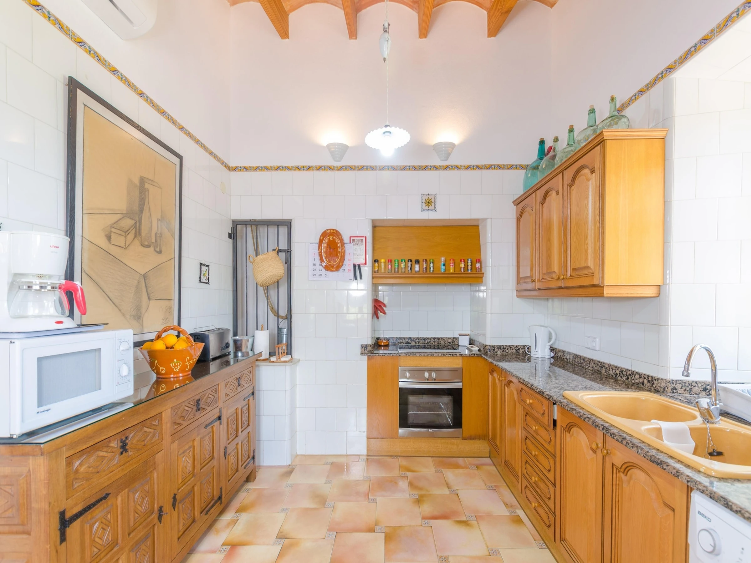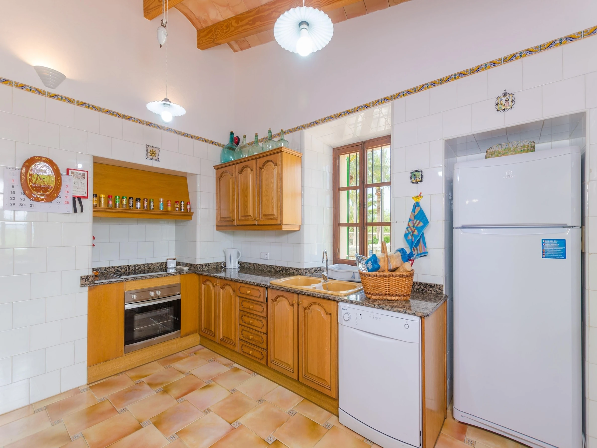 La cuisine, est équipée avec réfrigérateur, micro-ondes, four, lave-vaisselle et cafetière.
