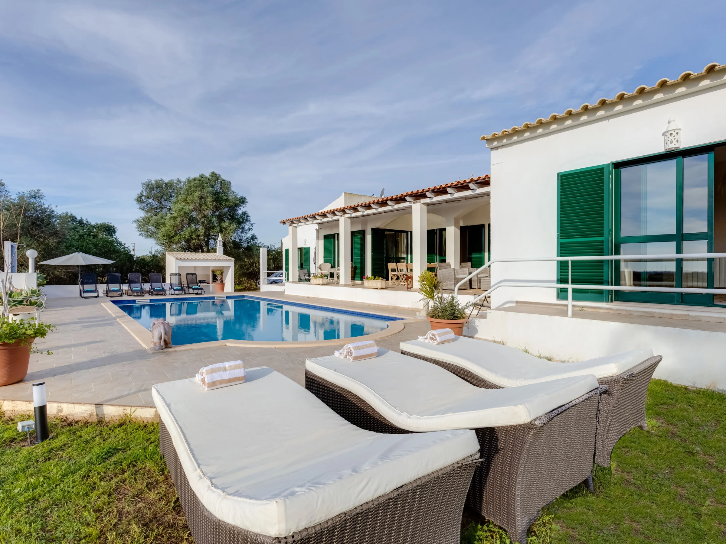• Piscine Privée Exclusive : Grande piscine (12m x 6m) à usage exclusif des hôtes, entourée de transats et de mobilier d'extérieur.