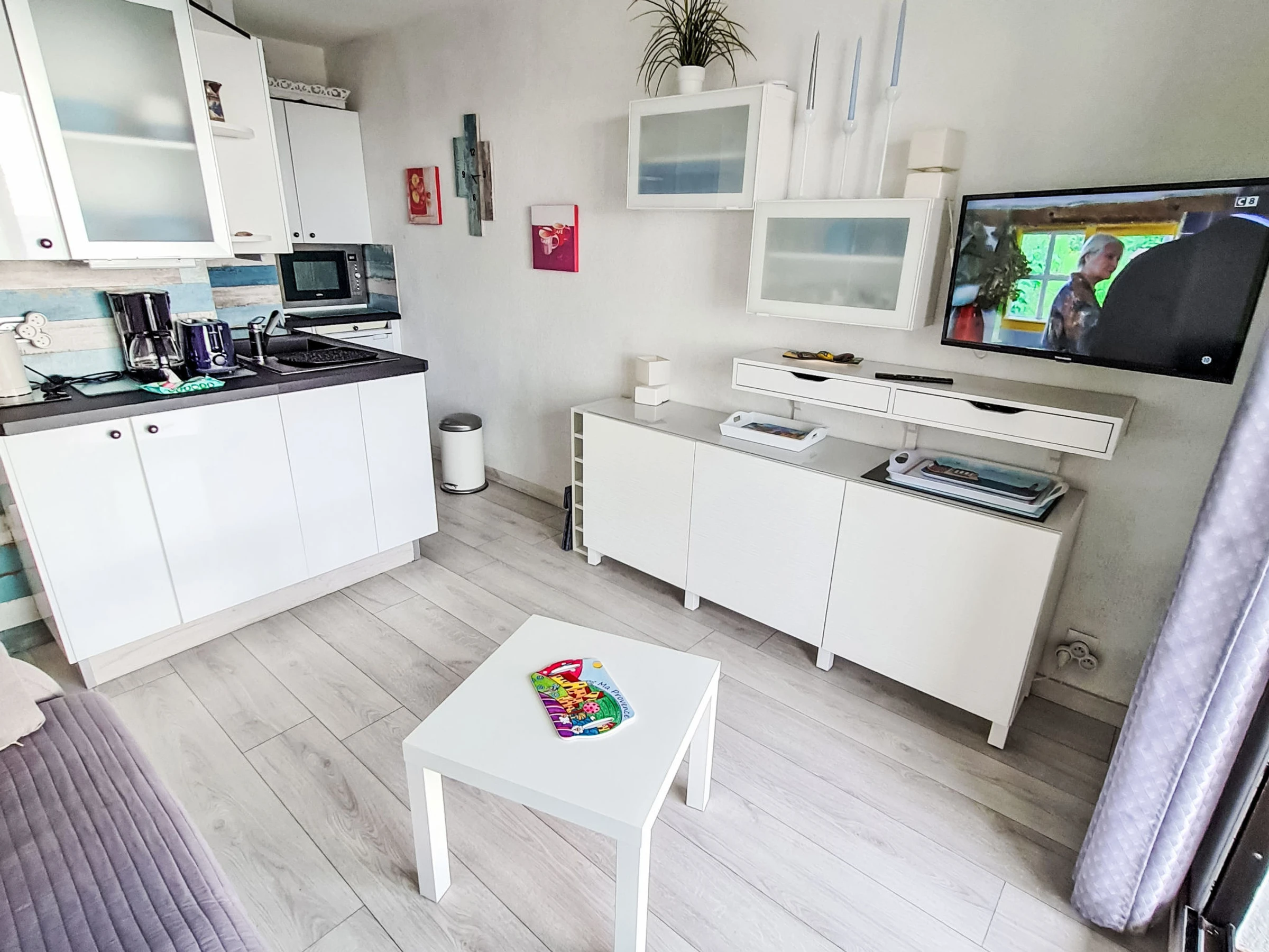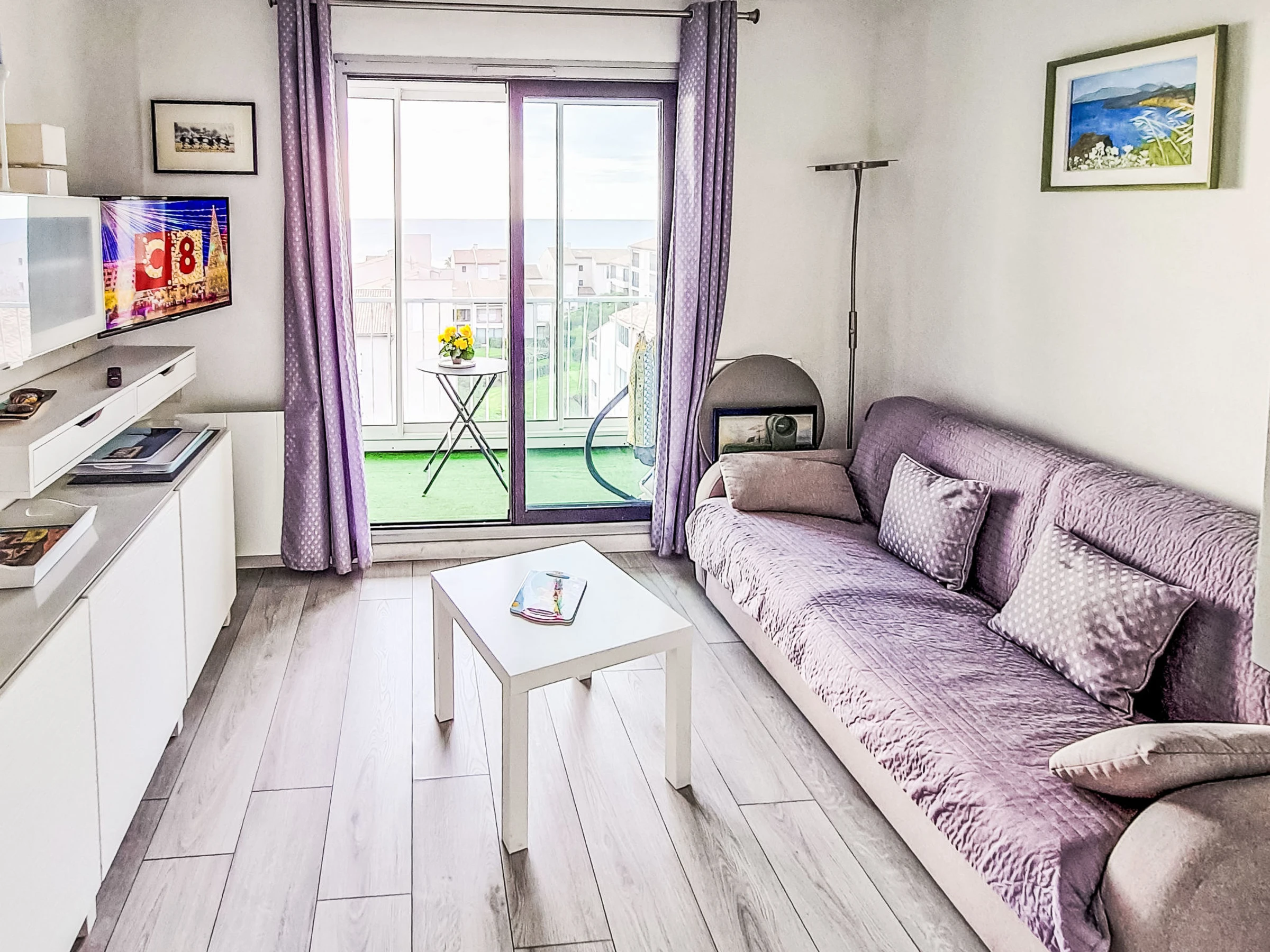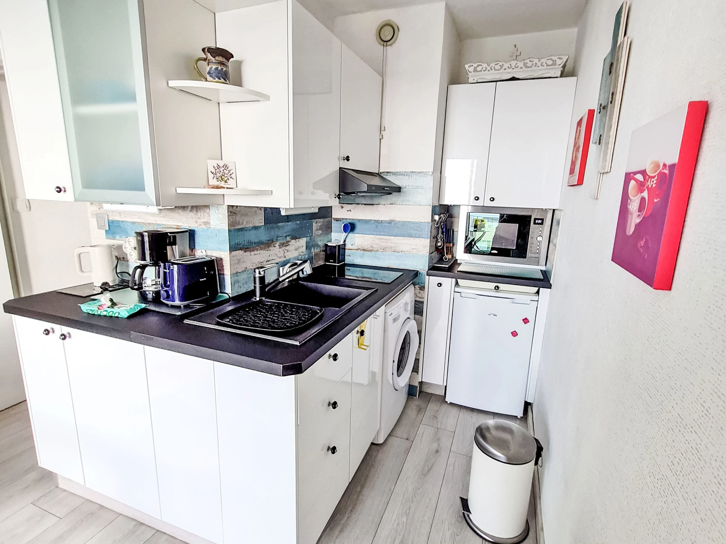 "Le Verdon", apt 2 pièces 28 m2 au 5ème étage. Rénové, aménagement confortable: séjour/salle à manger avec TV (écran plat). Sortie sur la véranda. 1 chambre avec 1 grand-lit (1 x 140 cm, longueur 190 cm). Coin cuisine (2 plaques de cuisson, four, grille-pain, bouilloire électrique, congélateur, cafetière électrique, Capsules pour machine à café (NESPRESSO) (NON INCLUSES), combiné micro-ondes). Douche, WC séparé. Chauffage électrique. Meubles de terrasse, loggia. Belle vue sur la mer. Place de parking. Veuillez noter: TV seulement FR. Annonce d'un particulier (art 155, IV du CGI).