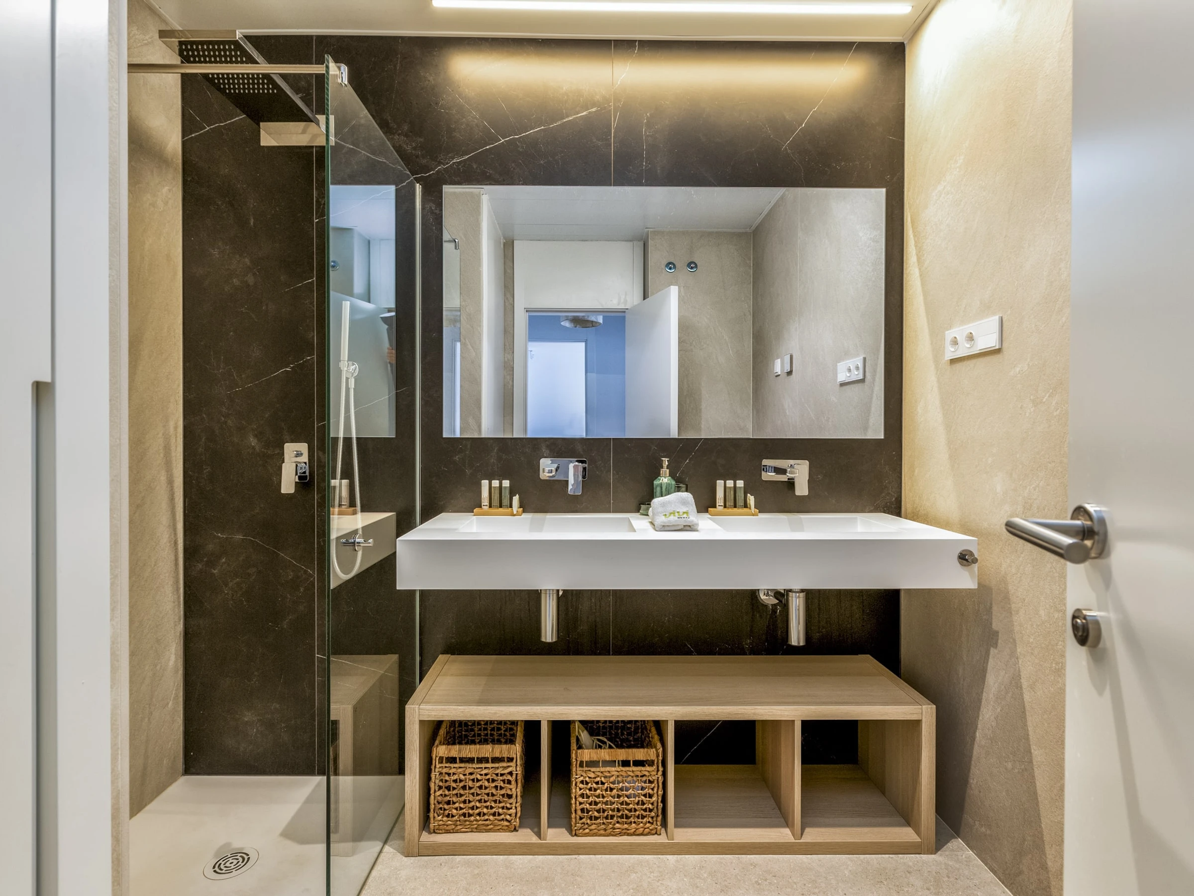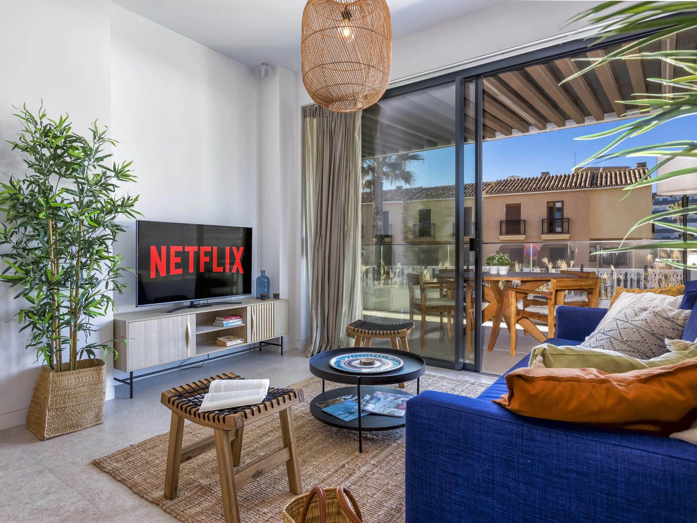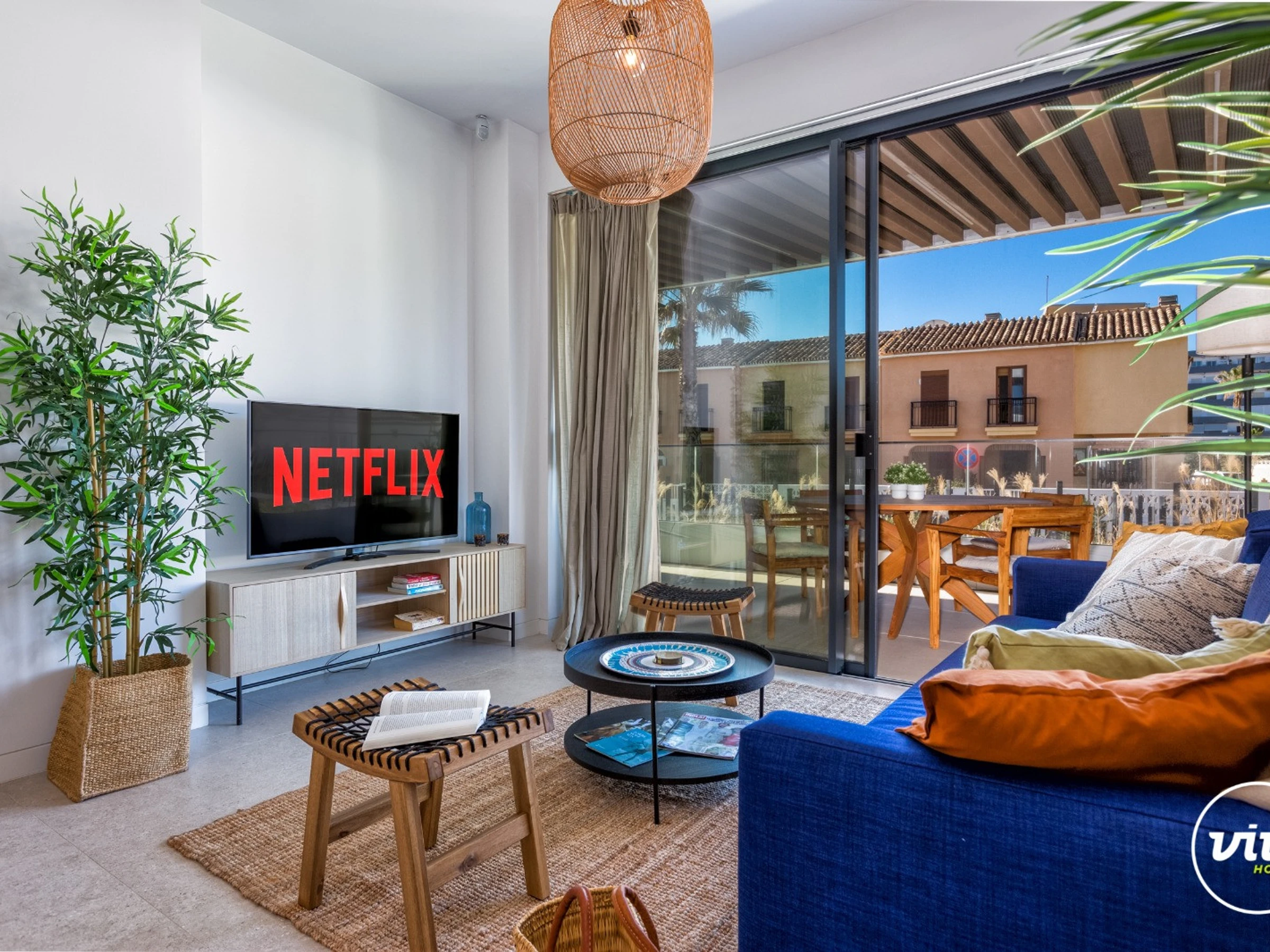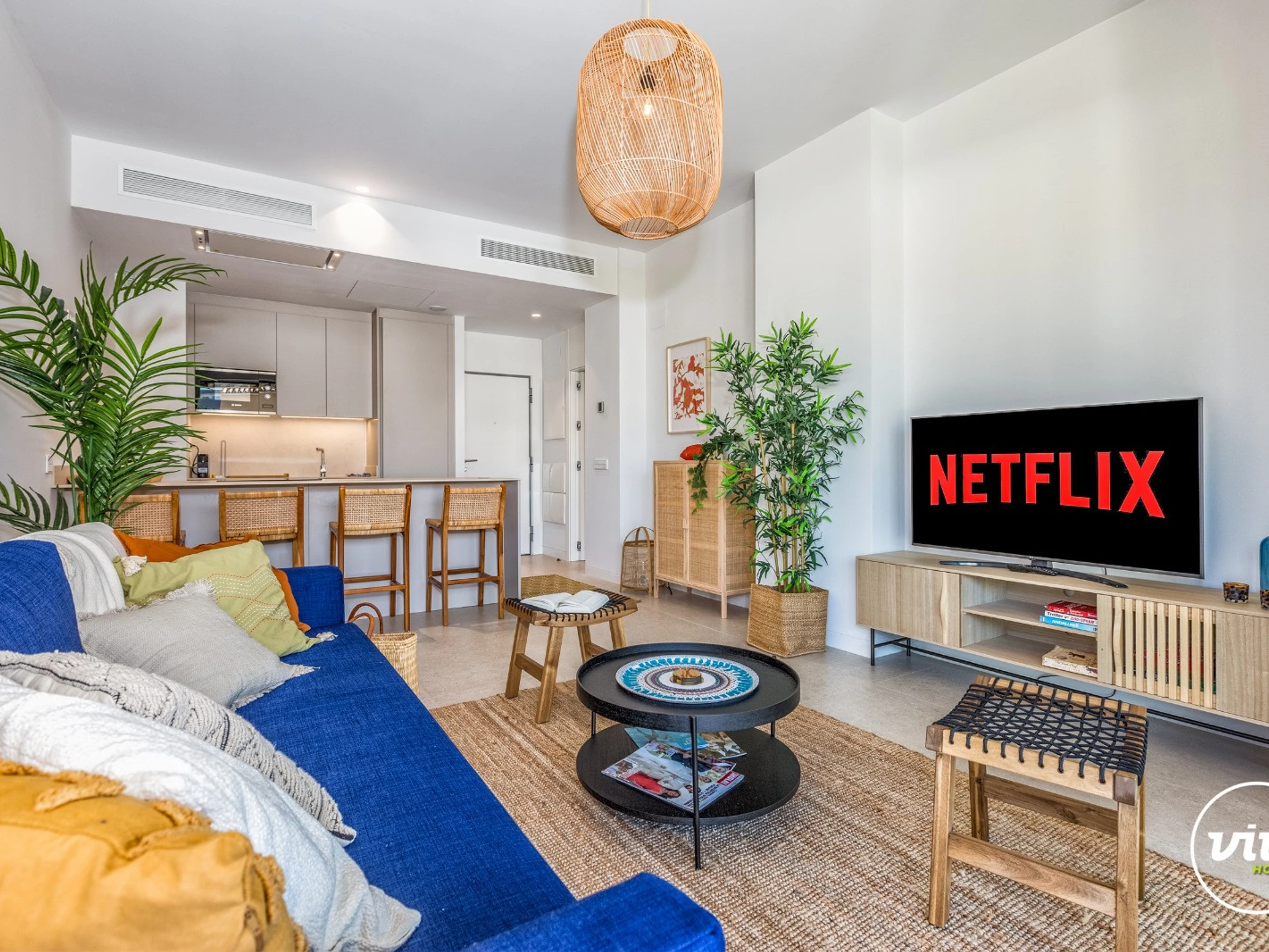 Elle dispose de ascenseur, mobilier de jardin, clôture, 22 m² de terrasse, lave-linge, coffre-fort, accès internet (wifi), sèche-cheveux, salle de sport, chauffage central, climatisation dans tout le logement, piscine collective+infantile, garage même bâtiment, 1 Télévision.