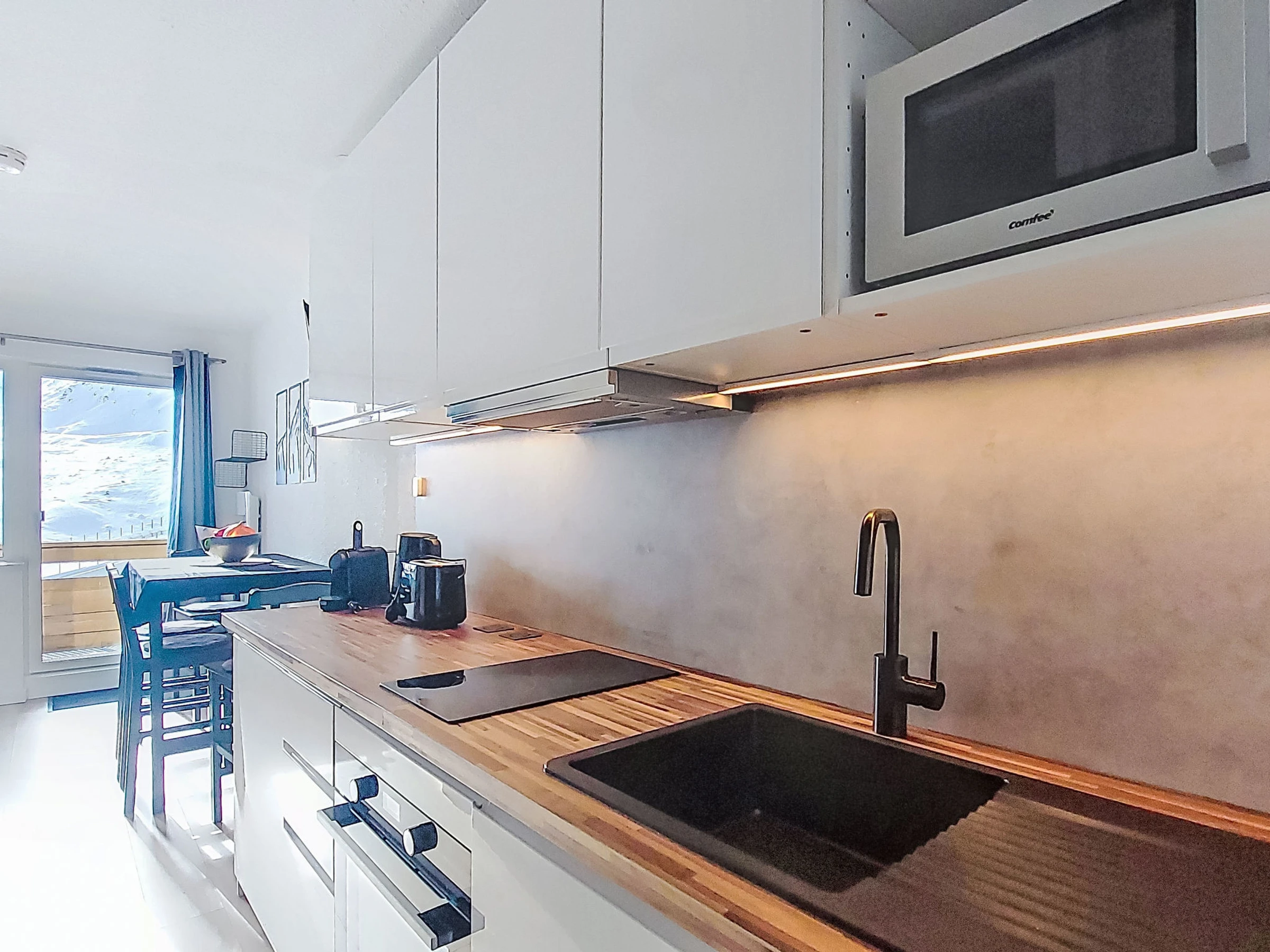 Studio 22 m2 au 4ème étage, situation sud. Complètement rénové en 2025, aménagement très moderne et luxueux: séjour/salle à manger avec 1 divan-lit double (1 x 140 cm, longueur 190 cm), TV et radiateur. Sortie sur le balcon, orientée sud. Cabine avec 1 x 2 lits superposés (80 cm, longueur 190 cm). Coin cuisine (four, lave-vaisselle, 2 plaques à induction, grille-pain, bouilloire électrique, micro-ondes, cafetière électrique, Capsules pour machine à café (Nespresso) (NON INCLUSES)). Salle de bains, WC séparé. Chauffage électrique. Sol en parquet. Petit balcon 3 m2, situation sud. Très belle vue panoramique sur les montagnes, les pistes de ski et la localité. A disposition: chaise haute pour enfant, lit bébé (en sus). Internet (Connexion WIFI, en sus). Veuillez noter: logement non-fumeur. Détecteur de fumée. Annonce d'un particulier (art 155, IV du CGI). [hidden]