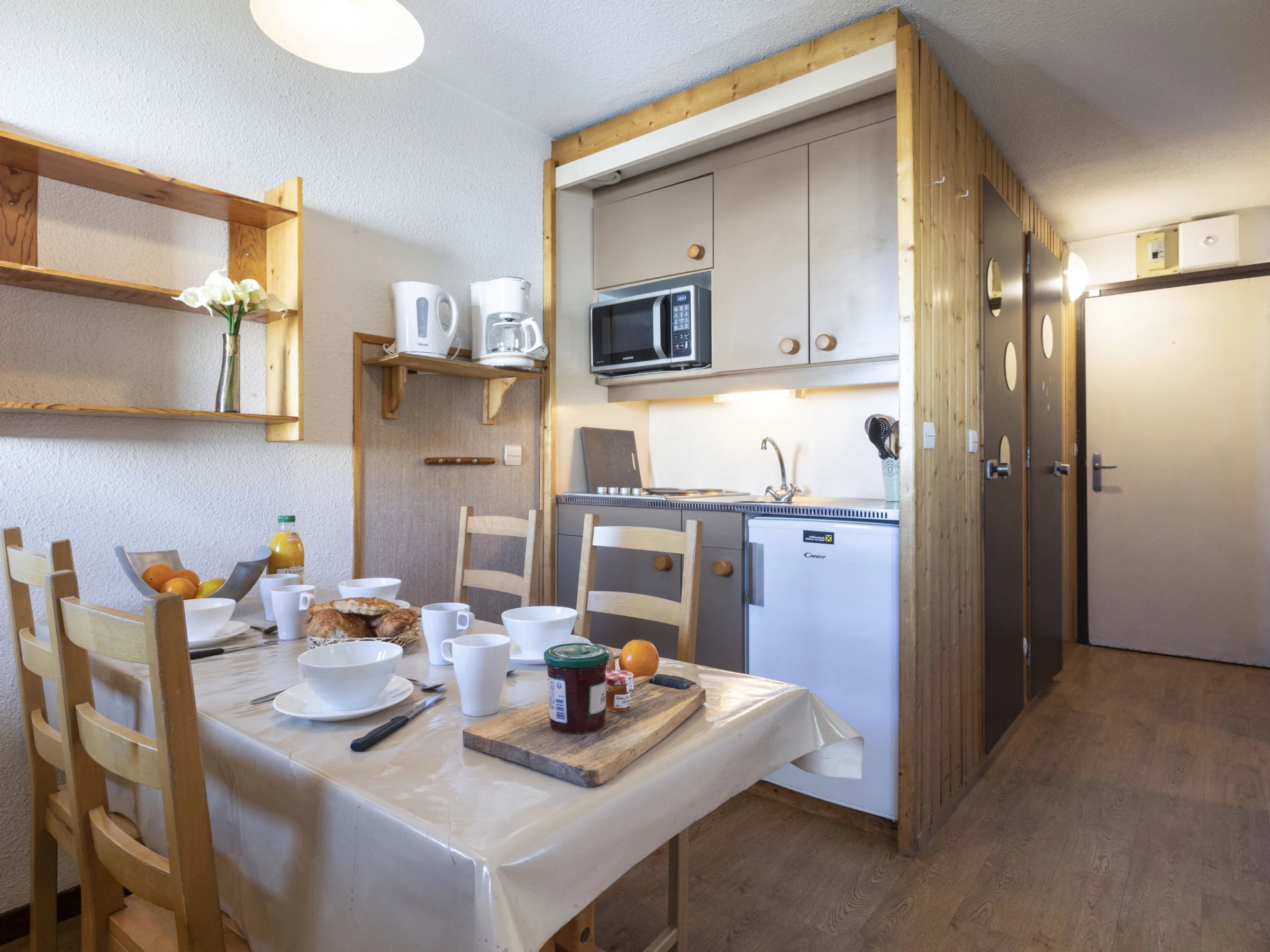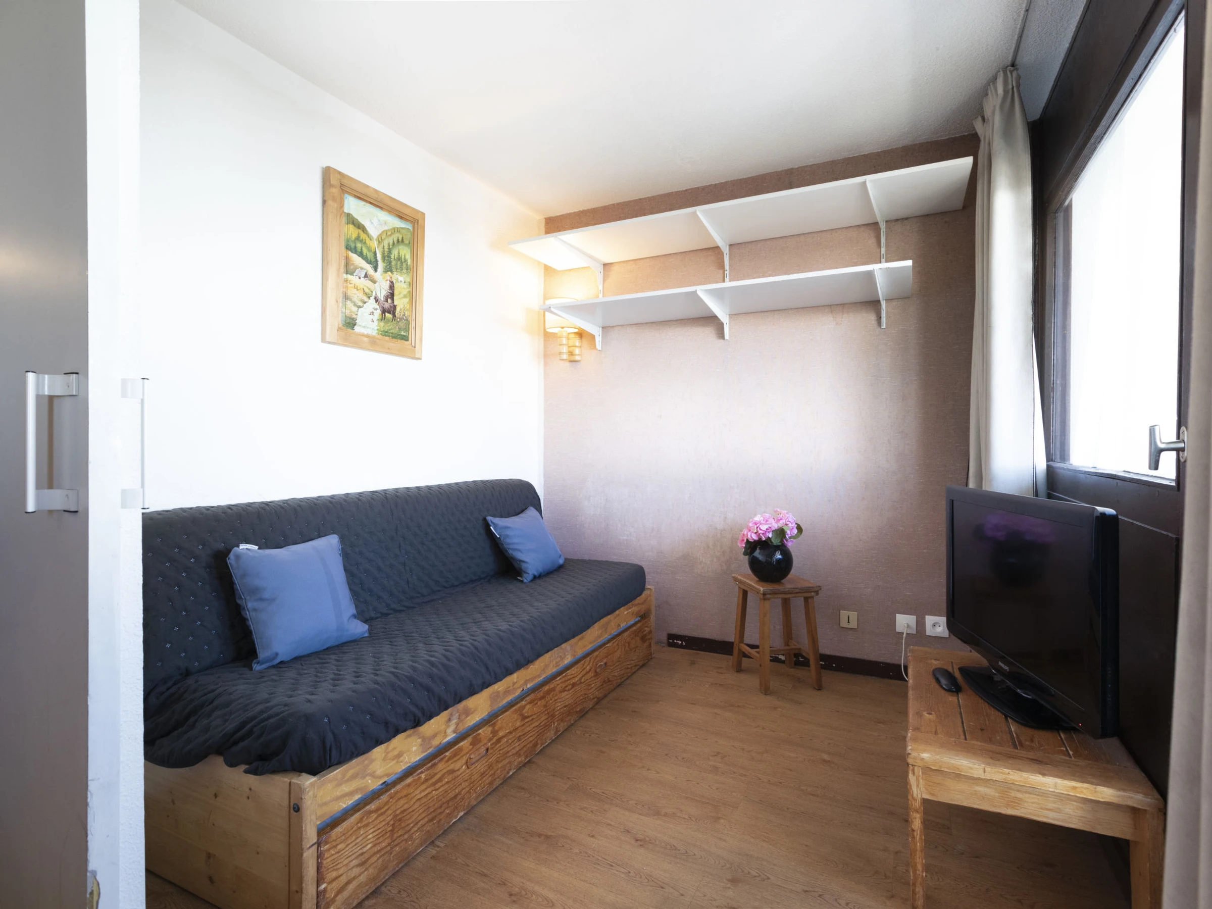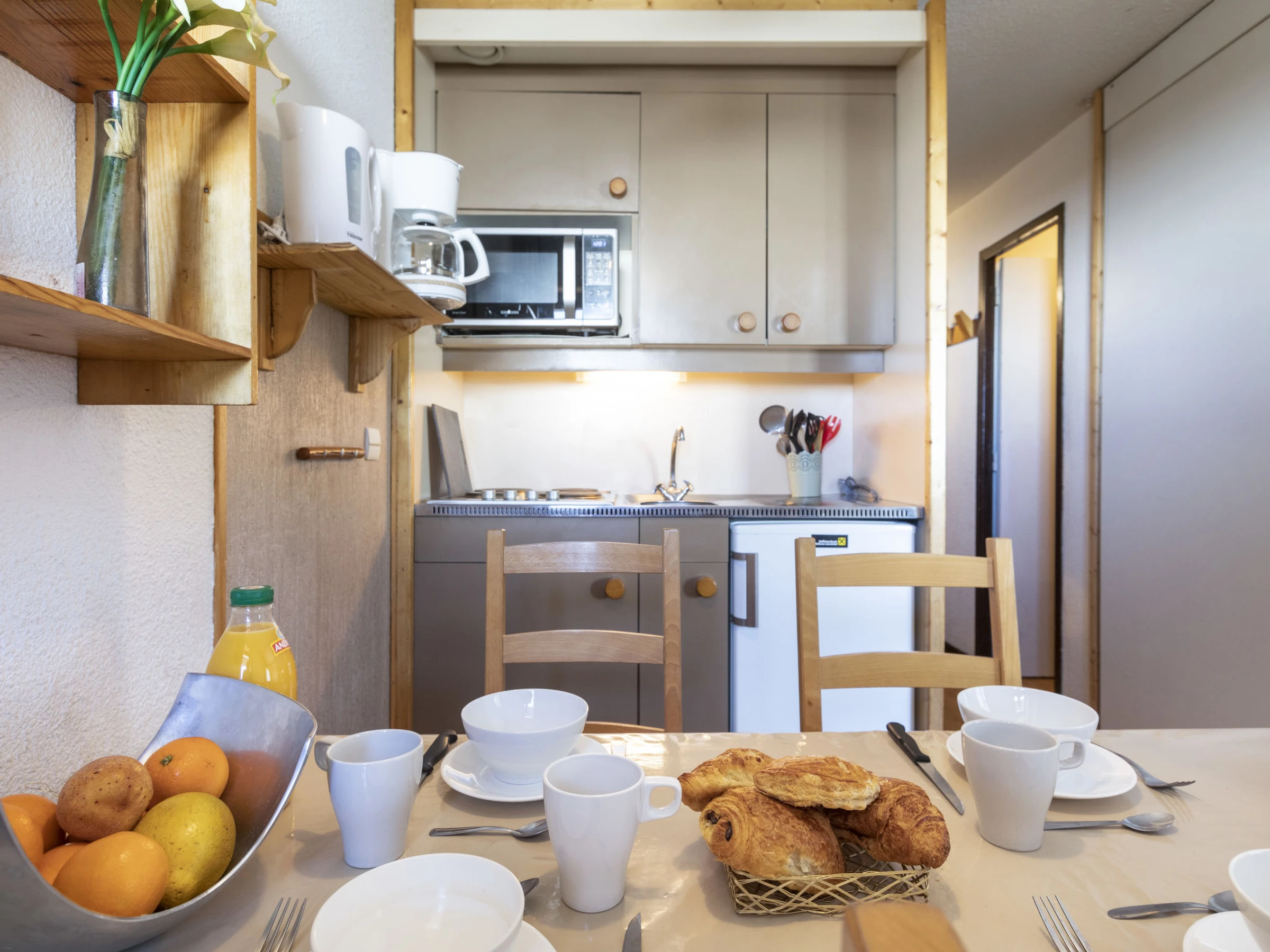 "Arcelle 308", apt 2 pièces 22 m2 au 3ème étage, situation sud-ouest. Clair, partiellement rénové en 2024: séjour/salle à manger avec radiateur électrique. 1 petite chambre 6 m2 avec porte coulissante avec 1 lit gigogne (2 pers. 2 x 80 cm, longueur 190 cm), TV (écran plat). Sortie sur la véranda, orientée sud-ouest. Cabine avec 1 x 2 lits superposés (80 cm, longueur 190 cm). Coin cuisine (4 plaques de cuisson, bouilloire électrique, cafetière électrique, combiné micro-ondes) avec table pour les repas, radiateur électrique. Douche, WC séparé. Belle vue. A disposition: Internet (Connexion WIFI, en sus). Veuillez noter: logement non-fumeur. Maximum 1 animal/ chien autorisé. Détecteur de fumée. Au lieu d'une chambre fermée, des espaces de couchage sont situés dans une zone ouverte (galerie, alcôve...). [hidden]