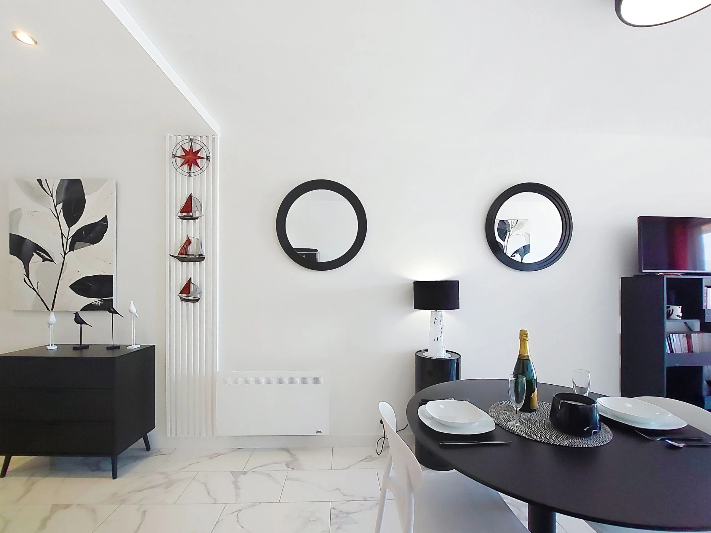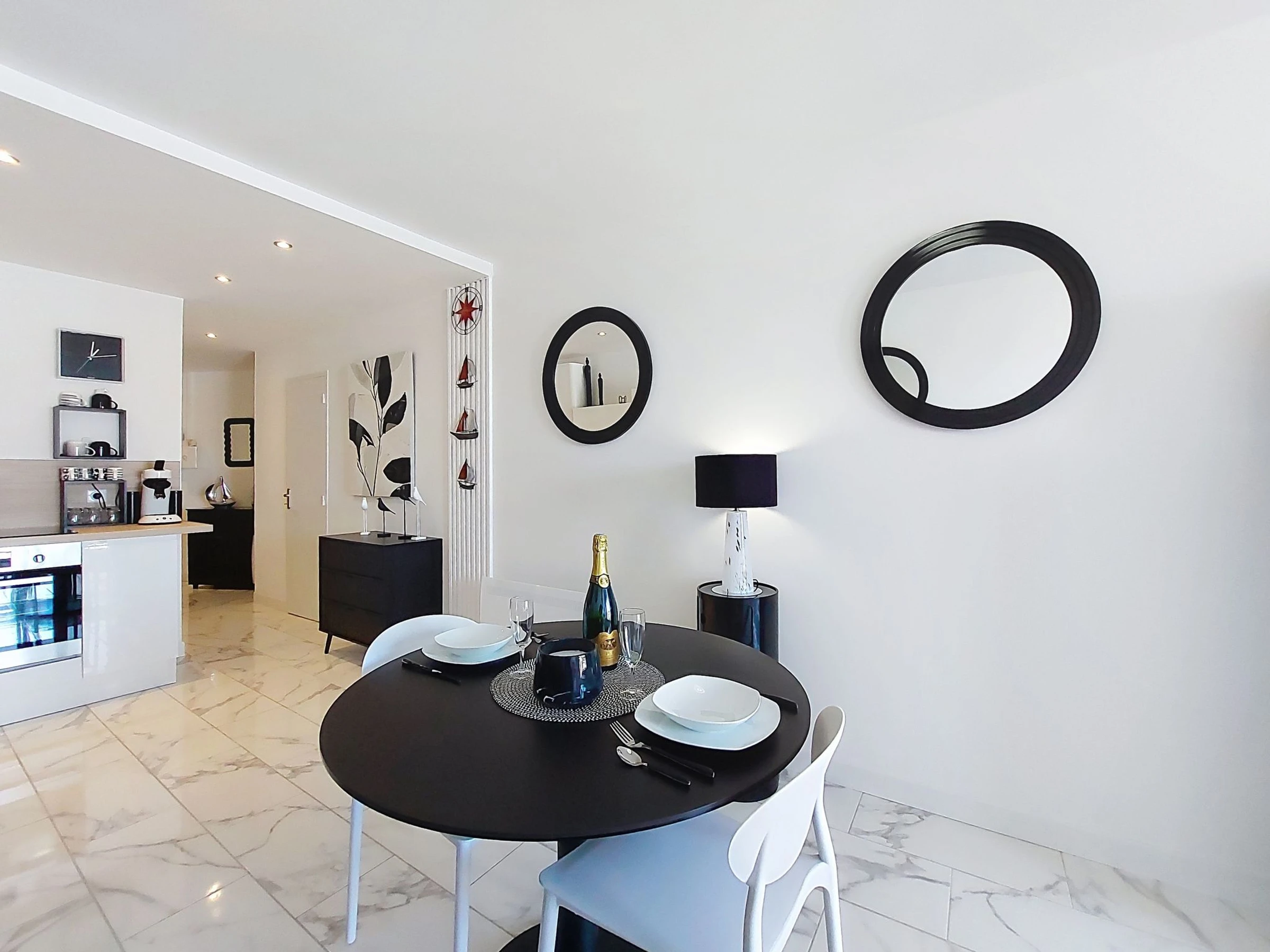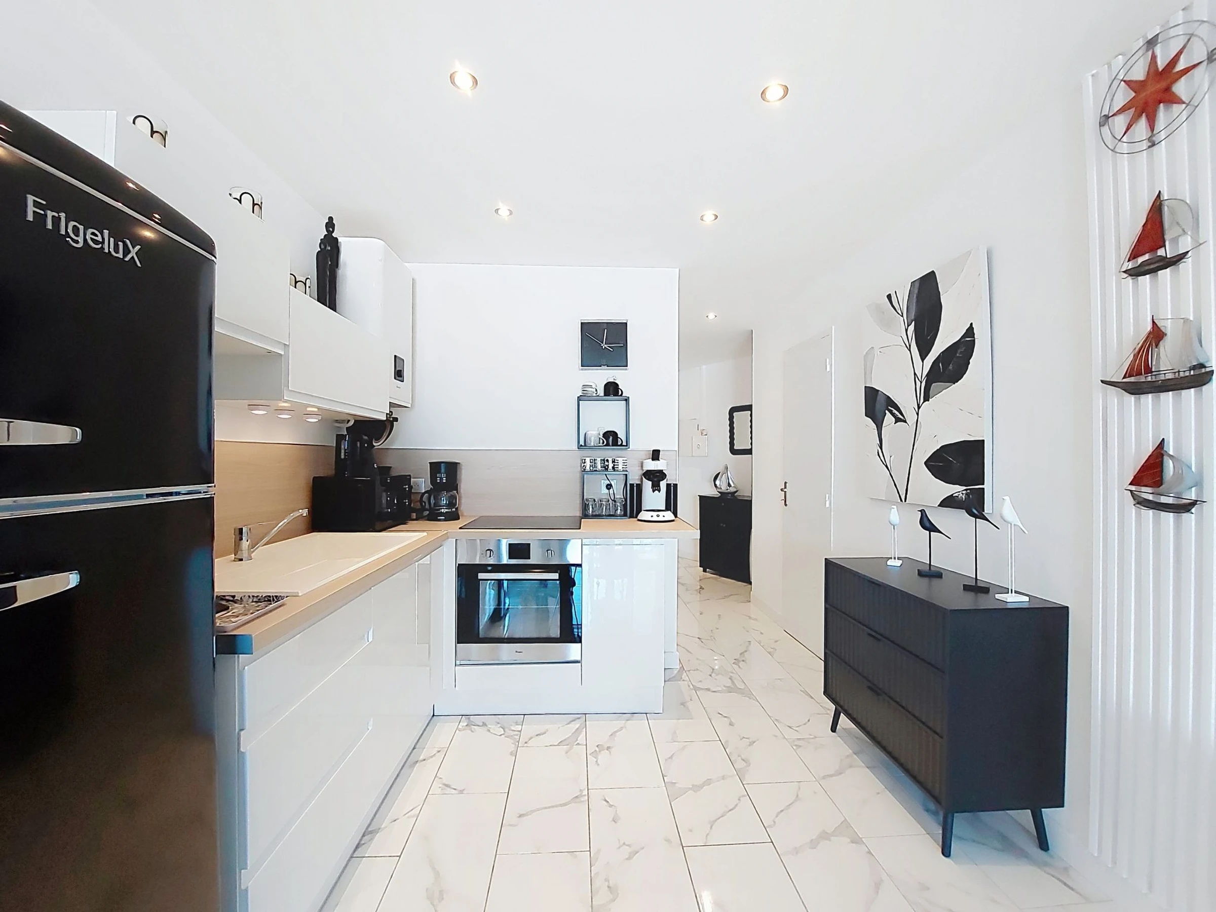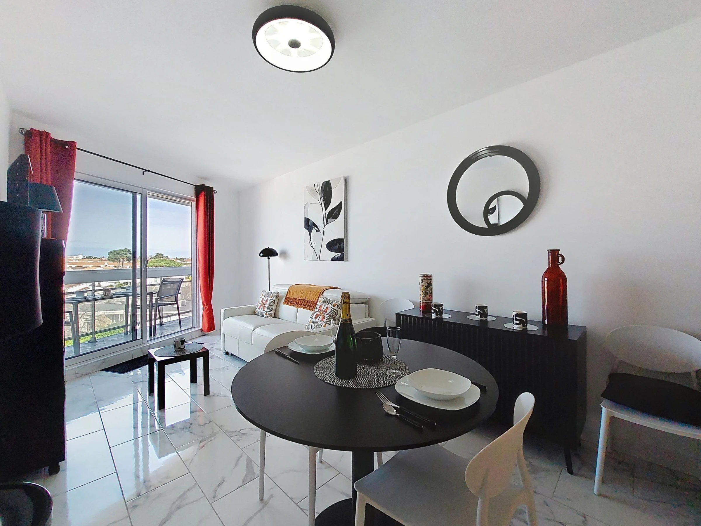 Studio 33 m2 au 4ème étage. Complètement rénové en 2025, aménagement moderne: séjour avec 1 divan-lit double (1 x 140 cm, longueur 190 cm), TV (écran plat). Sortie sur le balcon. Coin cuisine (four, 4 plaques à induction, grille-pain, bouilloire électrique, micro-ondes, congélateur, cafetière électrique, Capsules pour machine à café (Senseo) (NON INCLUSES)). Douche, WC séparé. Chauffage électrique. Balcon 7 m2. Mobilier de balcon. Vue latérale sur la mer. A disposition: lave-linge, fer à repasser. Internet (Connexion WIFI, gratuit). Place de parking No 8. Veuillez noter: détecteur de fumée. Annonce d'un particulier (art 155, IV du CGI).