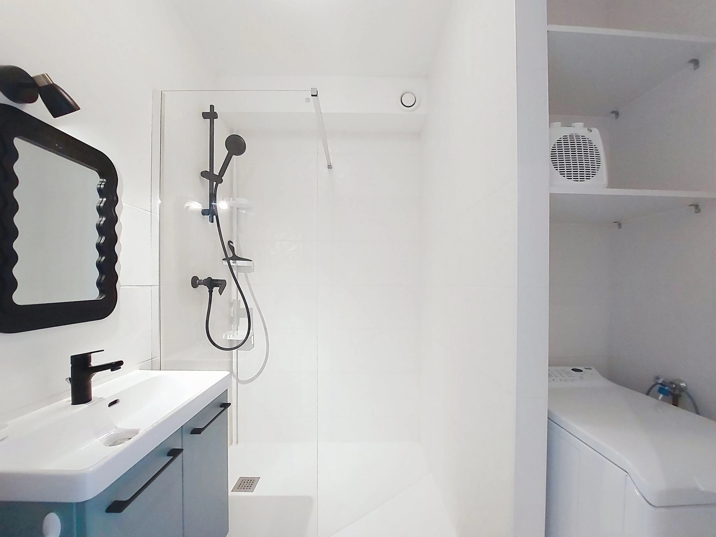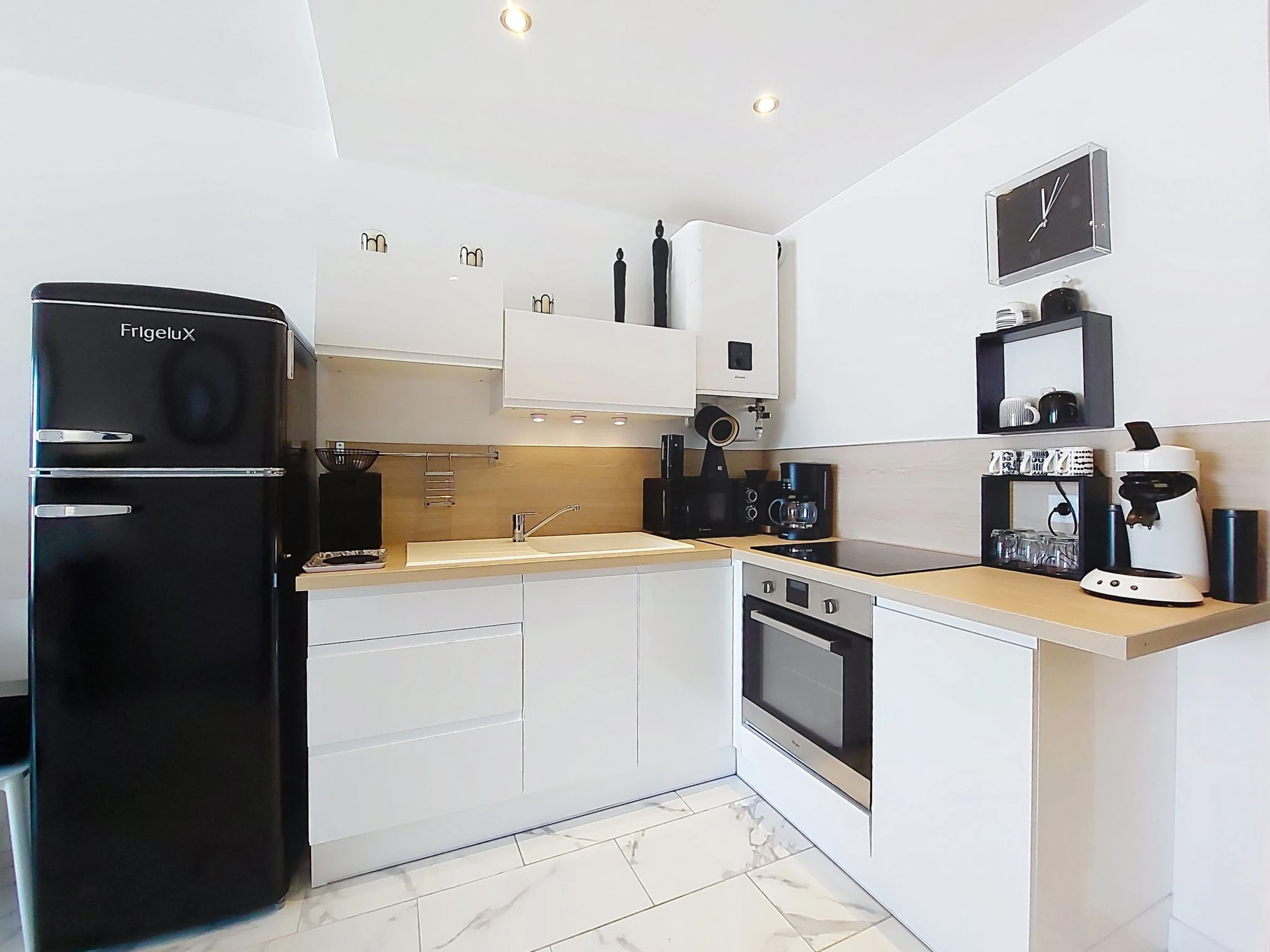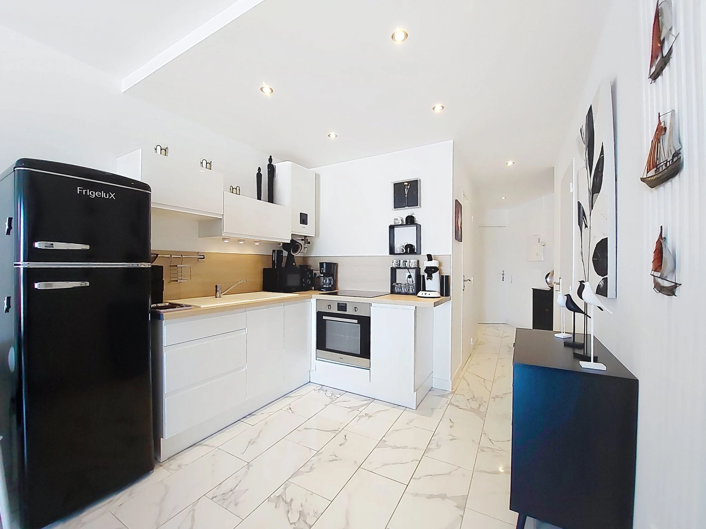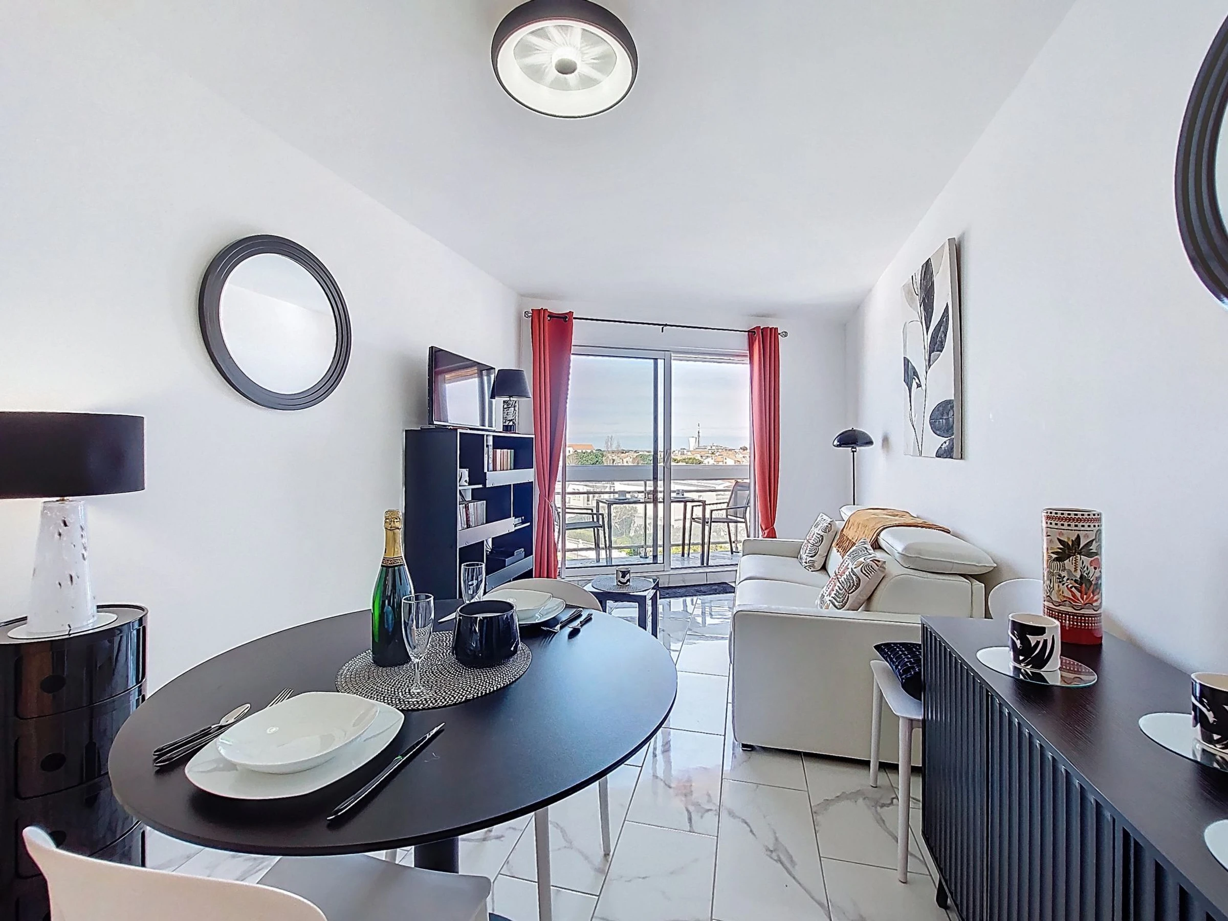Studio 33 m2 au 4ème étage. Complètement rénové en 2025, aménagement moderne: séjour avec 1 divan-lit double (1 x 140 cm, longueur 190 cm), TV (écran plat). Sortie sur le balcon. Coin cuisine (four, 4 plaques à induction, grille-pain, bouilloire électrique, micro-ondes, congélateur, cafetière électrique, Capsules pour machine à café (Senseo) (NON INCLUSES)). Douche, WC séparé. Chauffage électrique. Balcon 7 m2. Mobilier de balcon. Vue latérale sur la mer. A disposition: lave-linge, fer à repasser. Internet (Connexion WIFI, gratuit). Place de parking No 8. Veuillez noter: détecteur de fumée. Annonce d'un particulier (art 155, IV du CGI).