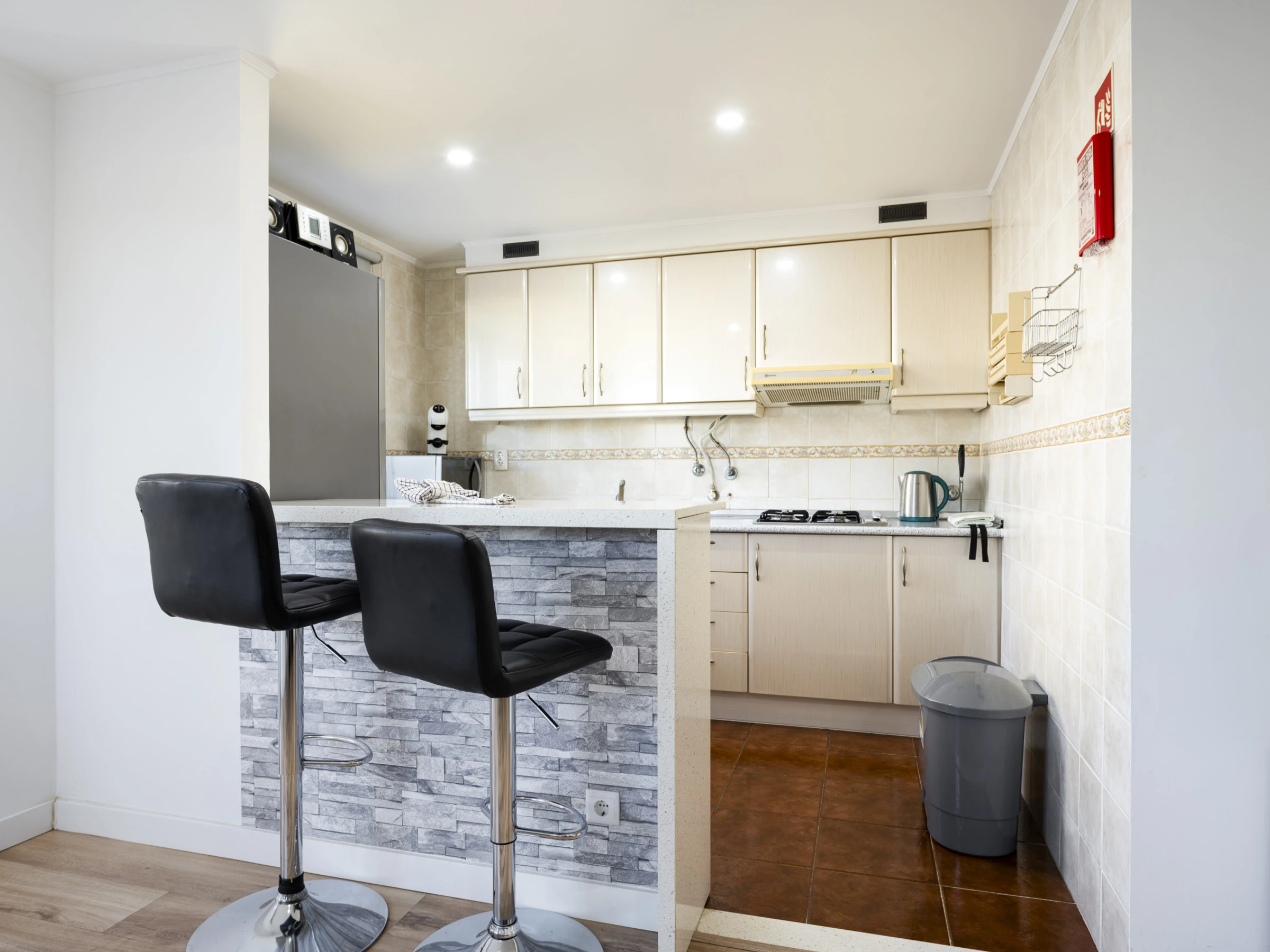 La kitchenette, au gaz, est équipée d'un réfrigérateur, d'un micro-ondes, d'un four, d'un congélateur, d'un lave-vaisselle, de vaisselle/couverts, d'ustensiles/cuisine, d'une machine à café, d'un grille-pain et d'une bouilloire électrique.