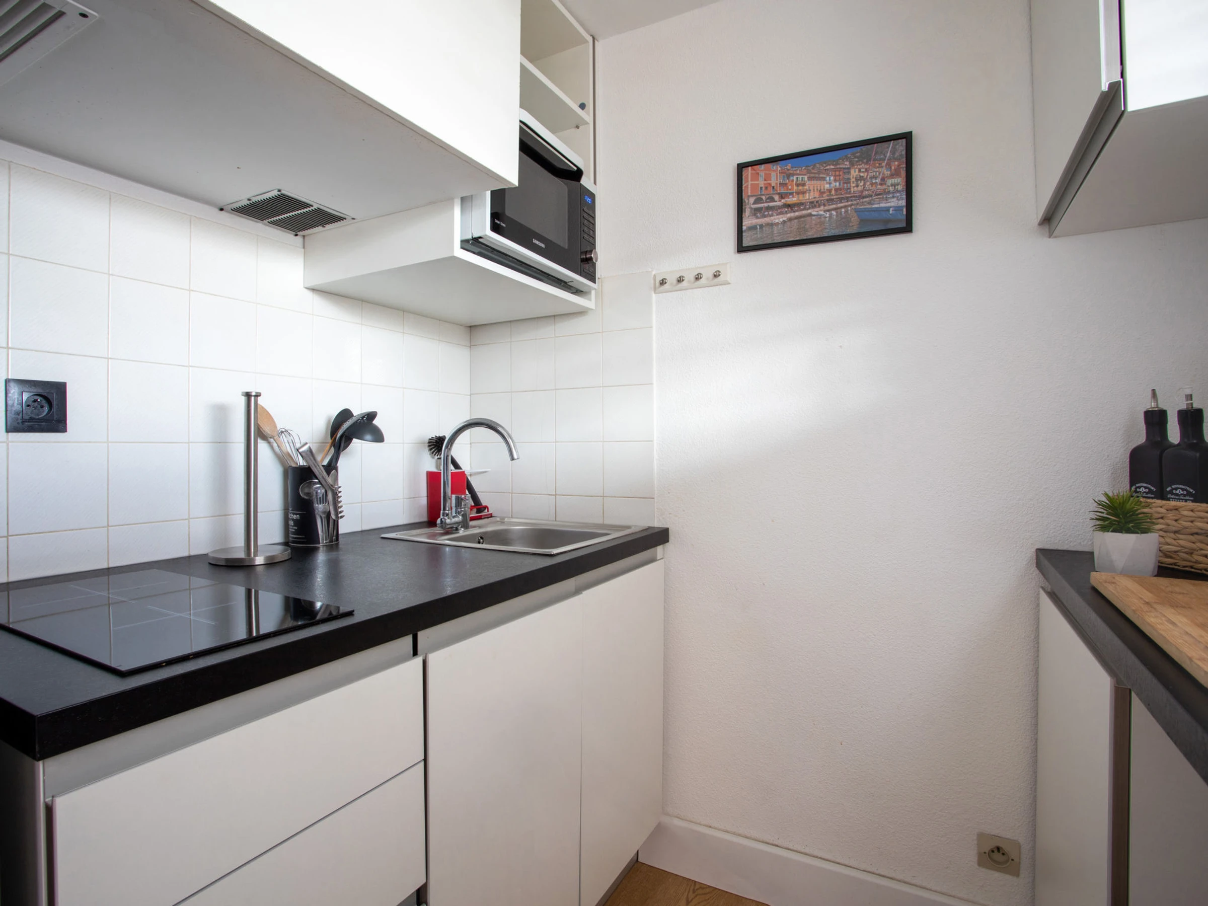 "Le Tivoli" studio 30 m2 au 1er étage. Spacieux et clair, complètement rénové en 2021, aménagement confortable et agréable: séjour avec baie vitrée avec 1 divan-lit (140 cm, longueur 190 cm), 1 divan-lit double (160 cm, longueur 200 cm), TV (écran plat), air-conditionné. Sortie sur la terrasse. Cuisine ouverte (lave-vaisselle, 2 plaques à induction, grille-pain, bouilloire électrique, congélateur, cafetière électrique). Sortie sur la terrasse. Bain/WC. Chauffage, air-conditionné. Sol en parquet. Grande terrasse 12 m2. Meubles de terrasse. A disposition: lave-linge, fer à repasser, lit bébé, sèche-cheveux. Internet (Connexion WIFI, gratuit). Place de parking (cloturée, 1 Voiture). Veuillez noter: logement non-fumeur. Détecteur de fumée. [hidden]