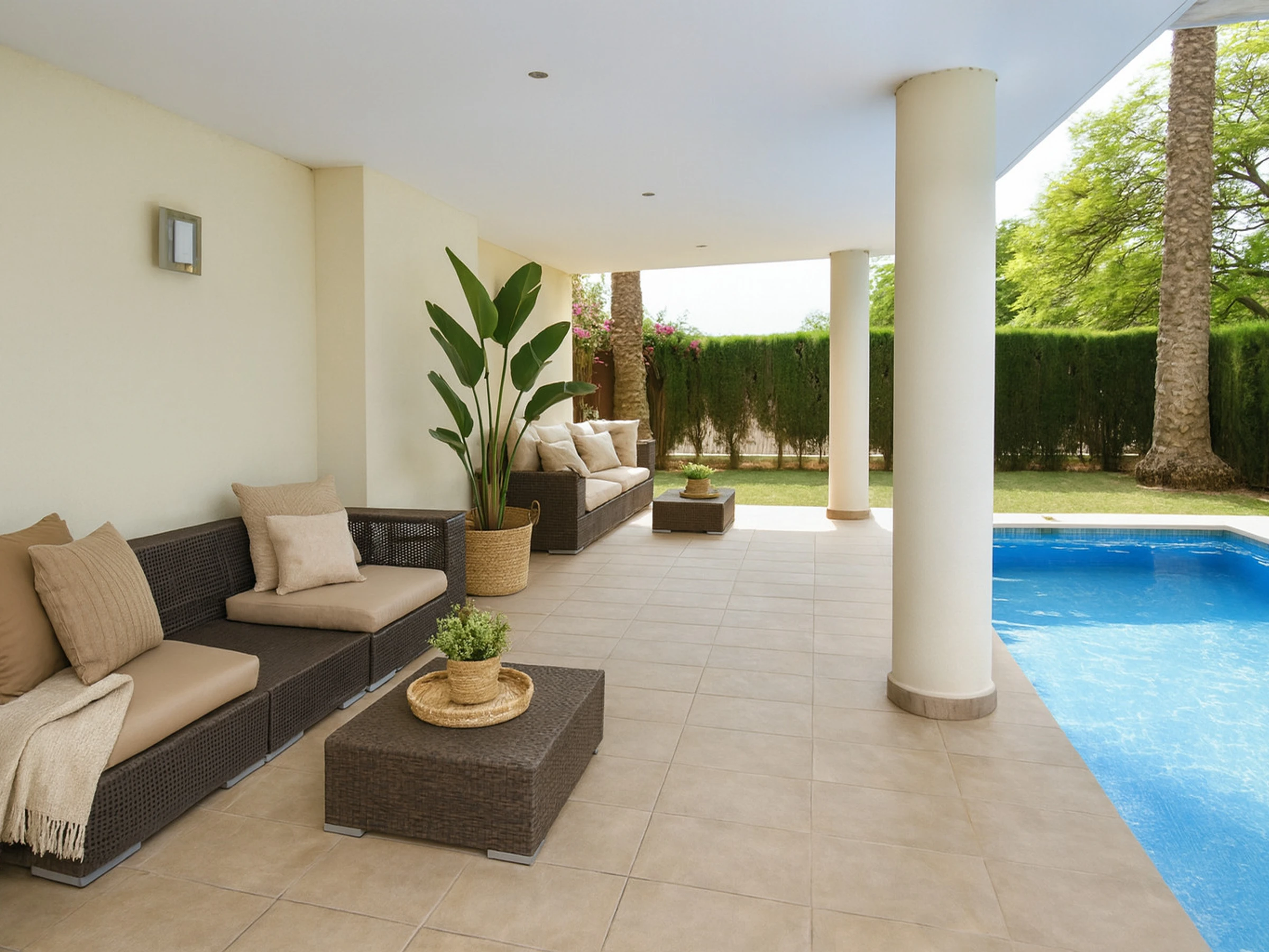 Terrasse couverte à côté de la piscine avec des bancs en osier pour se détendre à l'ombre
