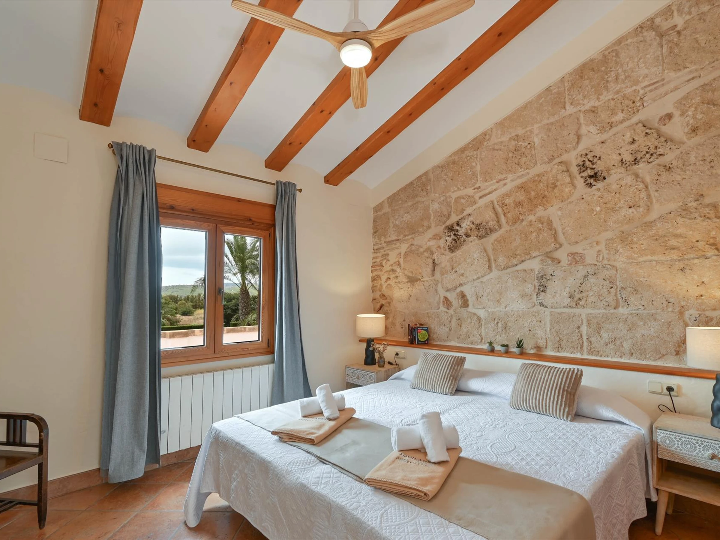 * chambre avec lit queen-size (mesurant 200 x 160 cm) et ventilateur