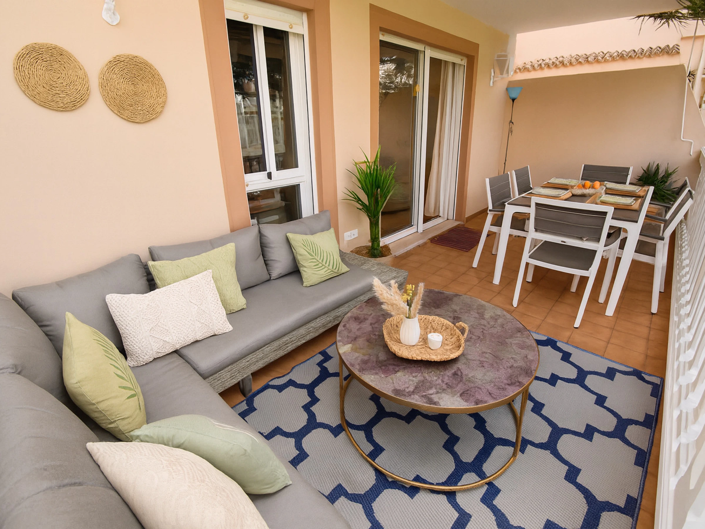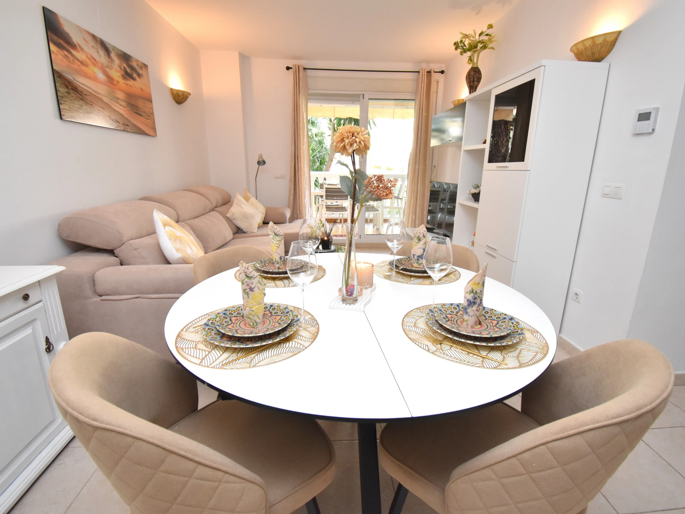 Le salon-salle à manger est décoré dans un style moderne et lumineux, et dispose d'un grand canapé, d'une table à manger, d'un téléviseur à écran plat, de la climatisation, de stores automatiques et de portes coulissantes donnant accès à la terrasse privée.